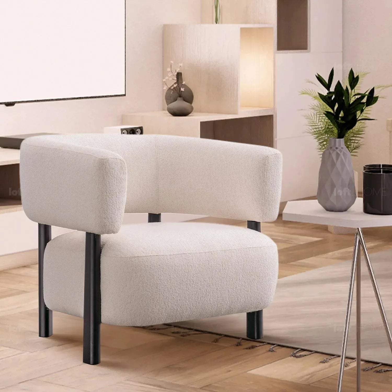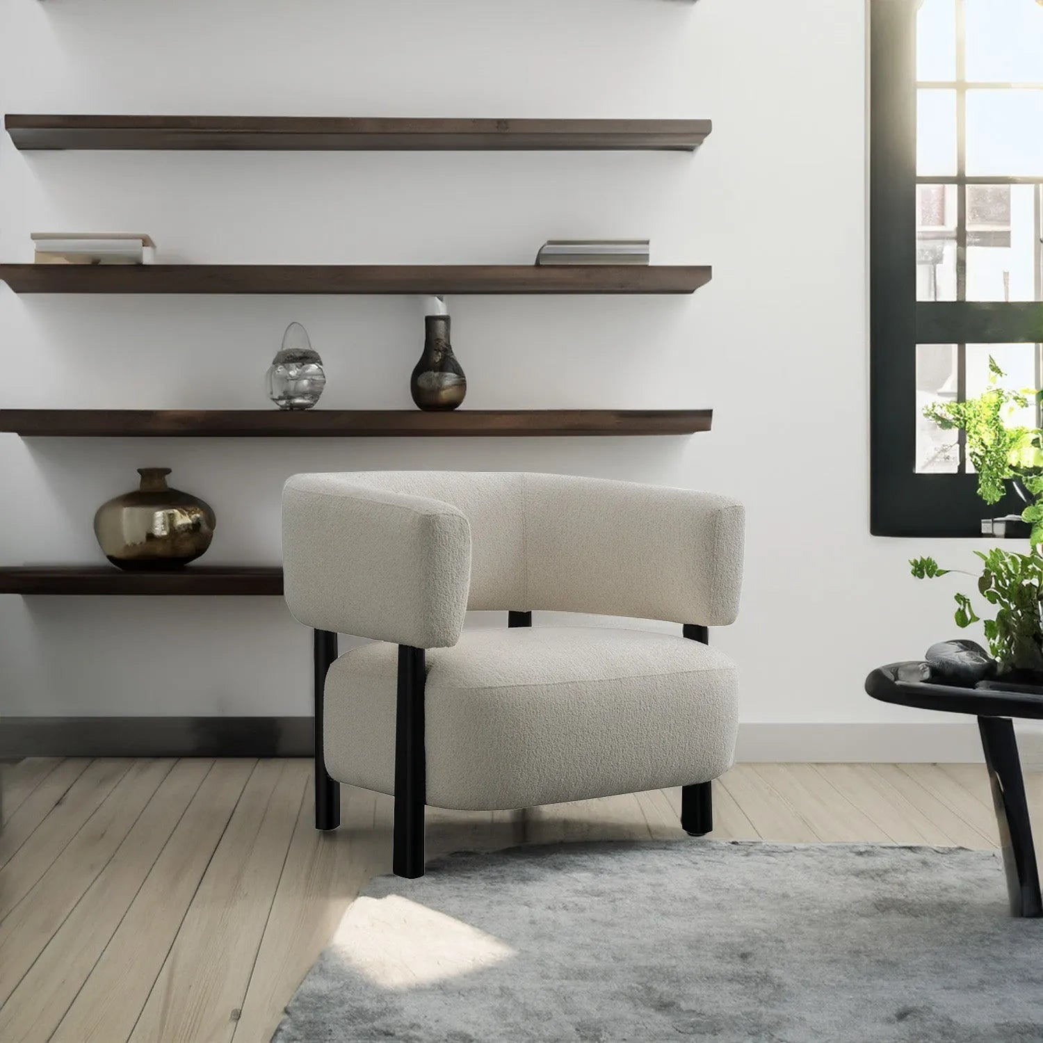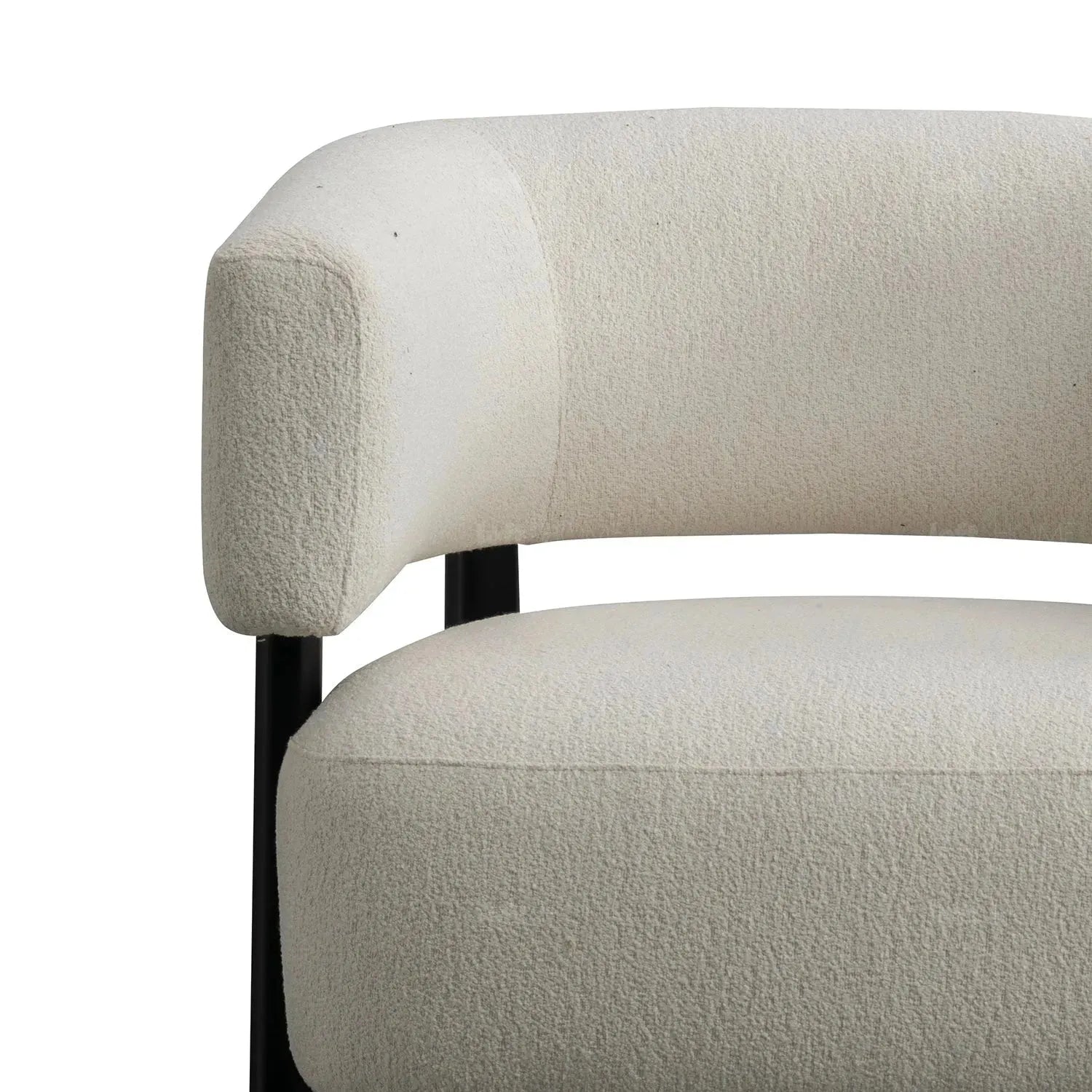 The neutral White Boucle Fabric and Black steel legs create a timeless color combination, suitable for blending seamlessly into various interior styles, from contemporary to traditional settings. |