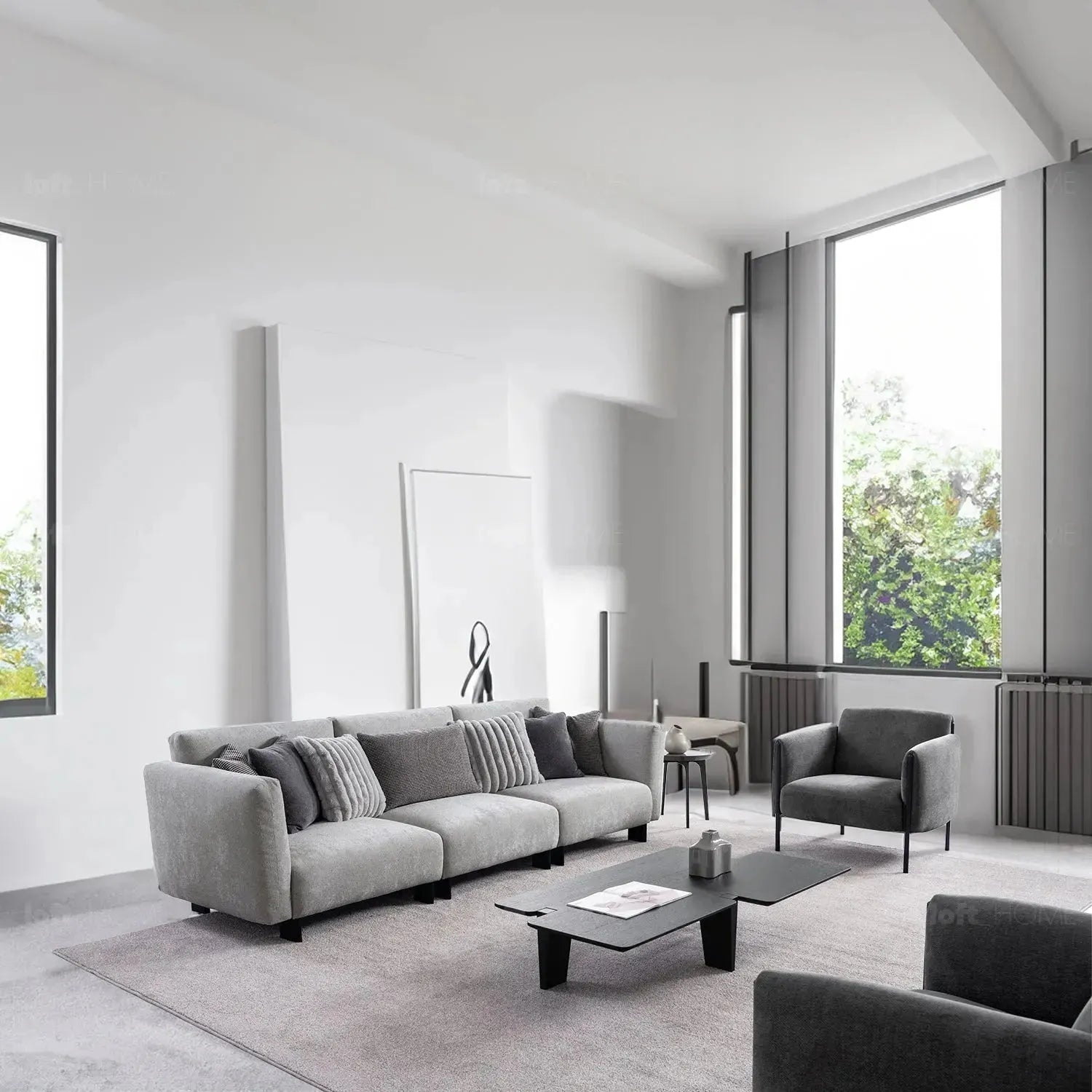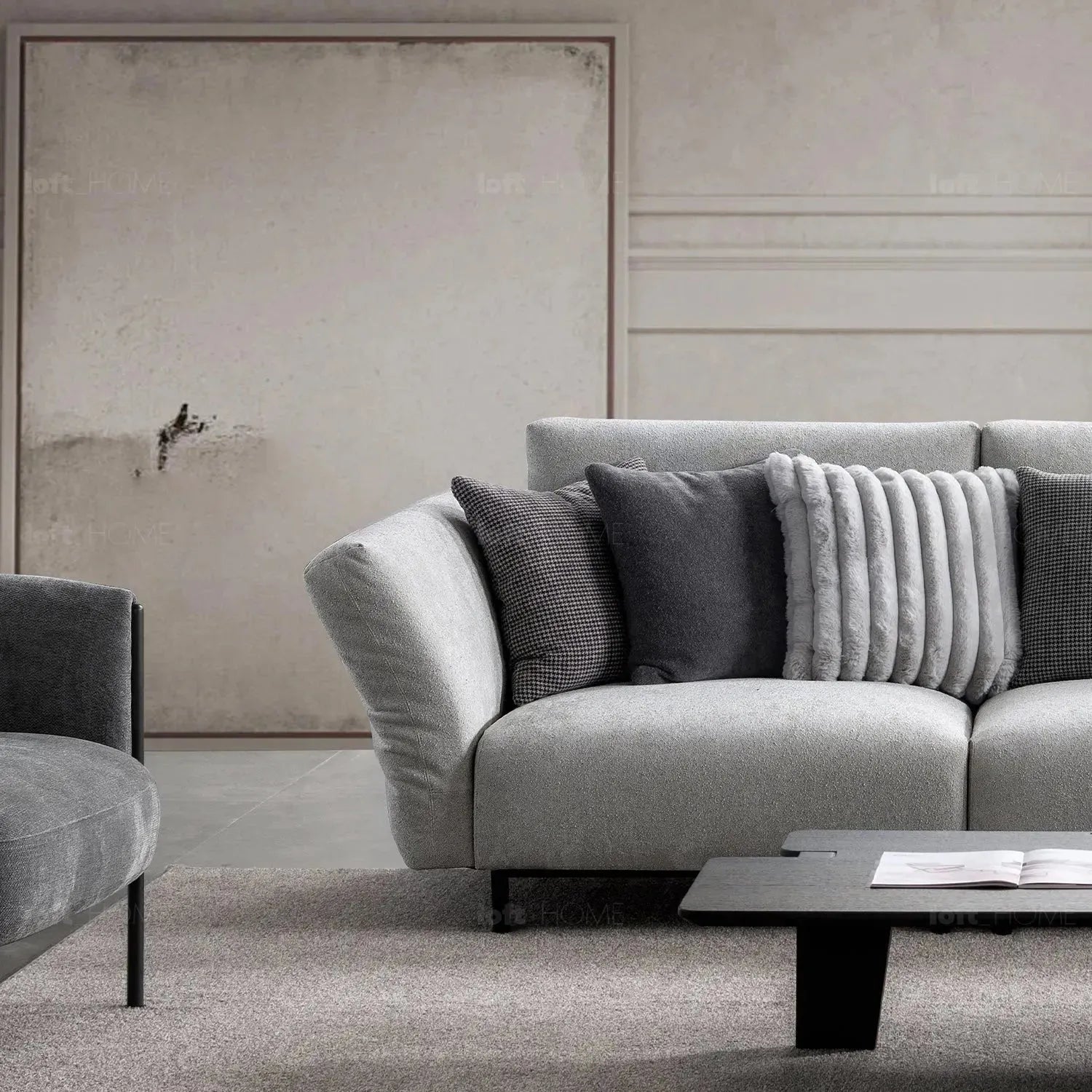 Introducing the Minimalist Boucle Fabric Bendable Armrest 4 Seater Sofa PRISTINE a contemporary masterpiece designed with premium materials and luxurious upholstery, offering unparalleled comfort with its superior suspension system and spacious seating configuration. Enjoy the perfect blend of style and coziness, making every seating experience an absolute delight!