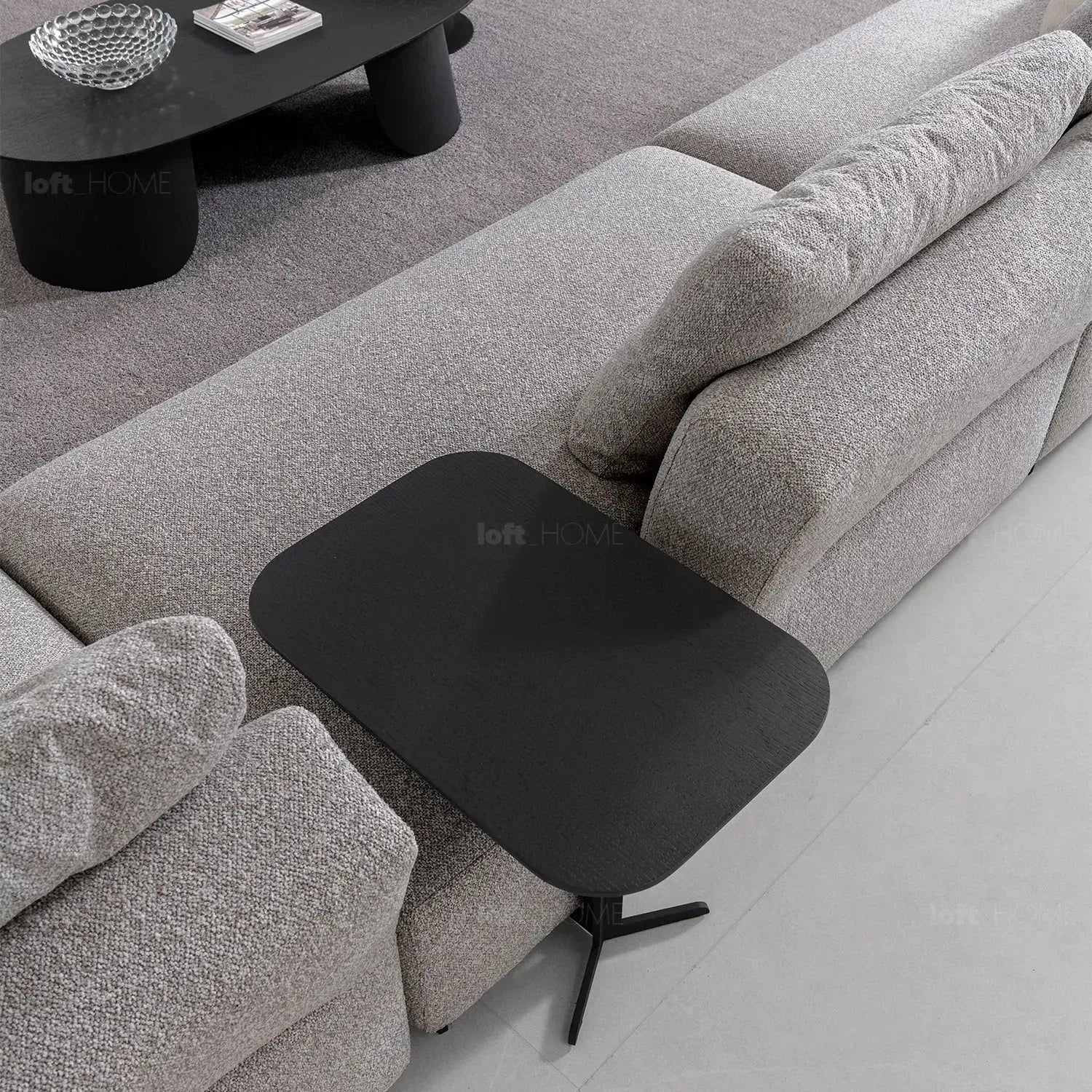 The sofa stands on Solid Pine Wood legs with a black finish, combining elegance with durability. These legs provide stable support and complement the light-gray fabric upholstery, adding a touch of refined contrast to the sofa’s design.
