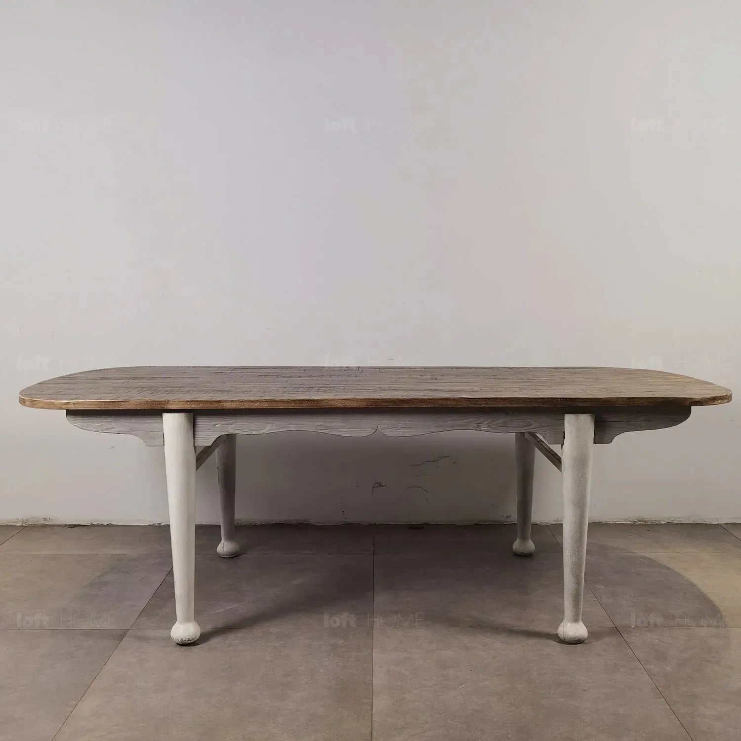 The table legs are elegantly painted in white, providing a fresh and clean contrast to the natural wood tabletop, enhancing the table's sophisticated retro aesthetic. |