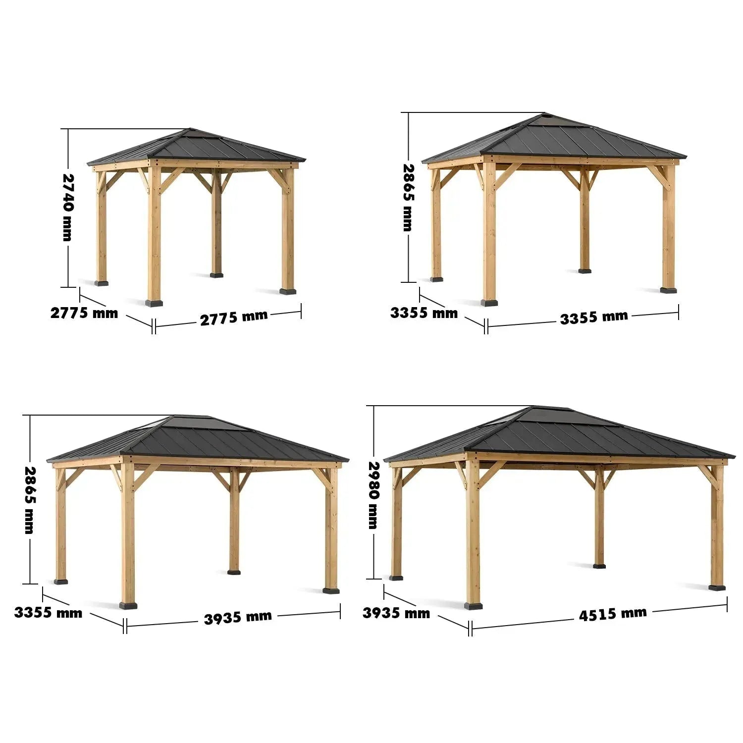 The Minimalist Outdoor Gazebo is adaptable to a variety of outdoor spaces and comes in multiple dimensions: L2775 x W2775 x H2740mm, L3355 x W3355 x H2865mm, L3935 x W3355 x H2865mm, and L4515 x W3935 x H2980mm. This simple gazebo matches up your surroundings either you have a lavish backyard or just an average-sized garden.