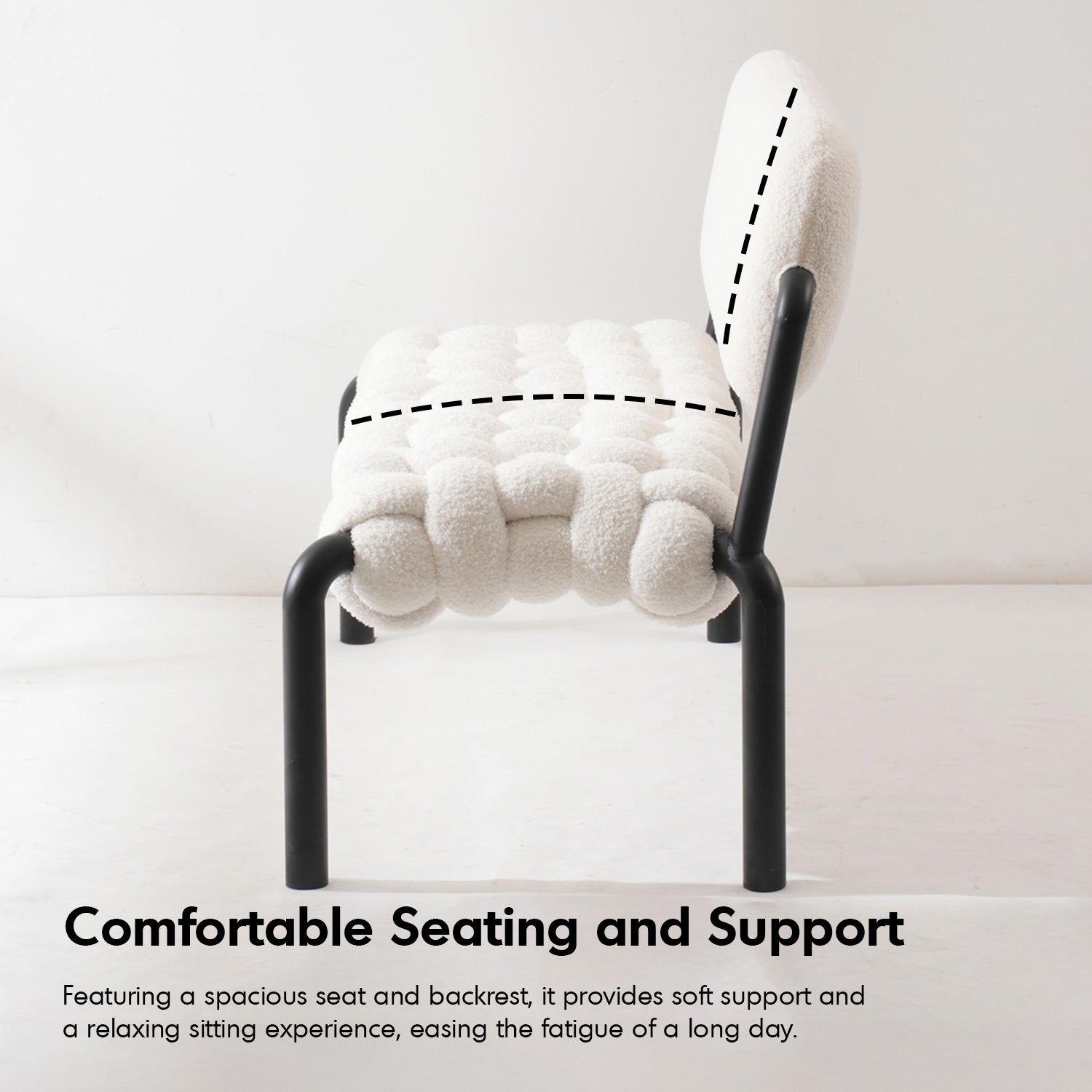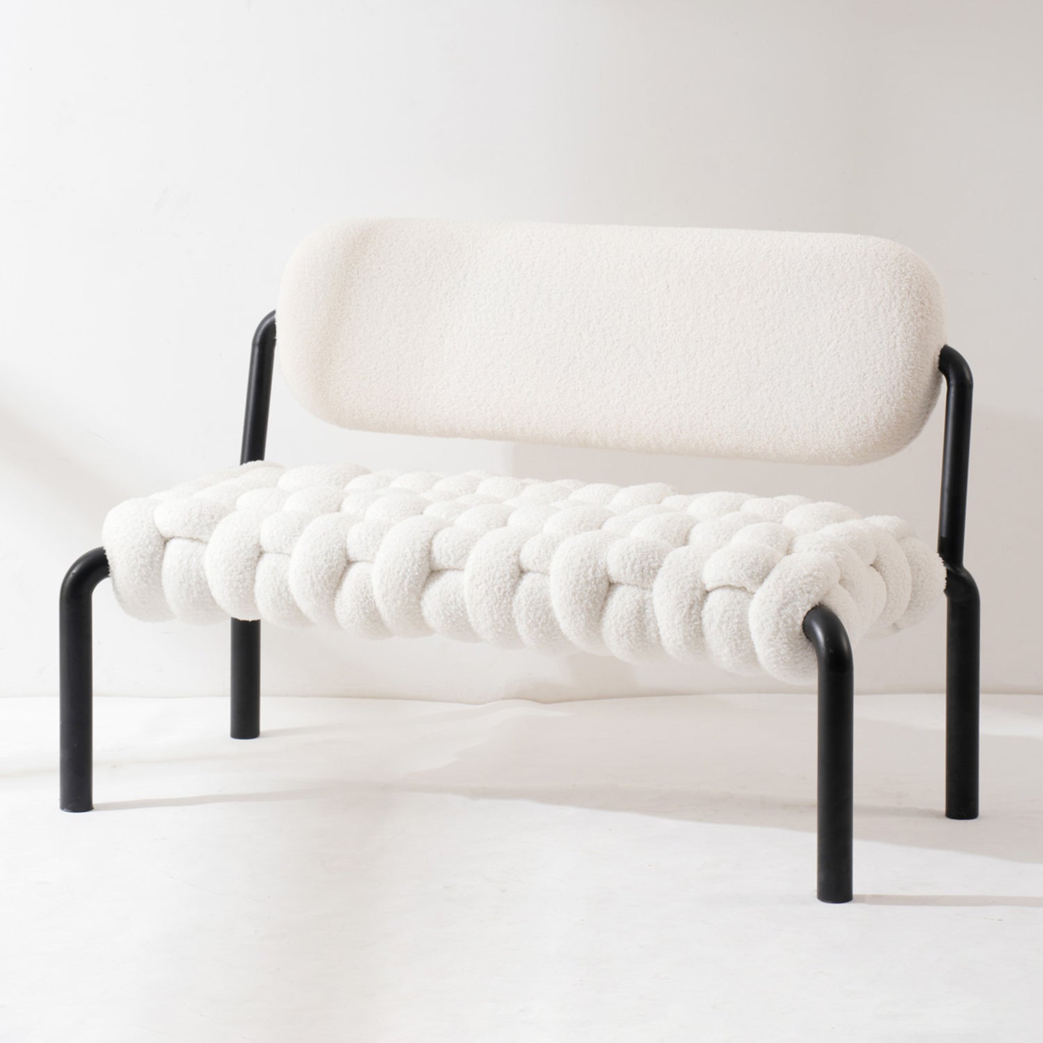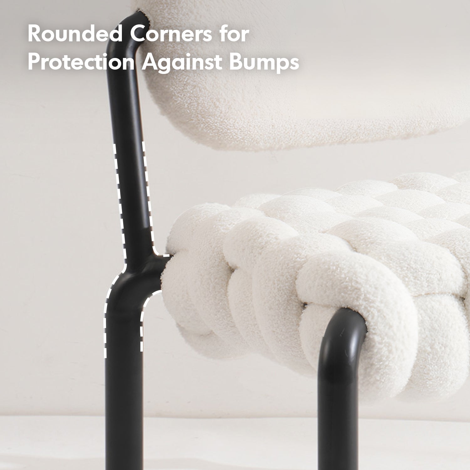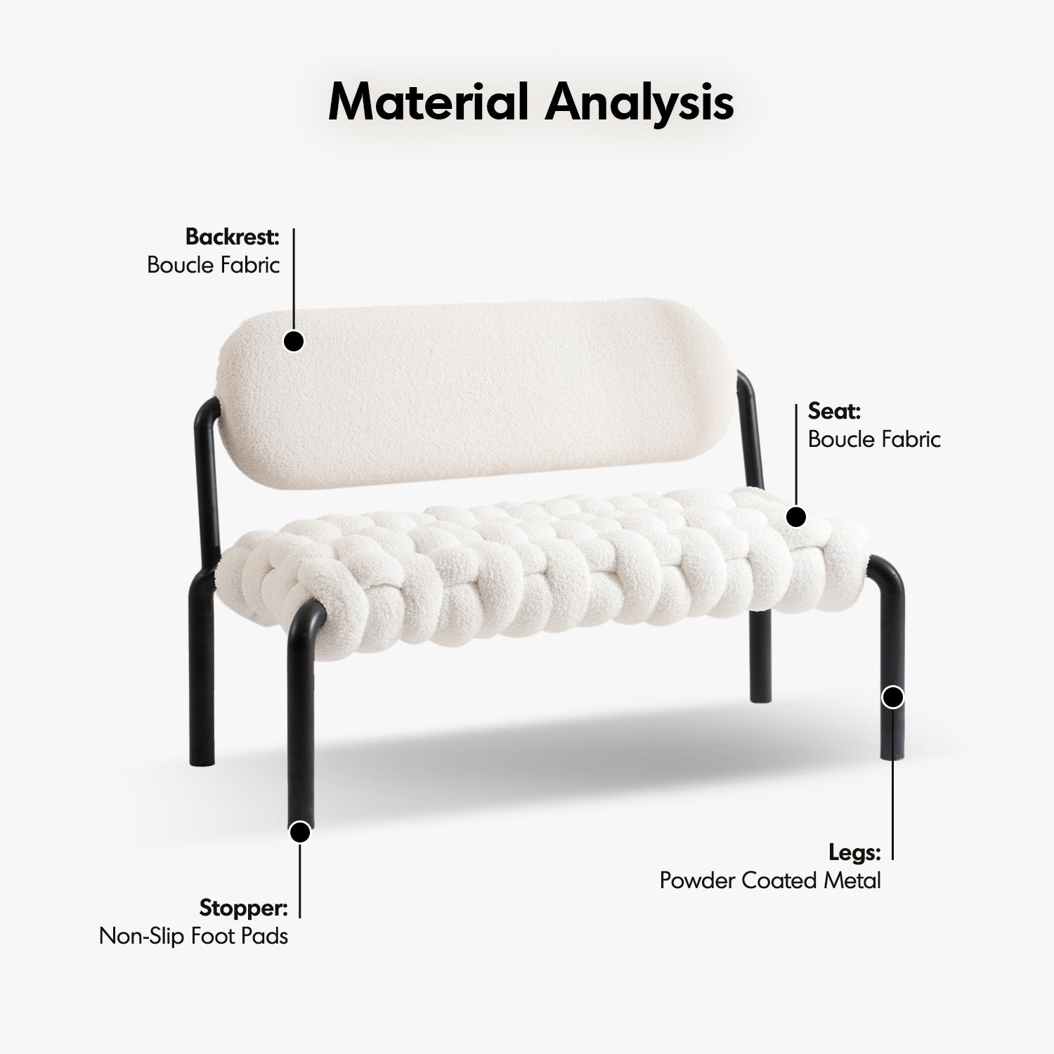 The Cream Boucle Fabric Dining Bench SOUFFLE combines luxurious texture with exceptional comfort. It features handwoven boucle fabric and high-density foam filling and offers a soft yet supportive seating experience. Its powder-coated metal frame ensures superior durability and stability, while the ergonomic design provides optimal comfort for long sittings. Perfect for both modern and classic interiors, this bench adds a sophisticated touch to any dining or living space. Elegant, resilient, and timeless - SOUFFLE is built to im