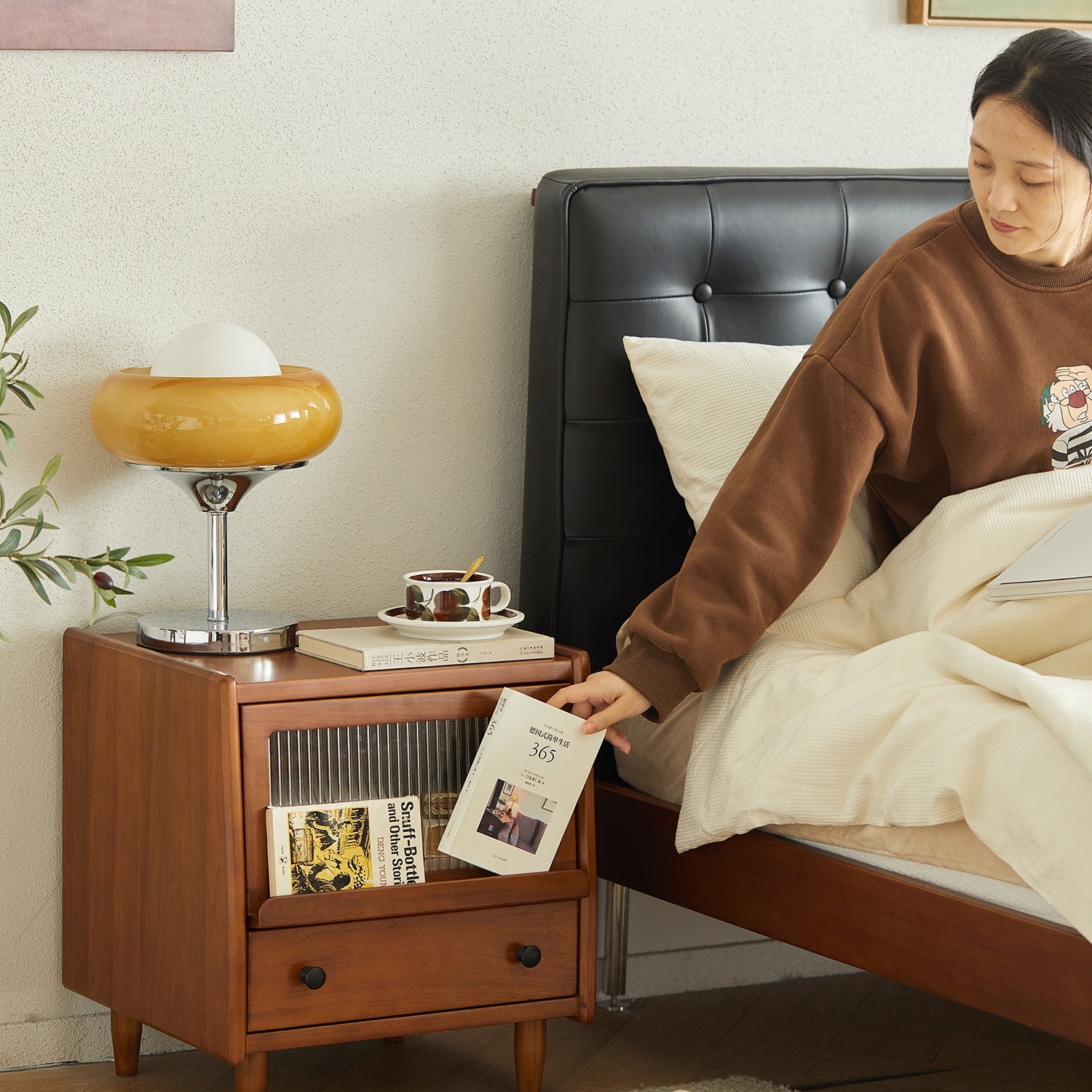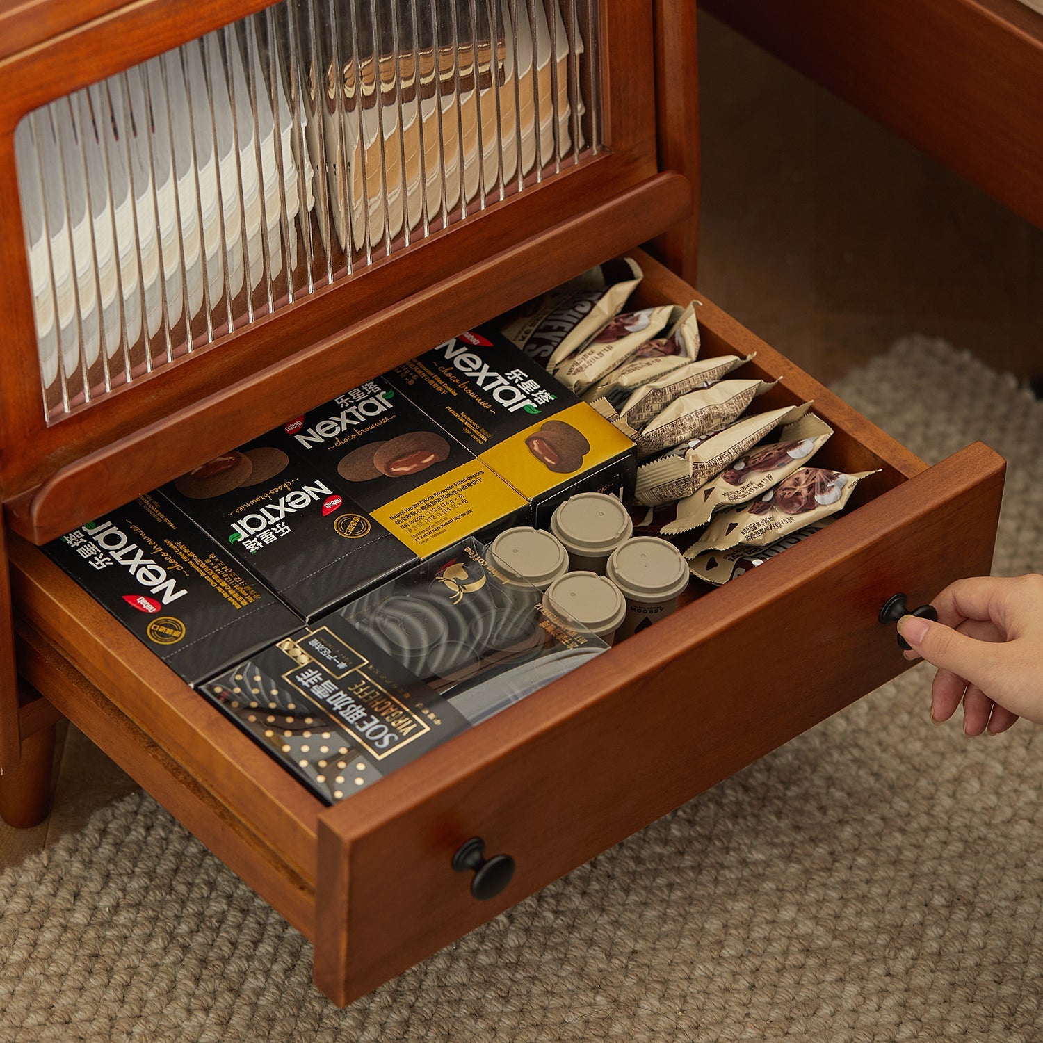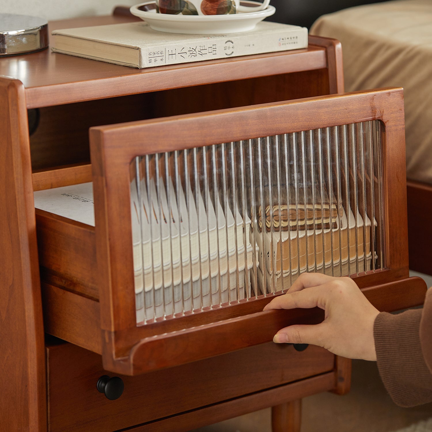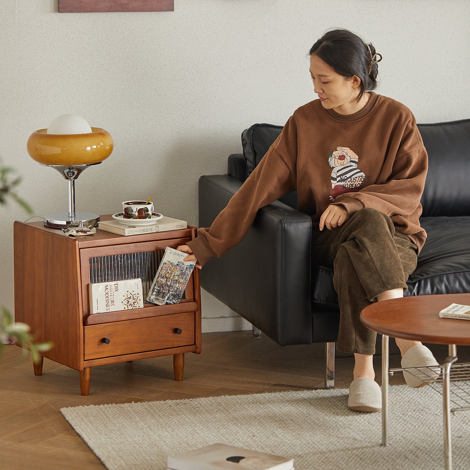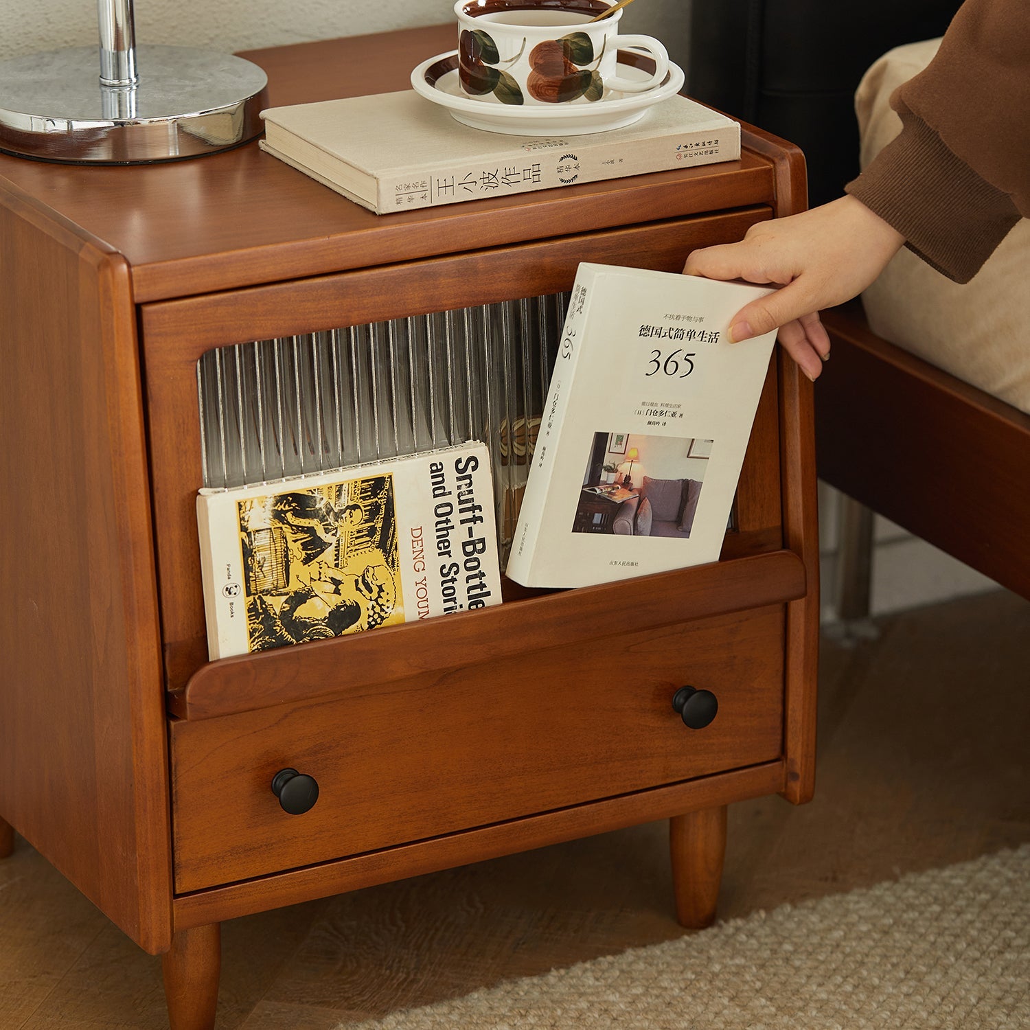 Vintage Boxwood Side Table CUCKOO shines with boxwood craftsmanship, a storage drawer, and a fluted glass design, making your space warm, elevated, and stylish.