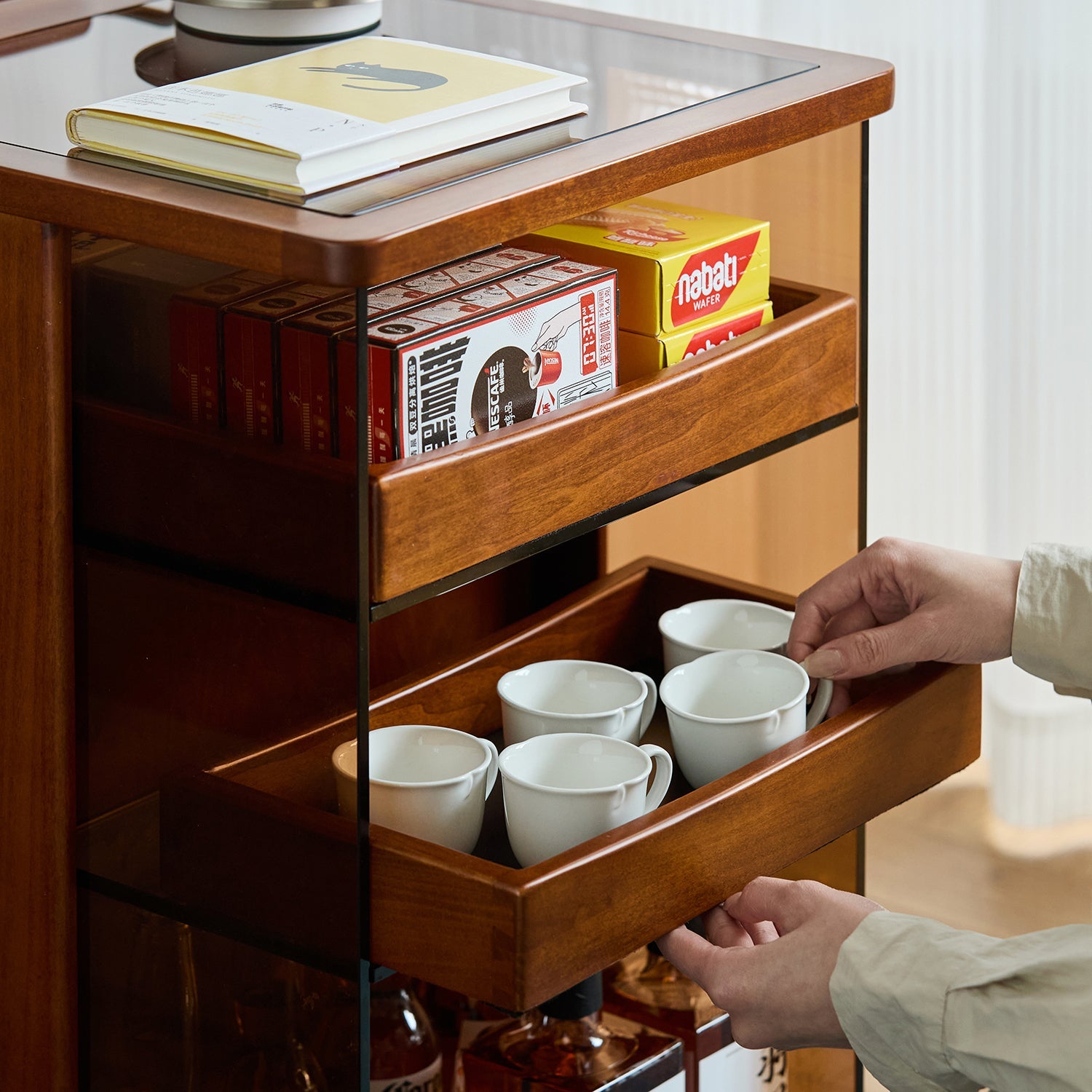 Experience the charm of the versatile and stylish Vintage Boxwood Wheeled Trolley Side Table MOONRISE, bringing warm storage and easy movement to any home.