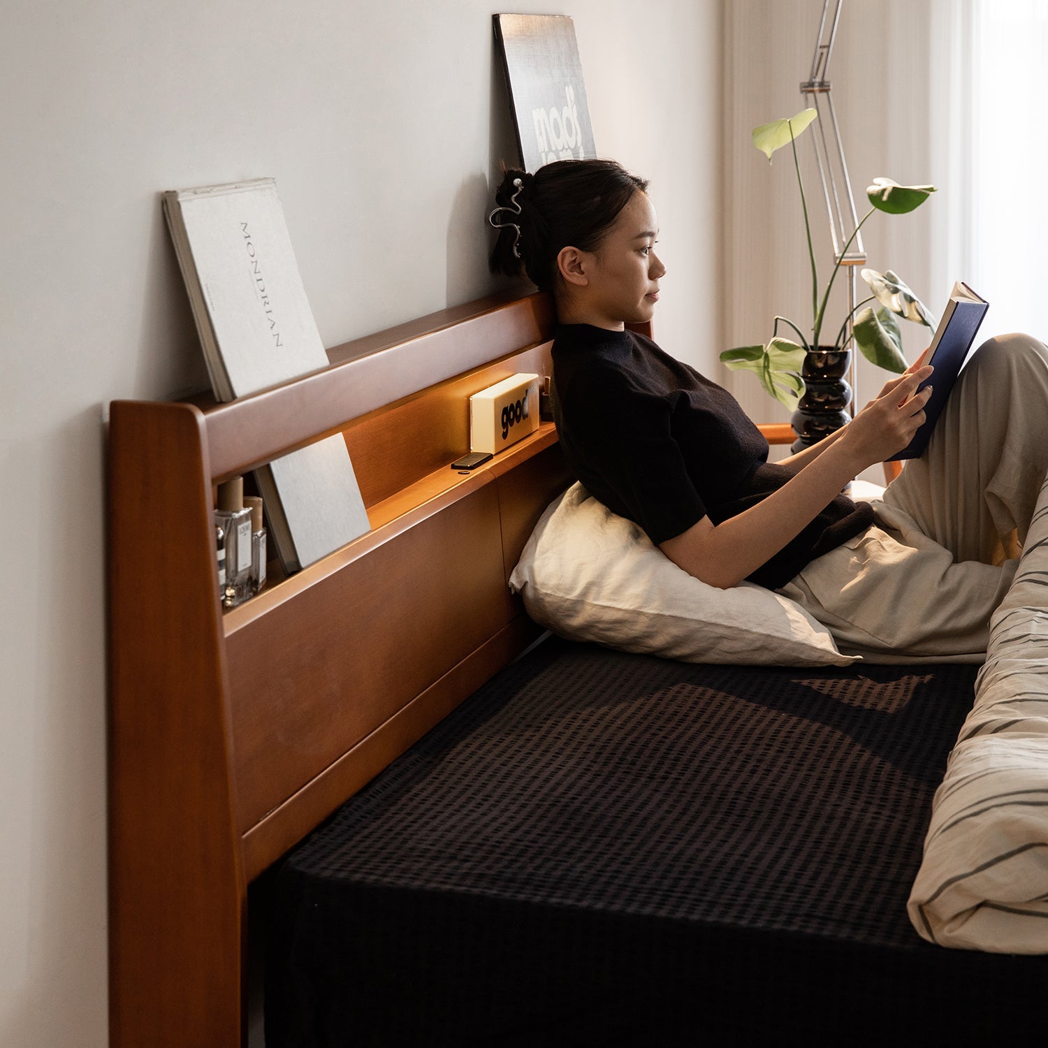 Thoughtfully designed headboard and frame for optimal support while sitting or reading |