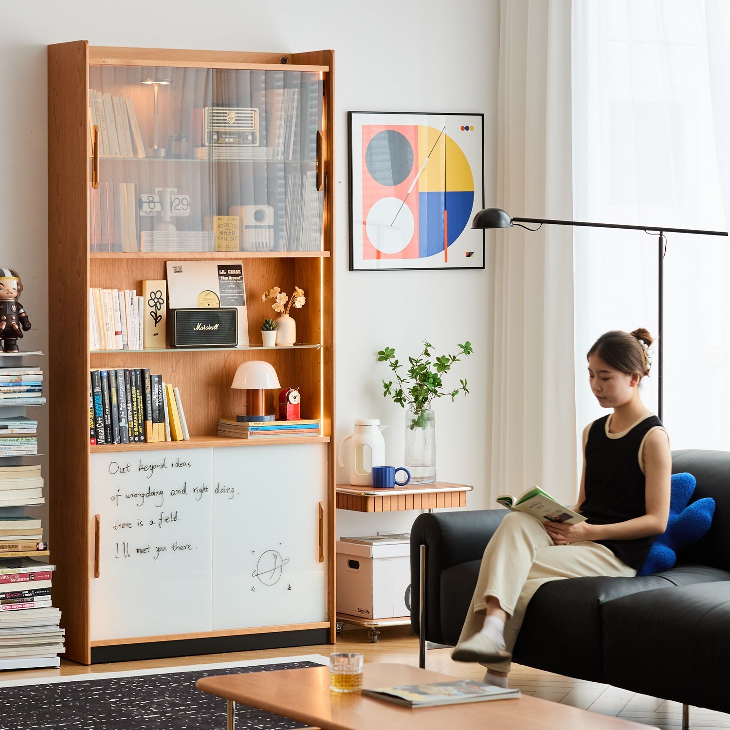 Scandinavian Cherry Wood Bookshelf Display Cabinet TIMELESS features tall glass doors, LED lighting, and modular shelving—perfect for stylish storage and display.