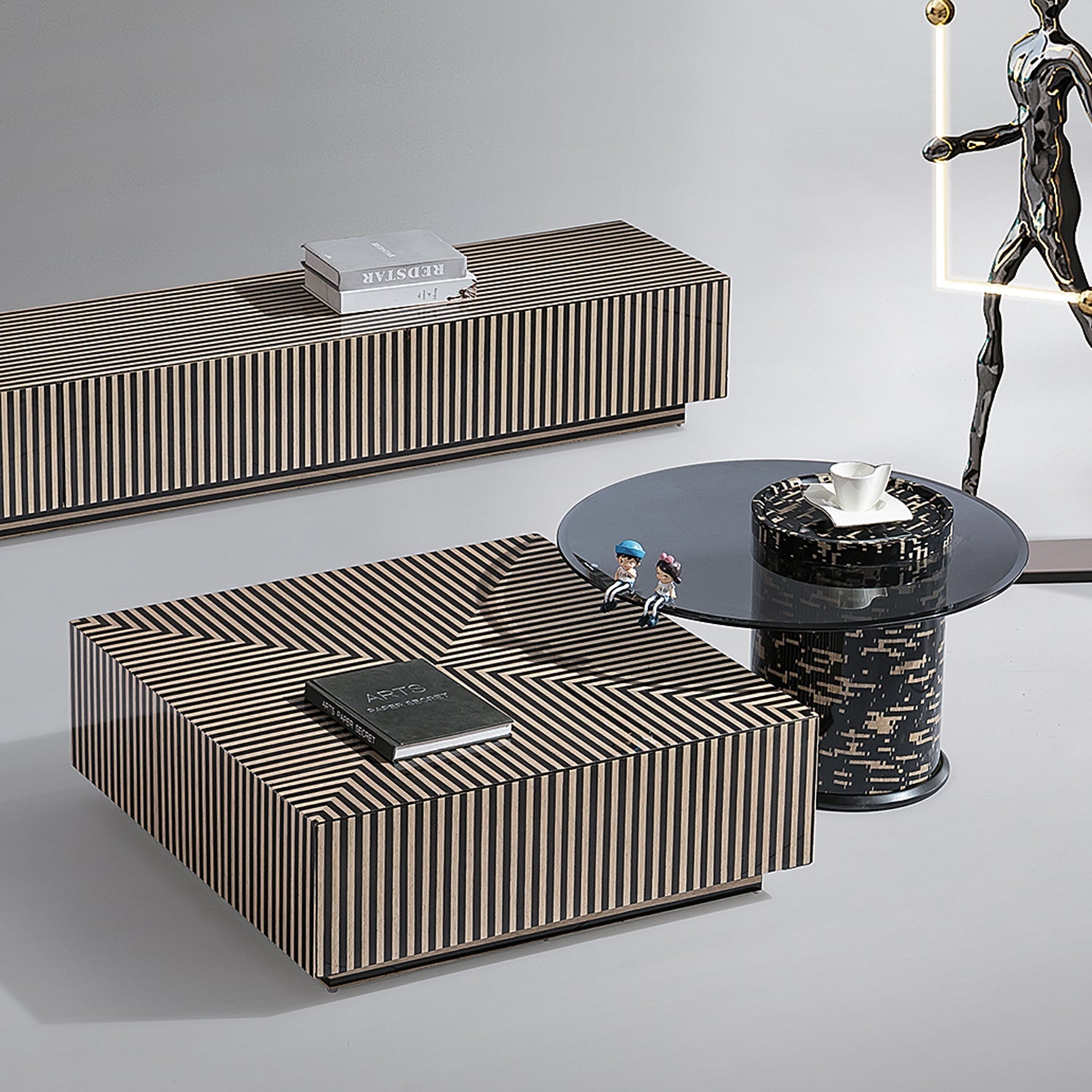 The STRIPE Coffee Table Set features a sophisticated combination of black tempered glass and bold stripe accents, making it a stylish centerpiece for any modern living room. |