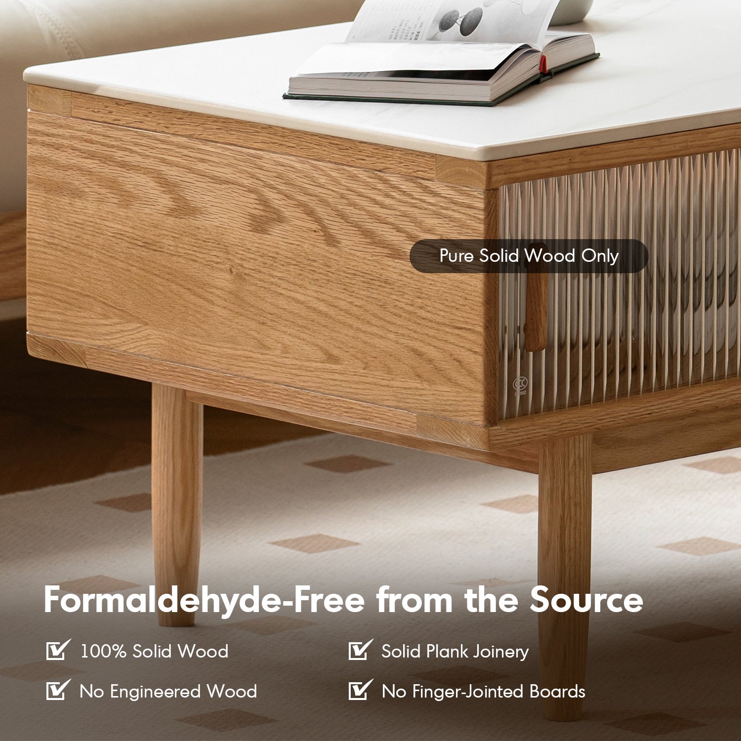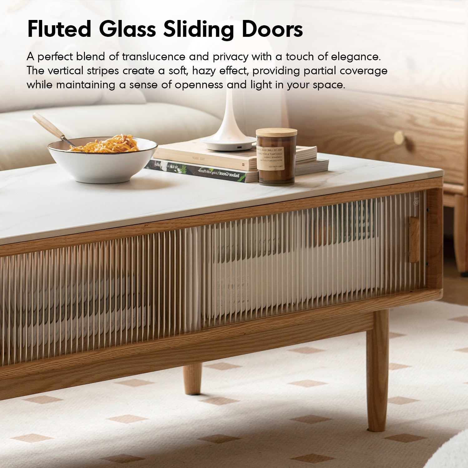 The Scandinavian Oak Wood Moru Glass Coffee Table VISTA combines timeless design and modern functionality. With a durable sintered stone top, fluted glass sliding doors, and premium FAS-grade oak, it delivers elegance, practicality, and lasting quality for your living space.