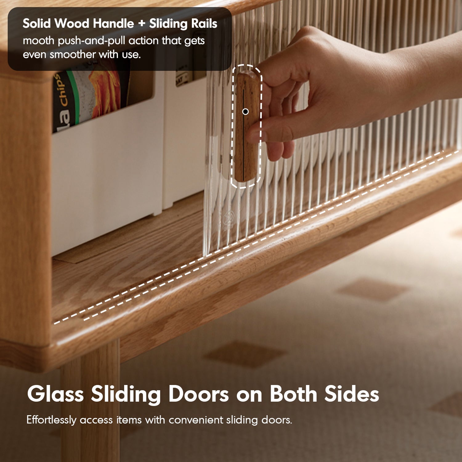 Glass sliding doors with solid wood handles and smooth rails provide seamless access, improving with each use. |