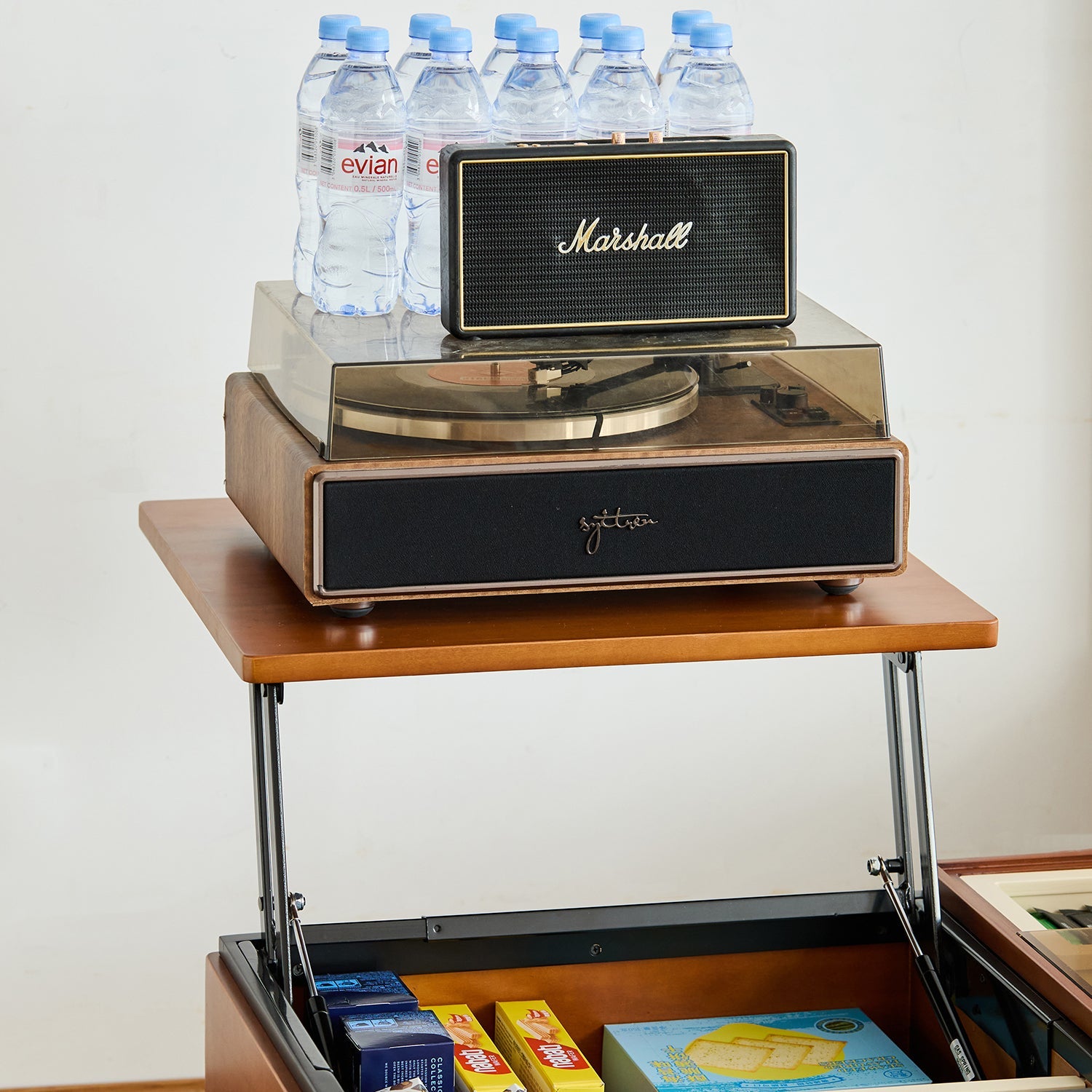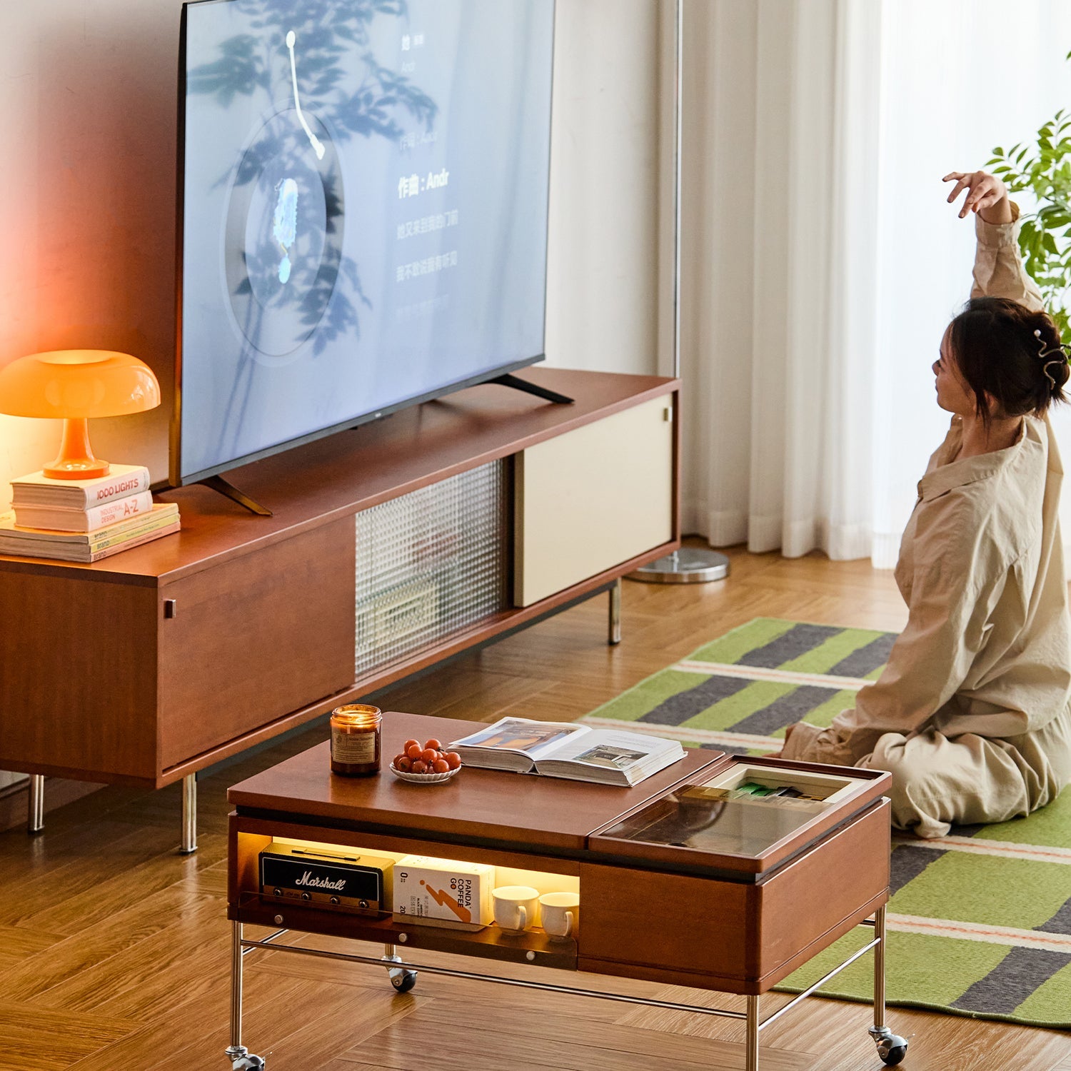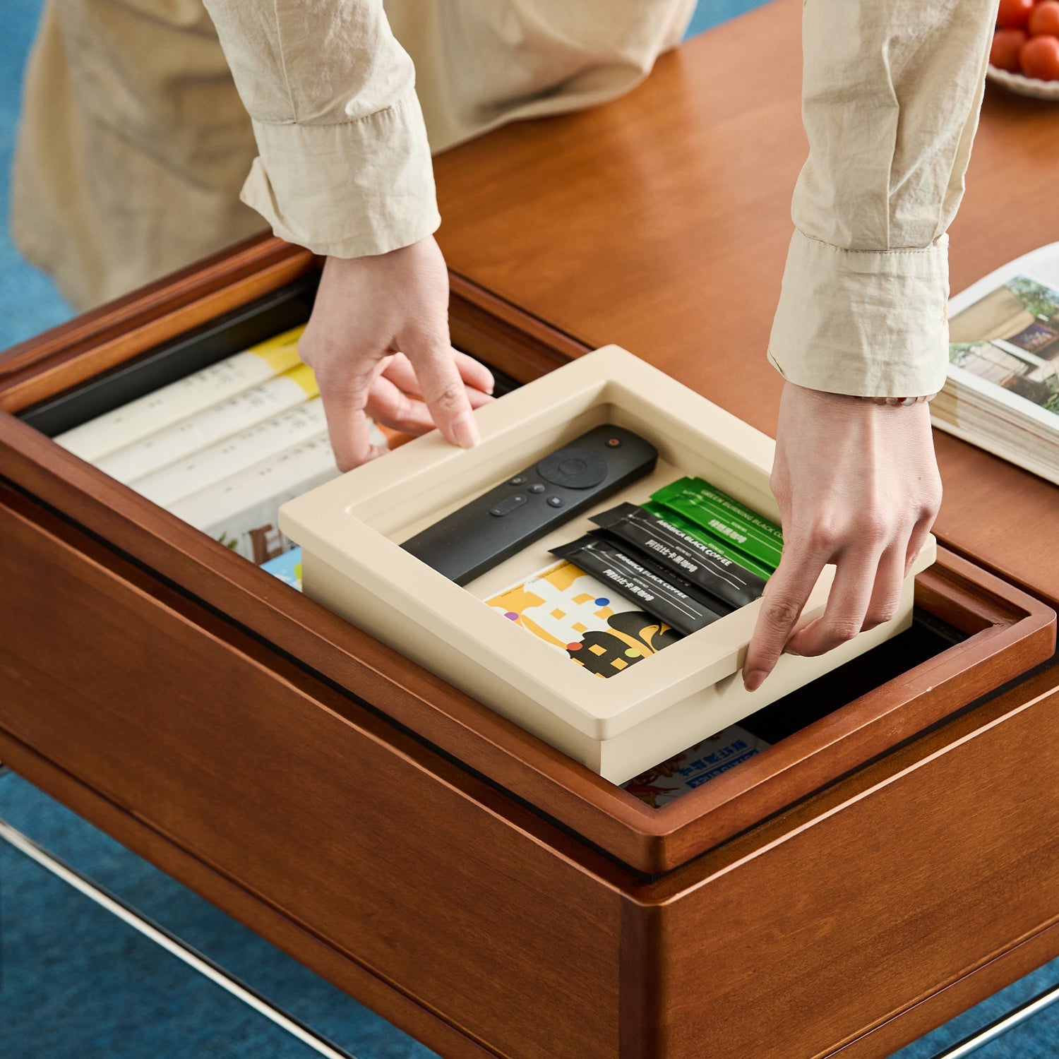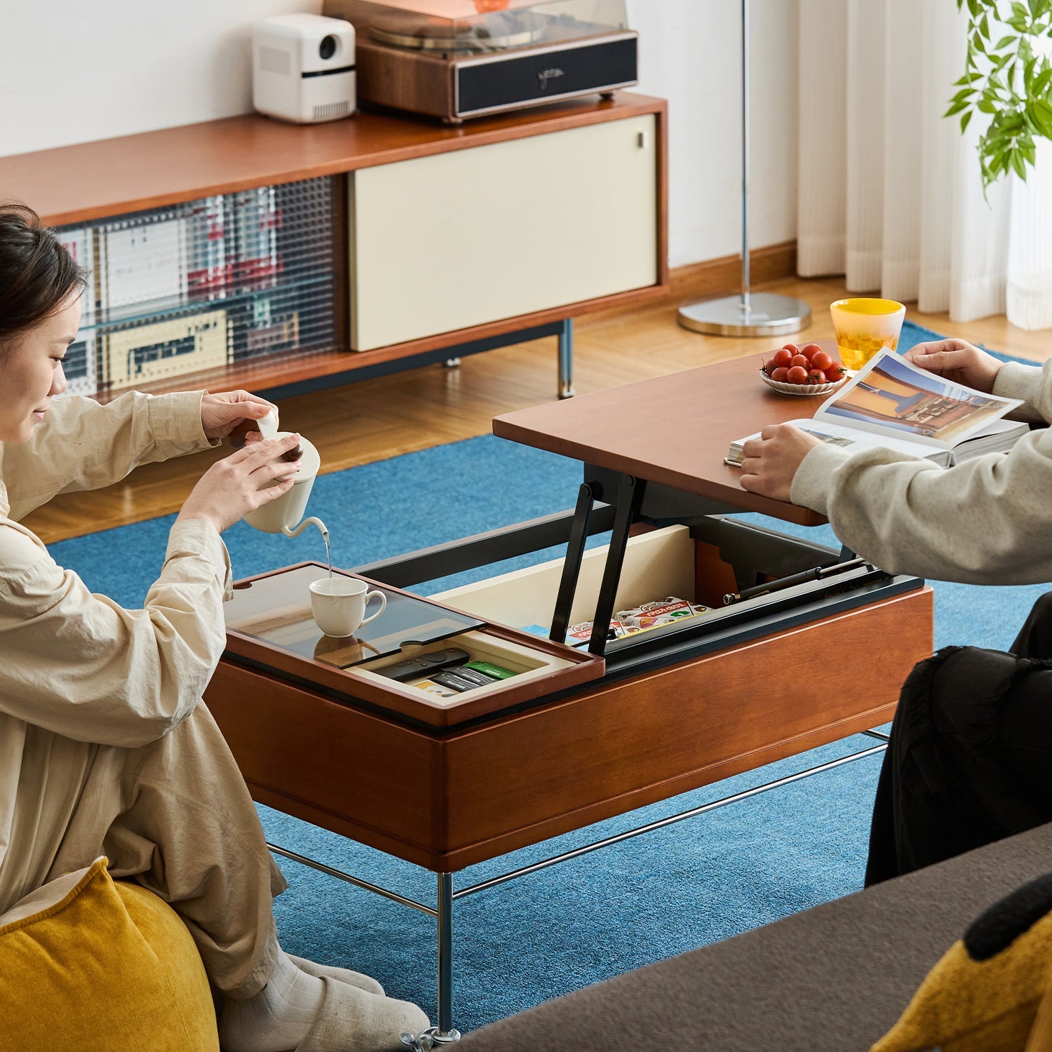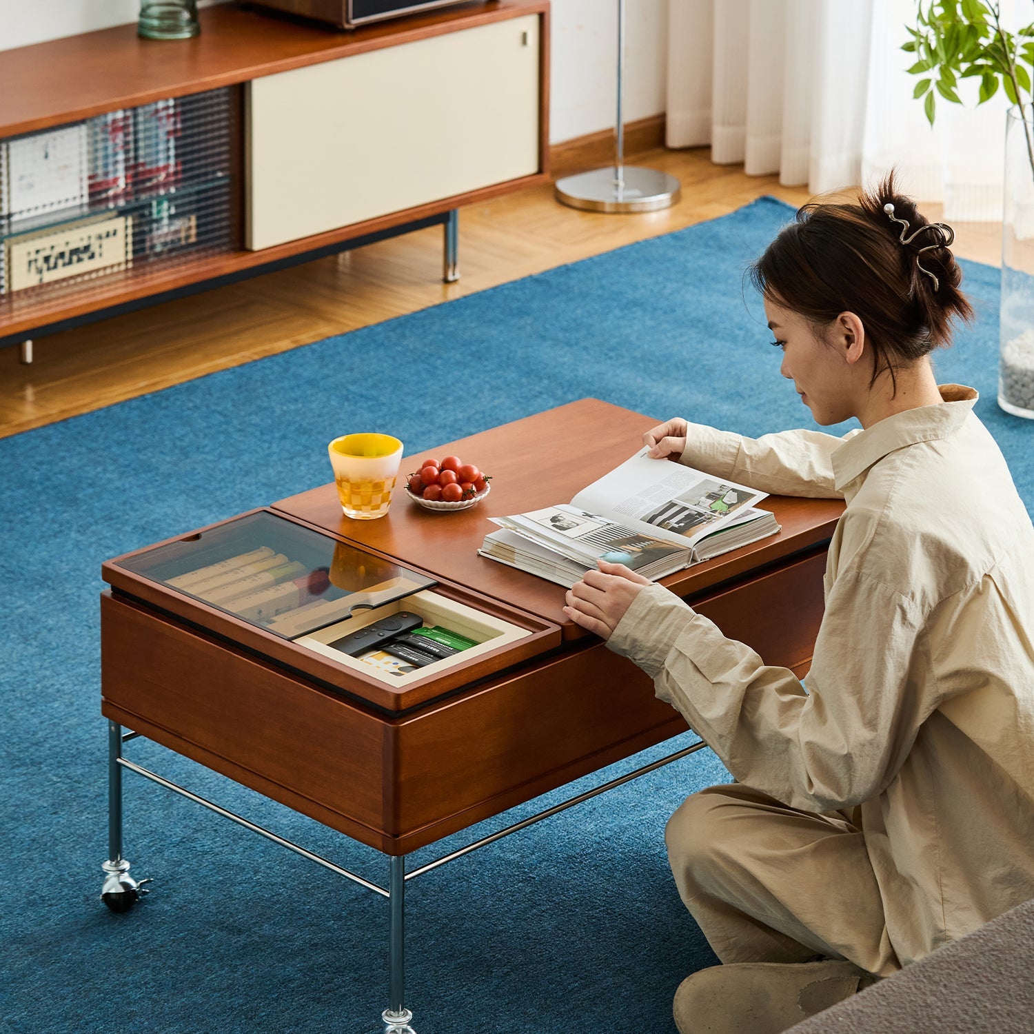 Keep your living room tidy with dual-layer compartments including a soft-close lift-top space and tinted glass tray to neatly store remotes snacks books and more |