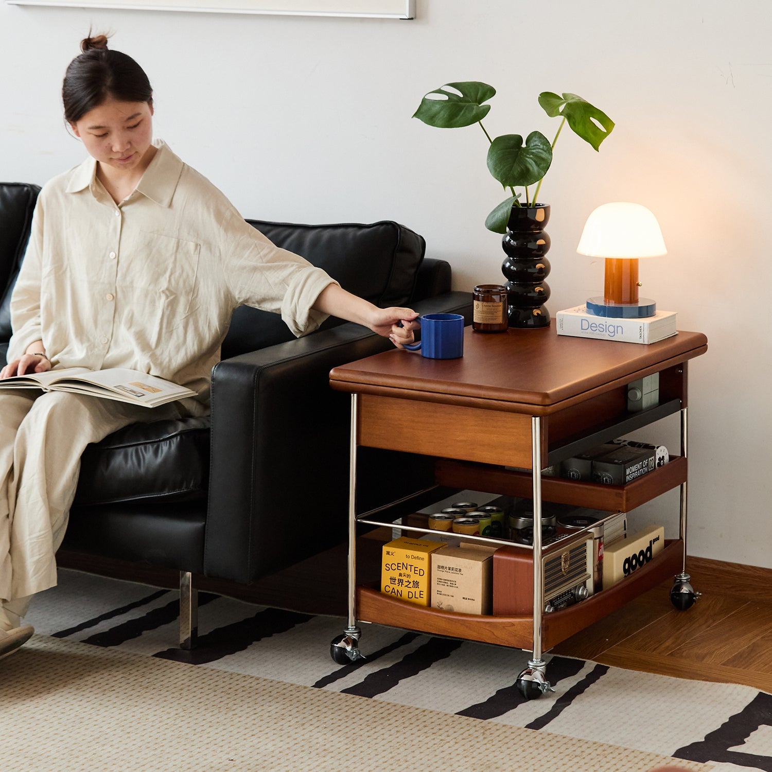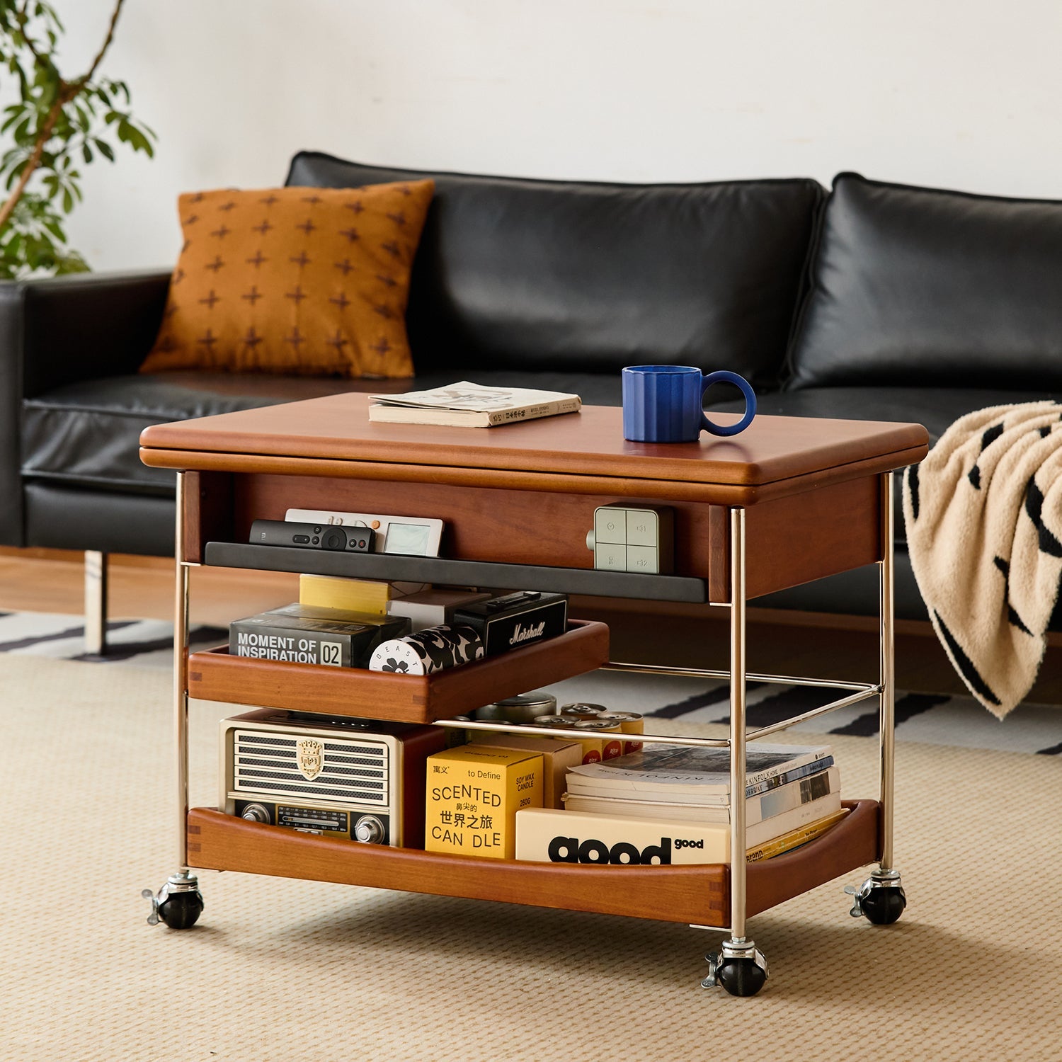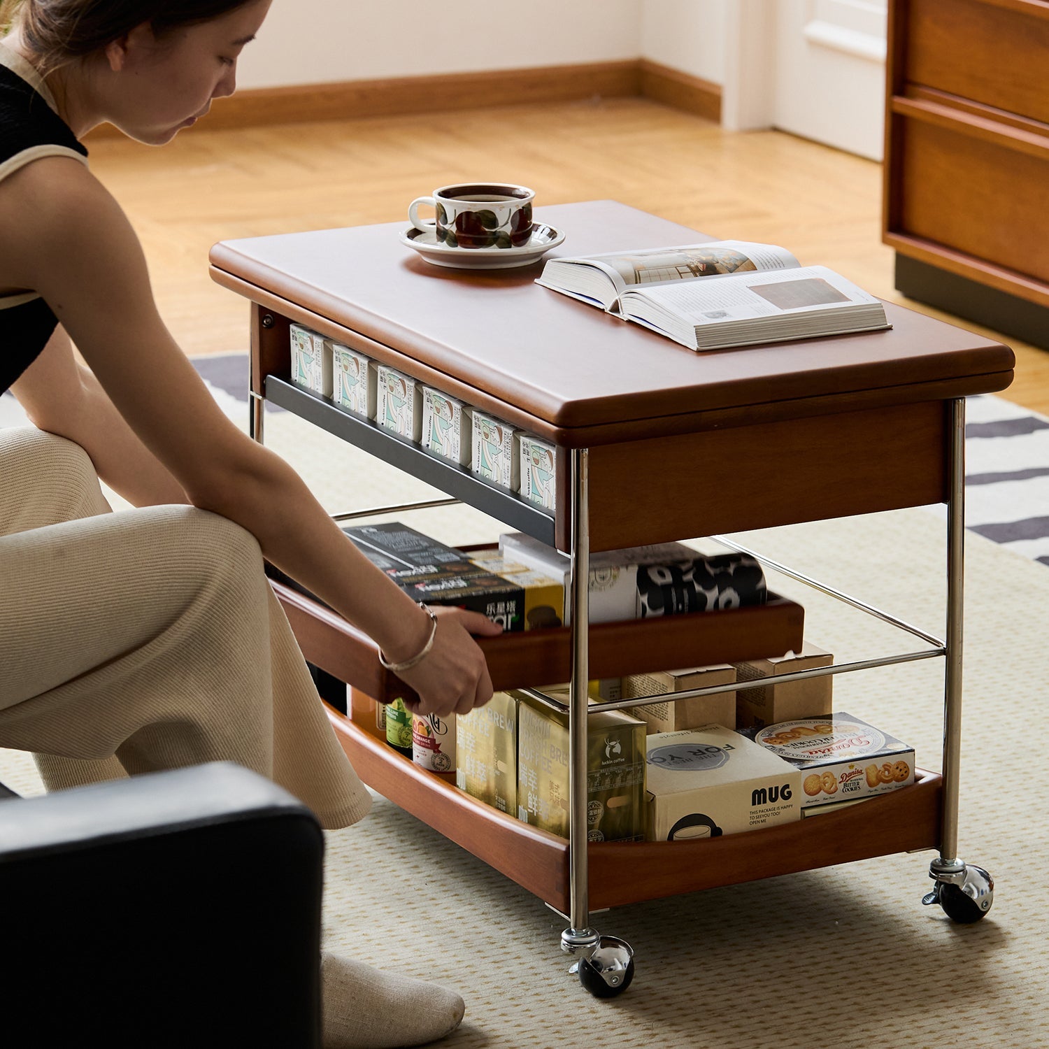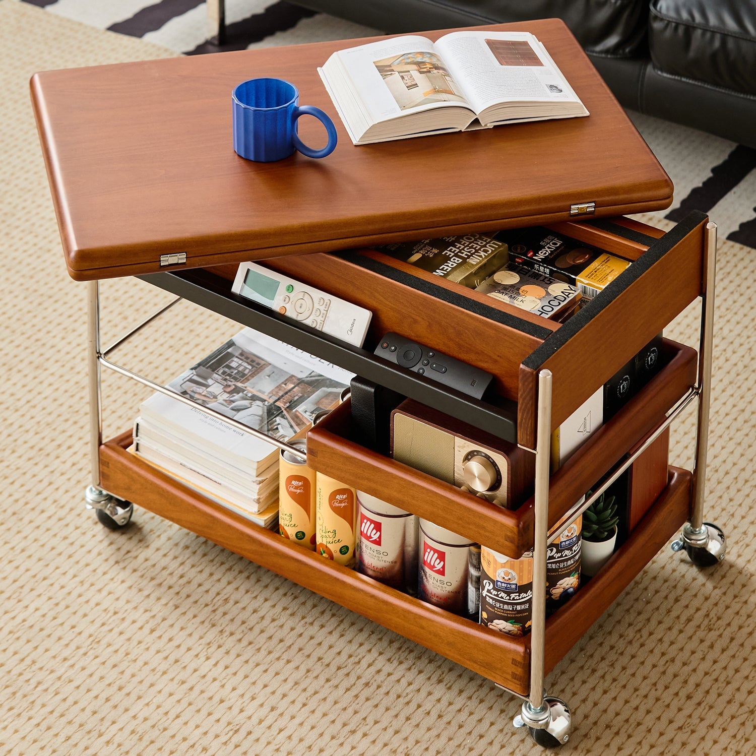 Features recessed compartments, a movable tray, and open shelves to keep essentials organized and within reach in any setting.