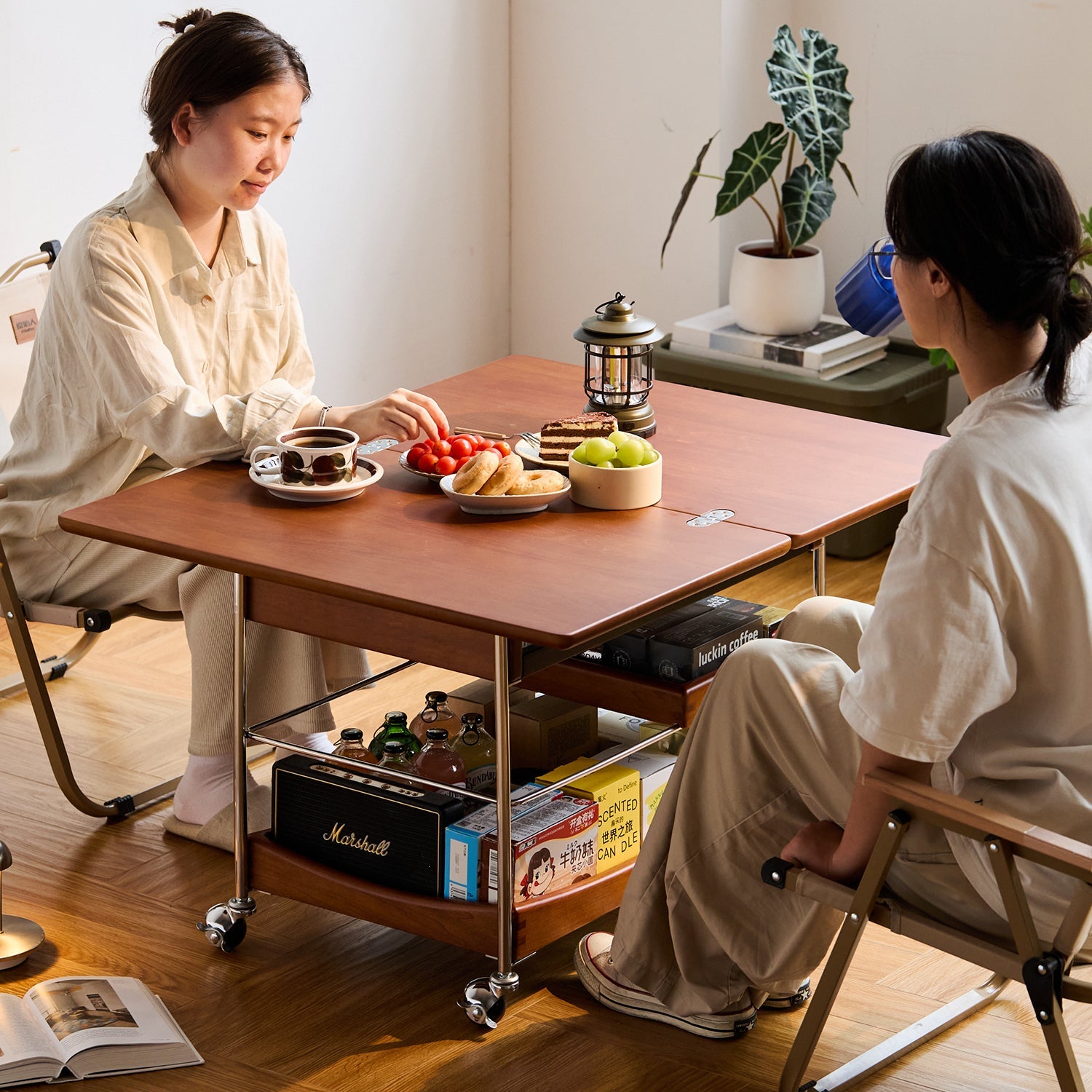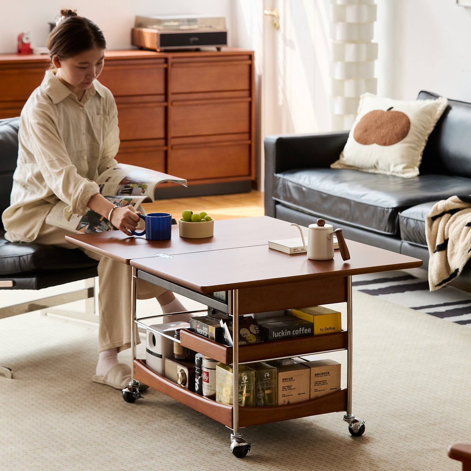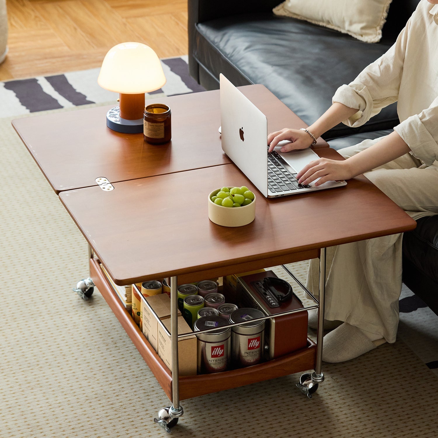 Easily switches from a coffee table to a dining or work table. Ideal for game nights, meals, or casual laptop work at 555mm height.