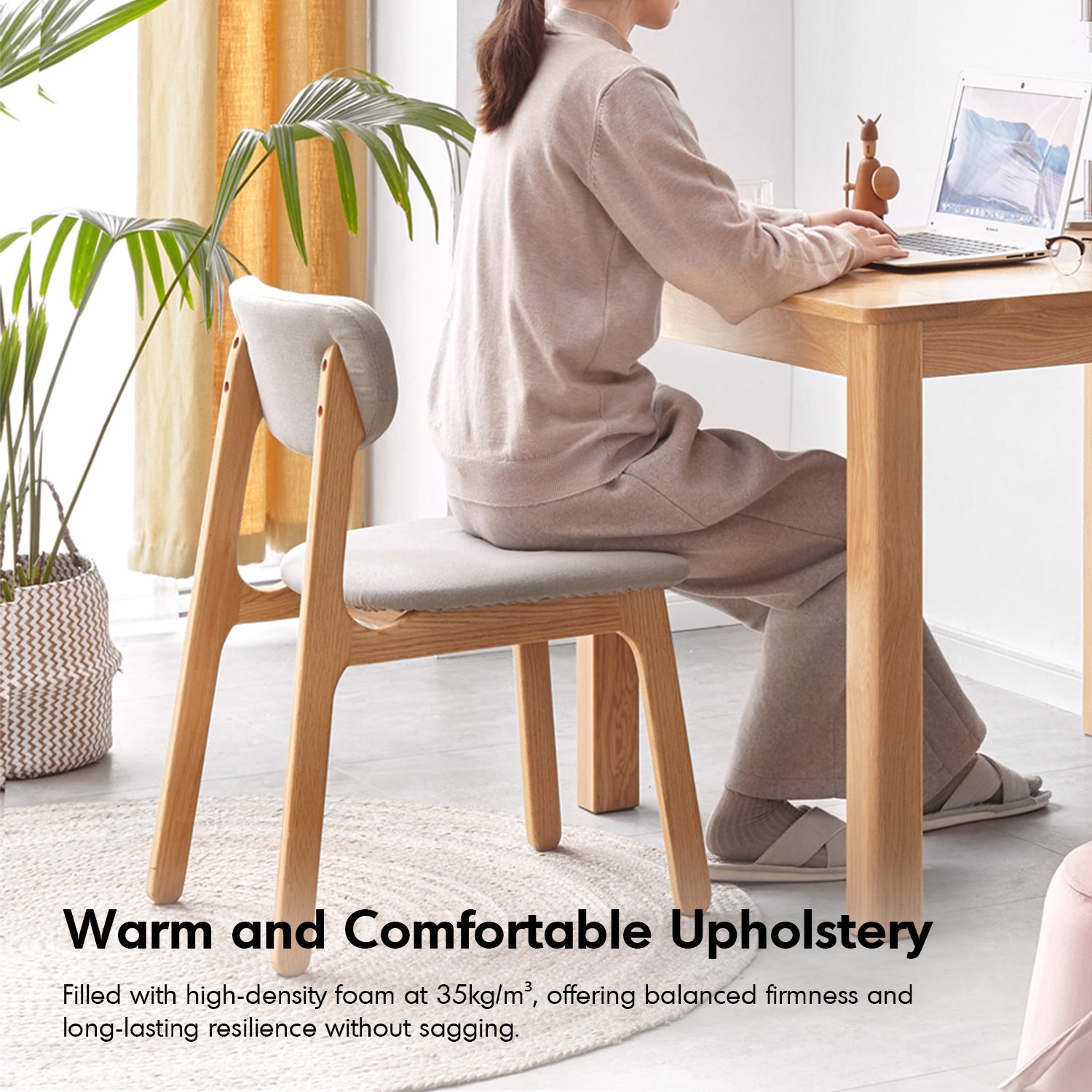 The Scandinavian Oak Wood Mixed Weave Fabric Cover Removable Dining Chair NEST combines timeless elegance with superior comfort. Crafted from premium North American FAS-grade oak, it features a smooth "h" shape design, curved upholstered backrest, and a spacious seat for ultimate support. Reinforced with mortise-and-tenon joints and triangular crossbars, it ensures long-lasting stability. With high-density foam cushioning and a removable upholstery cover, NEST is both stylish and practical - perfect for enhancing any modern dining space.
