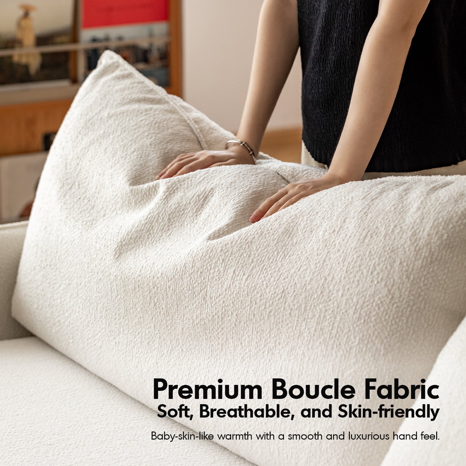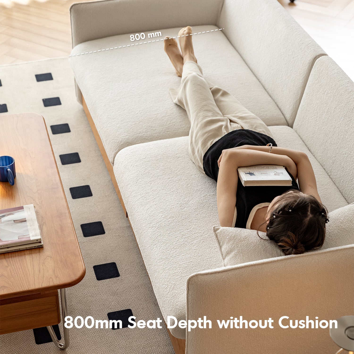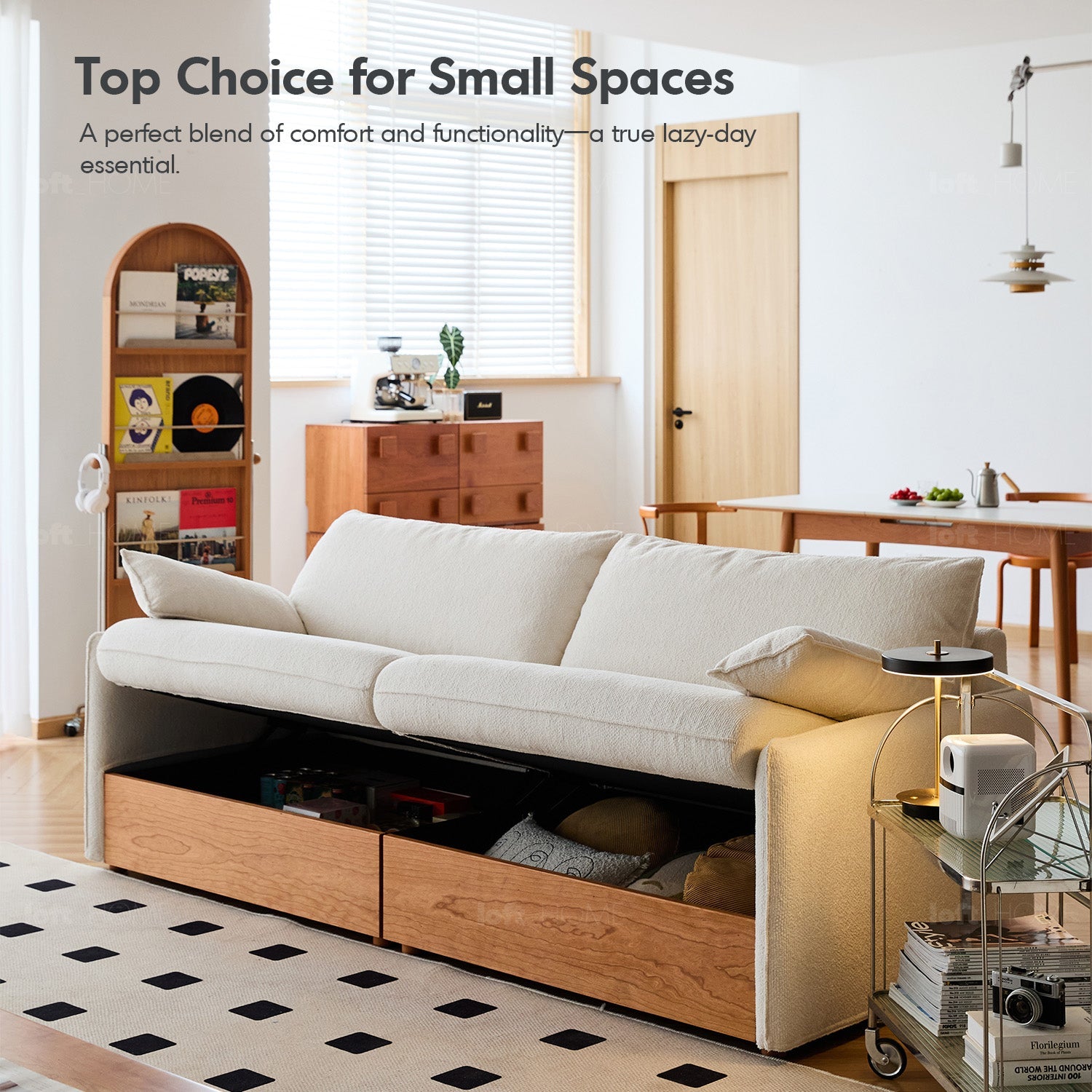Japandi Boucle Fabric Pine Wood Storage 2 Seater Sofa KANGAROO features 266L hidden storage, deep cushioned seating, and soft boucle fabric—perfect for cozy living in compact spaces.