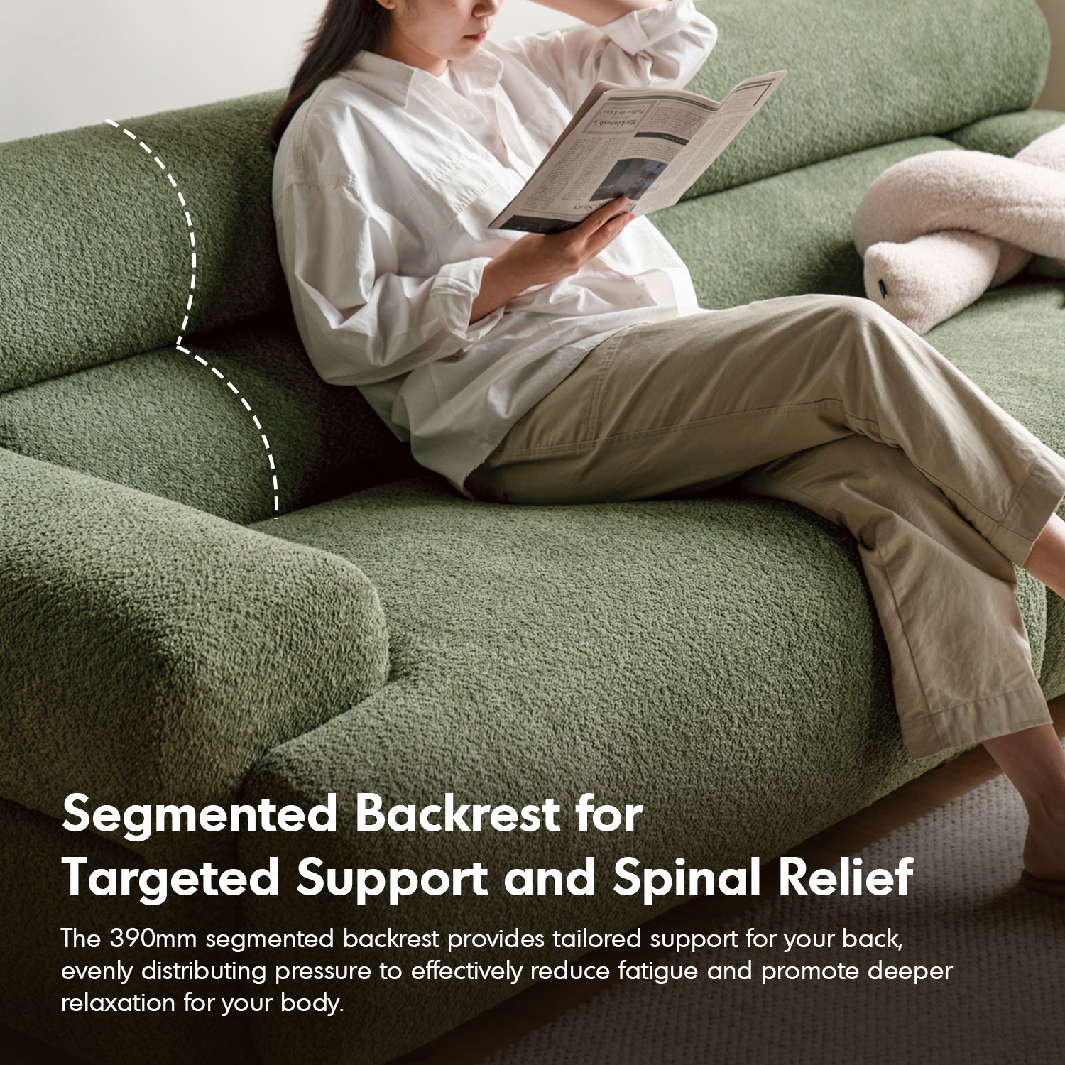 Inspired by "toast bread," its plump, bouncy seat cushions and muted green bouclé fabric exude vintage charm and inviting softness. |