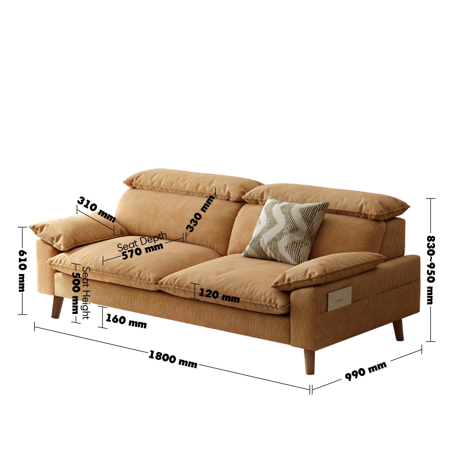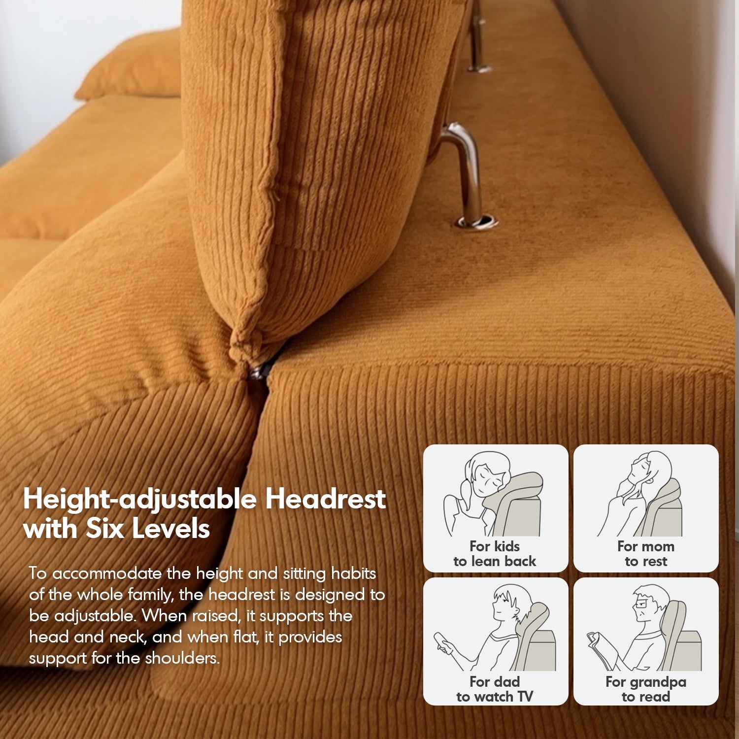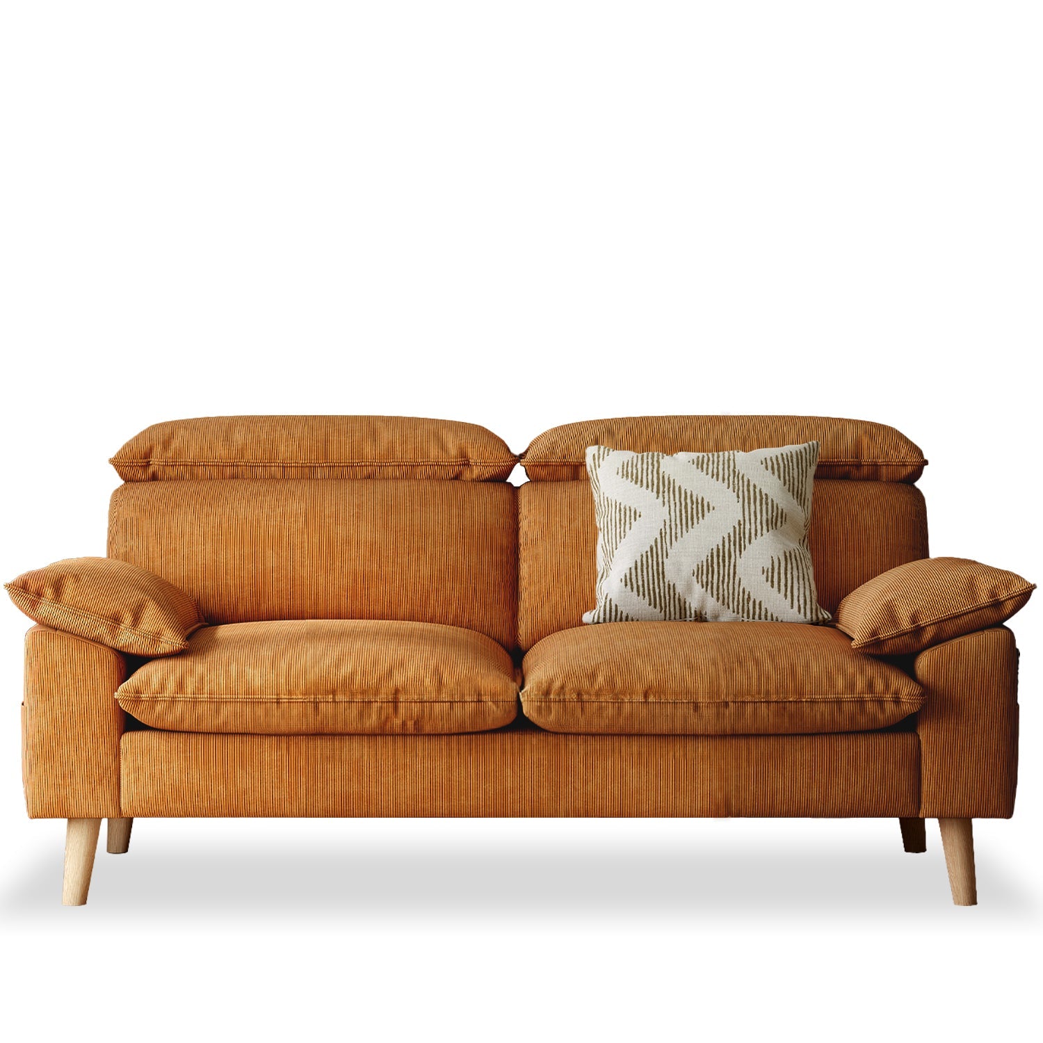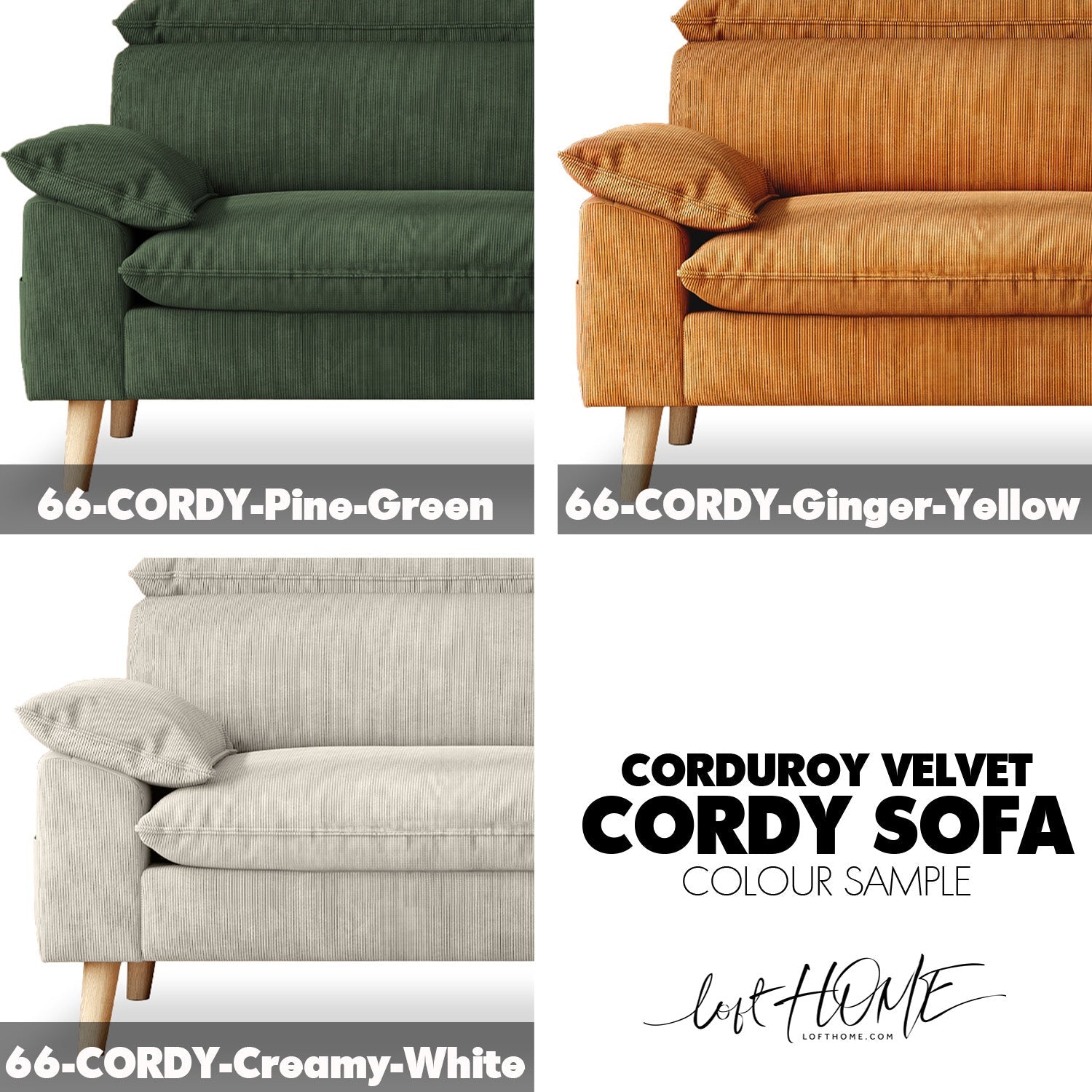 Modern Corduroy Velvet Fabric 2 Seater Sofa CORDY blends style and comfort with a height-adjustable headrest, ergonomic seating, and vintage corduroy fabric. Its deep seat, filled with down feathers and high-quality foam, provides lasting comfort and support, while the solid wood frame ensures durability. CORDY features a handy armrest storage pocket and 150mm ground clearance for easy cleaning. Available in Pine Green, Ginger Yellow, and Creamy White, this sofa is a perfect blend of functionality and style for modern living.