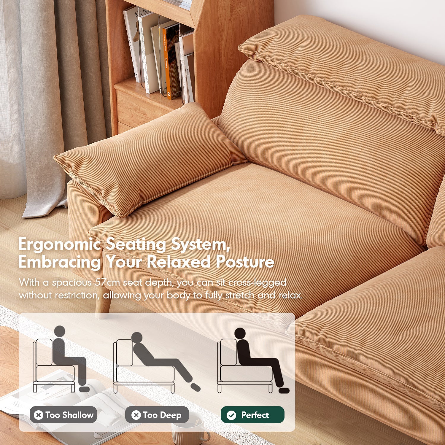 Modern Corduroy Velvet Fabric 3 Seater Sofa CORDY blends luxurious comfort with practical design. Featuring a six-level adjustable headrest, ergonomic seating, and rich vintage corduroy fabric, this sofa offers a customizable and stylish experience. With high-density foam, down feather filling, and a solid wood frame, CORDY ensures durability and long-lasting comfort. Additional armrest storage and a 150mm ground clearance make it easy to keep your space tidy. Available in Pine Green, Ginger Yellow, and Creamy White, this sofa adds sophistication and functionality to any room.