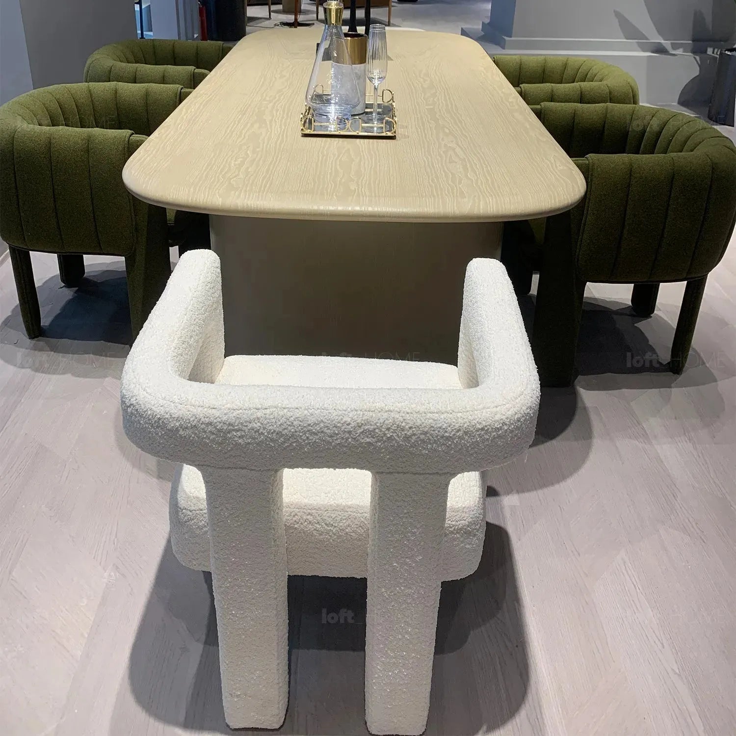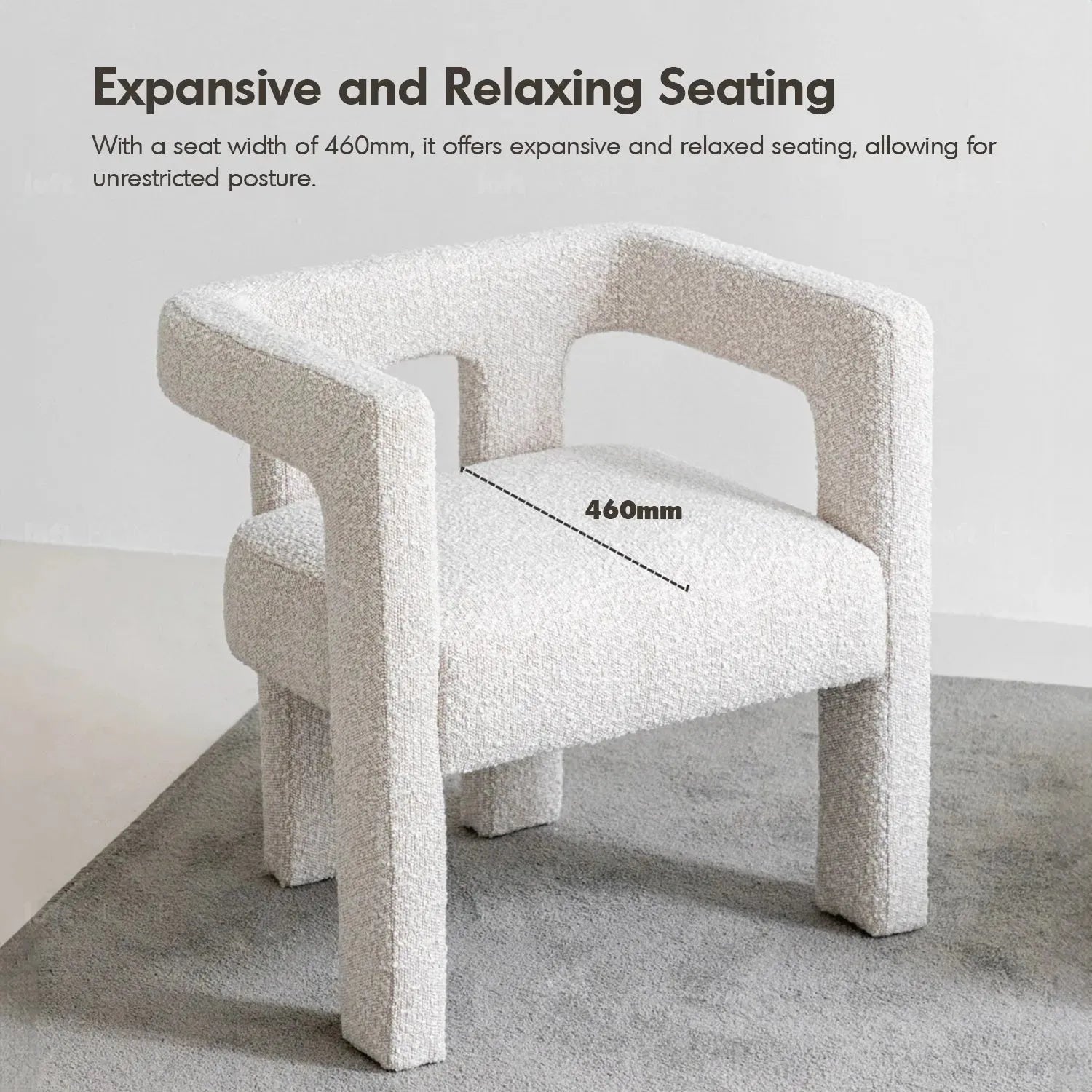 The combination of the soft bouclé fabric and the sleek black powder-coated steel frame gives a refined yet cozy appearance, ideal for modern dining spaces. |