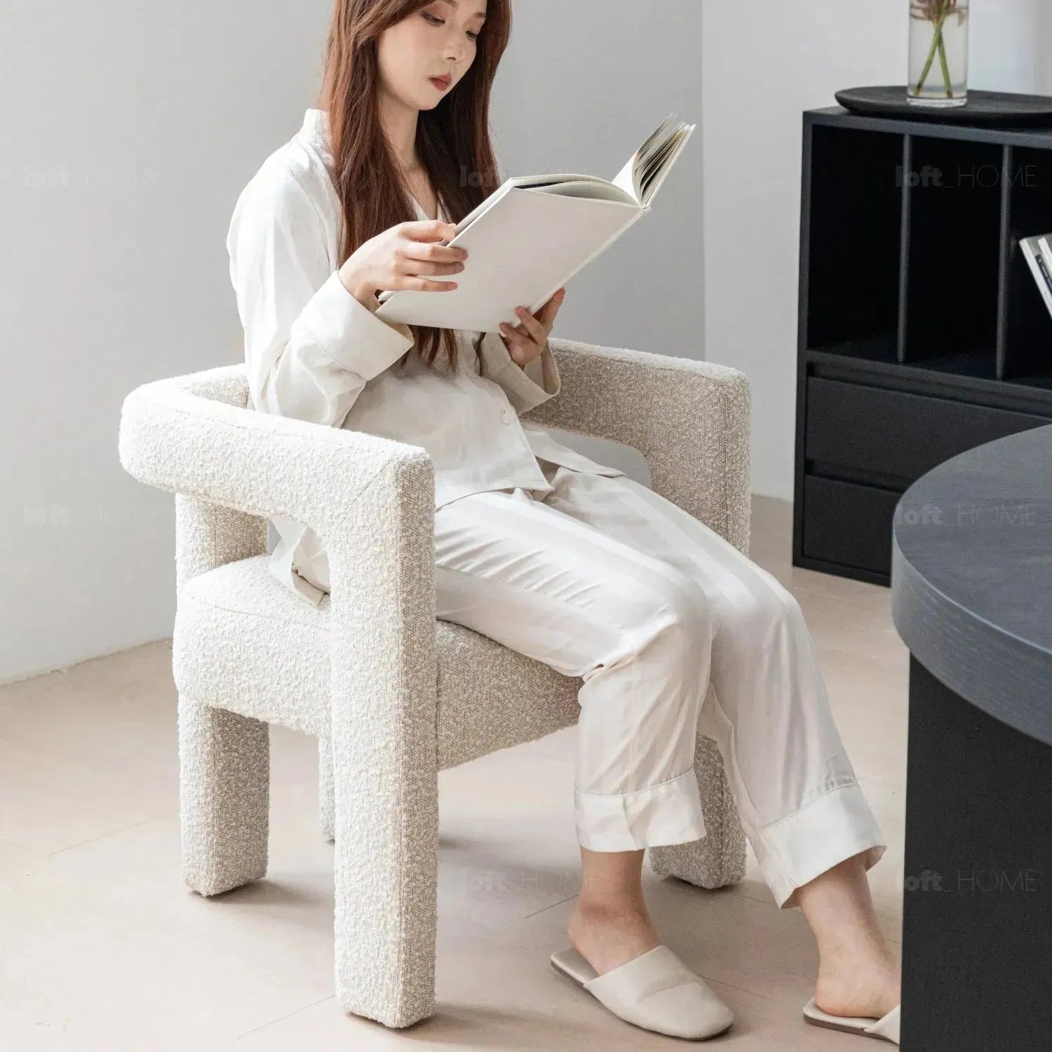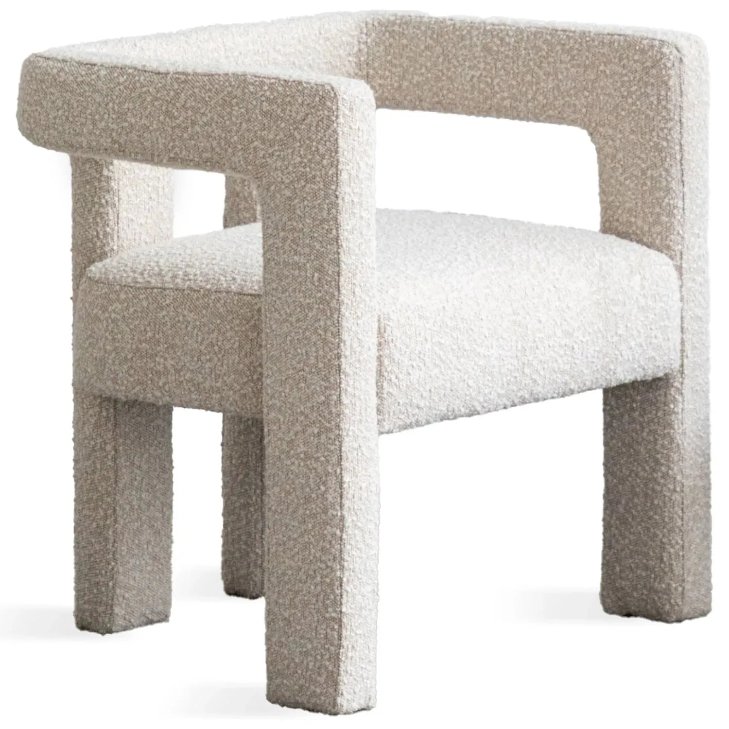Discover the Cream Boucle Dining Chair WHIM, designed with a sturdy frame for durability. The luxurious upholstery provides a touch of elegance, while the ergonomic design ensures comfort. This chair's contemporary style makes it a perfect addition to any modern living space.