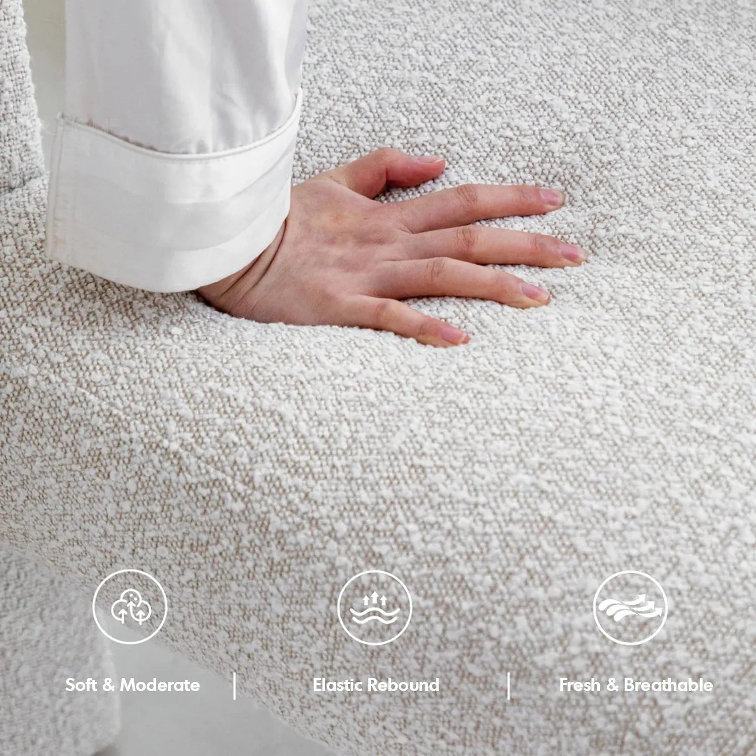 Upholstered entirely in creamy white bouclé fabric, offering a sophisticated texture and an elegant, modern look. |
