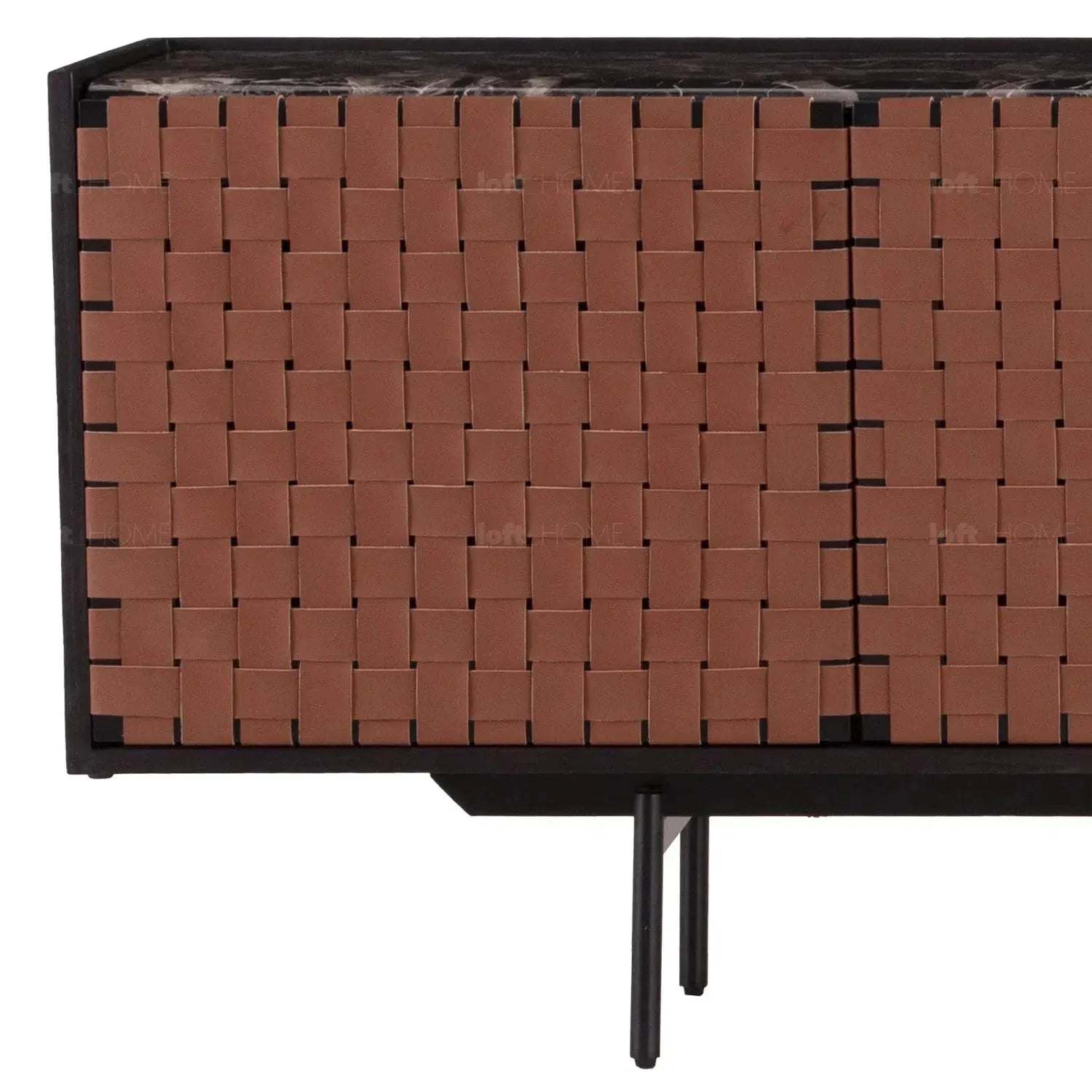 The TV console features orange PU leather doors with a distinctive crisscross pattern. This intricate design adds a contemporary and elegant aesthetic, making the console a standout piece in any room. |