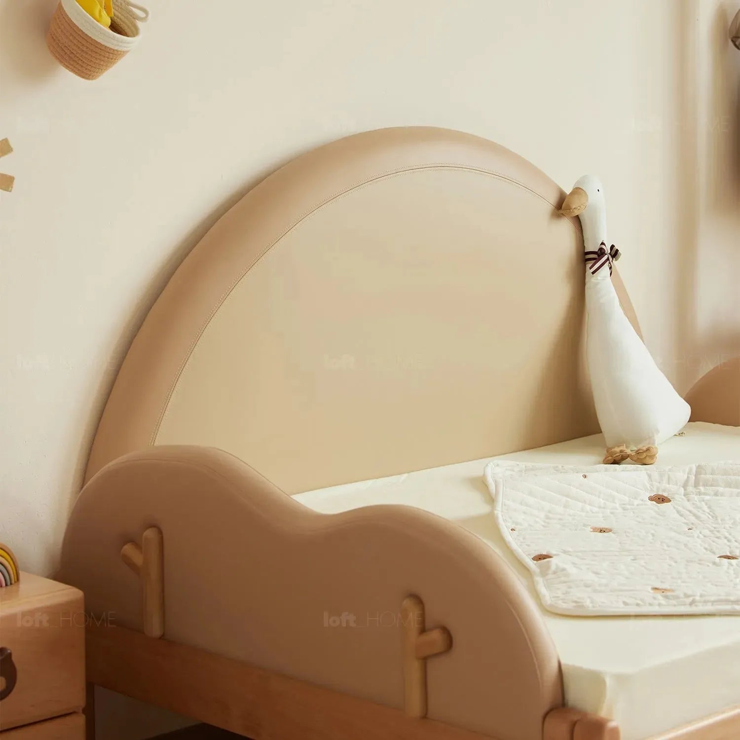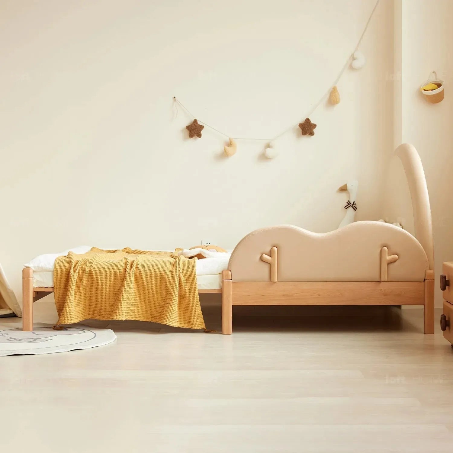 Charming twigs add a playful touch, breaking the monotony of the children's bed by embellishing intricate details on the bed frame.