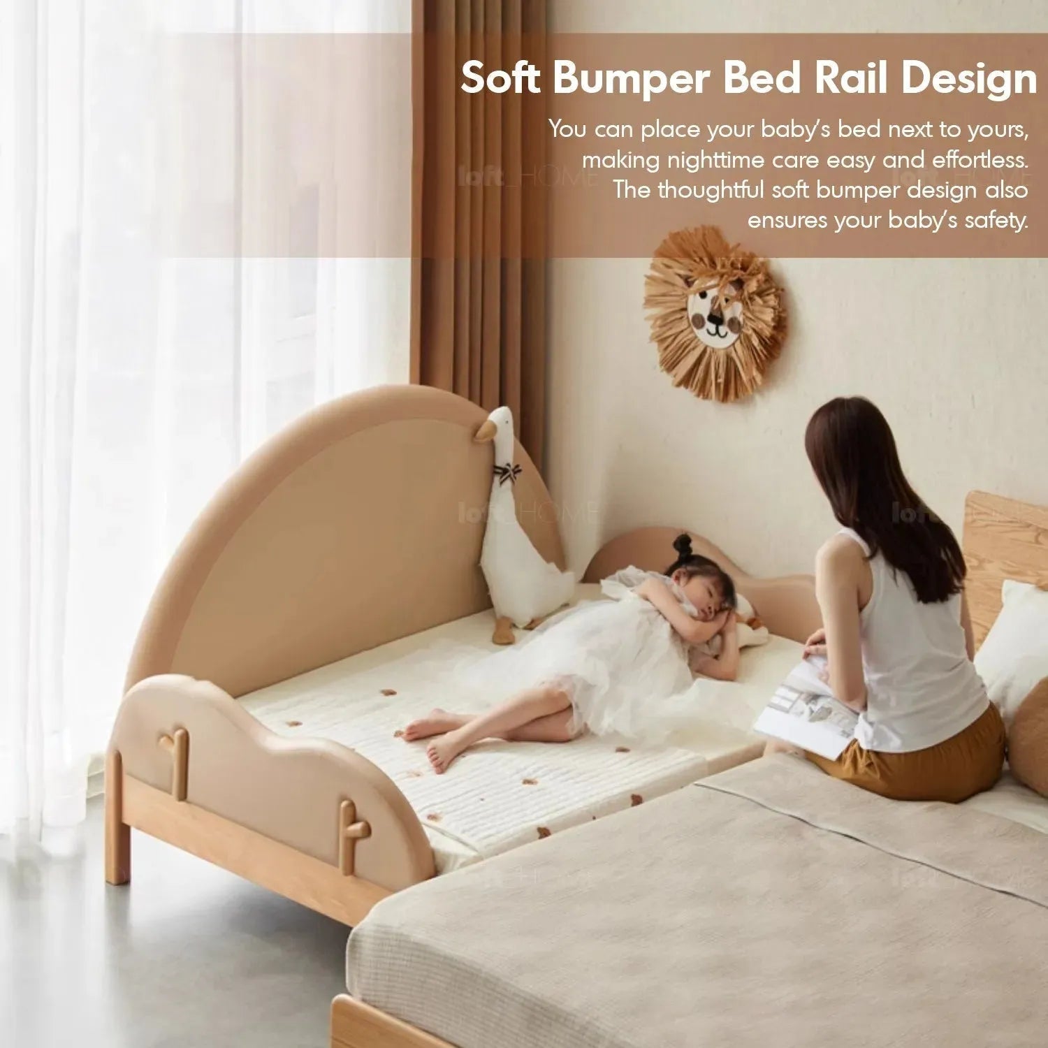 3. With three-sided guardrails for added safety. A bed that starts from infancy, providing peace of mind during nighttime care.