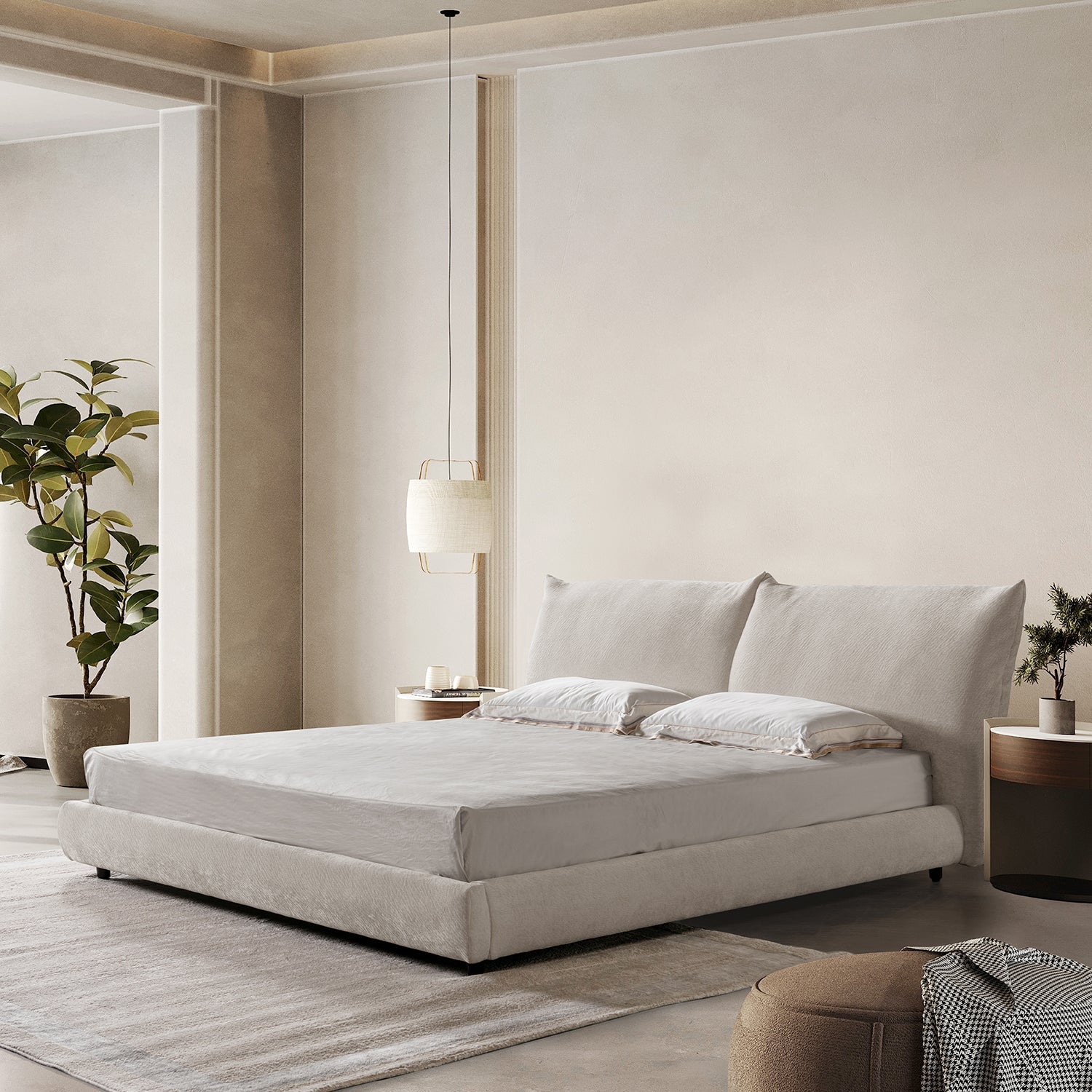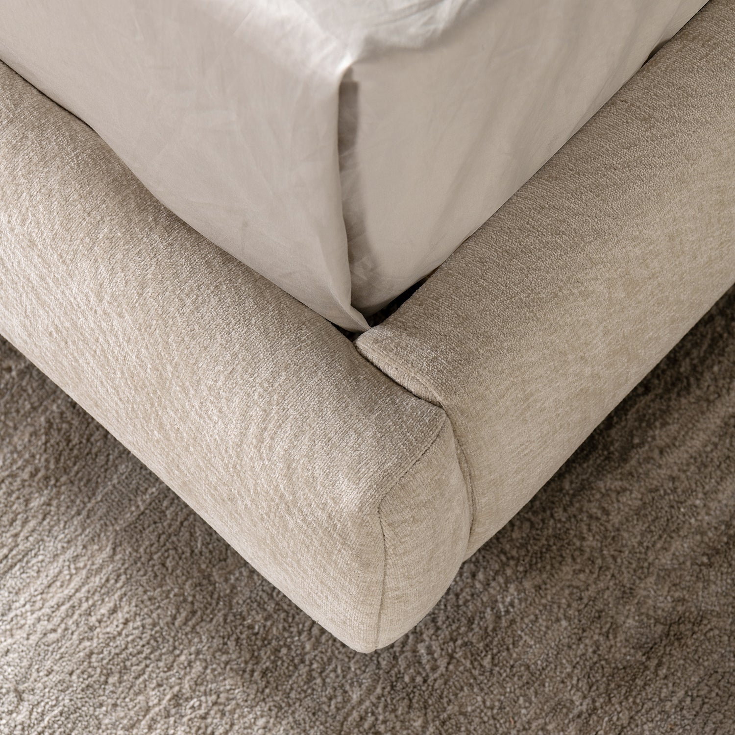 An Italian-style velvet headboard not only blooms visually, but also pours warmth for those who will be leaning against their bed to rest while reading or watching TV. |