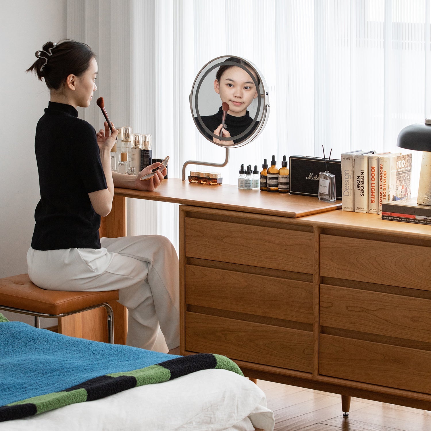 Scandinavian Cherry Wood Dressing Table VISTA pairs warm solid cherry wood with clever storage and a flexible mirror, creating an elegant and practical vanity for modern bedrooms.