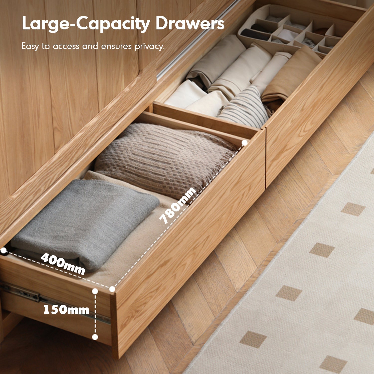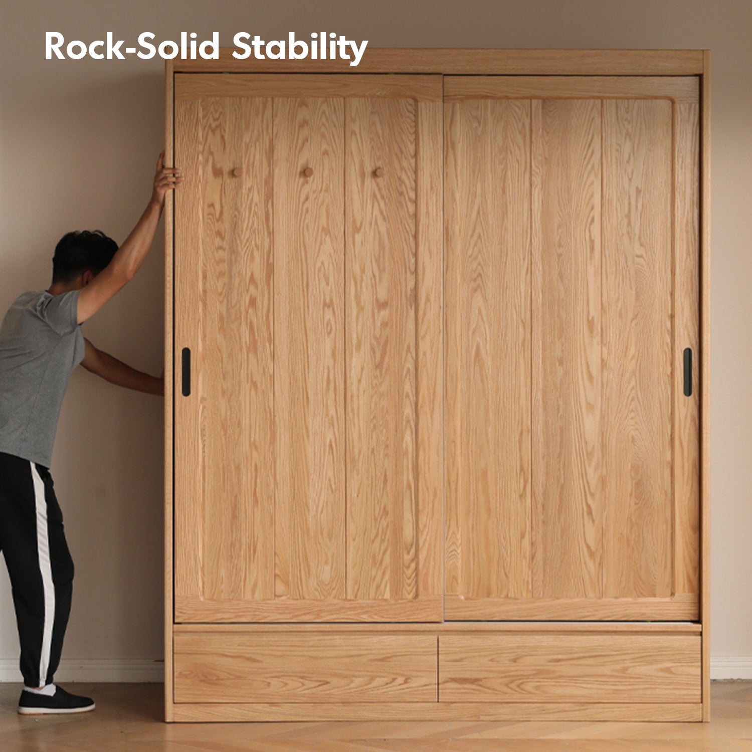 The Scandinavian Oak Wood Sliding Door Wardrobe With Drawers ALIGN combines sleek design with innovative functionality. Featuring customizable compartments, space-saving sliding doors, and durable solid wood craftsmanship, it offers spacious, organized storage while adding a modern, elegant touch to your home.