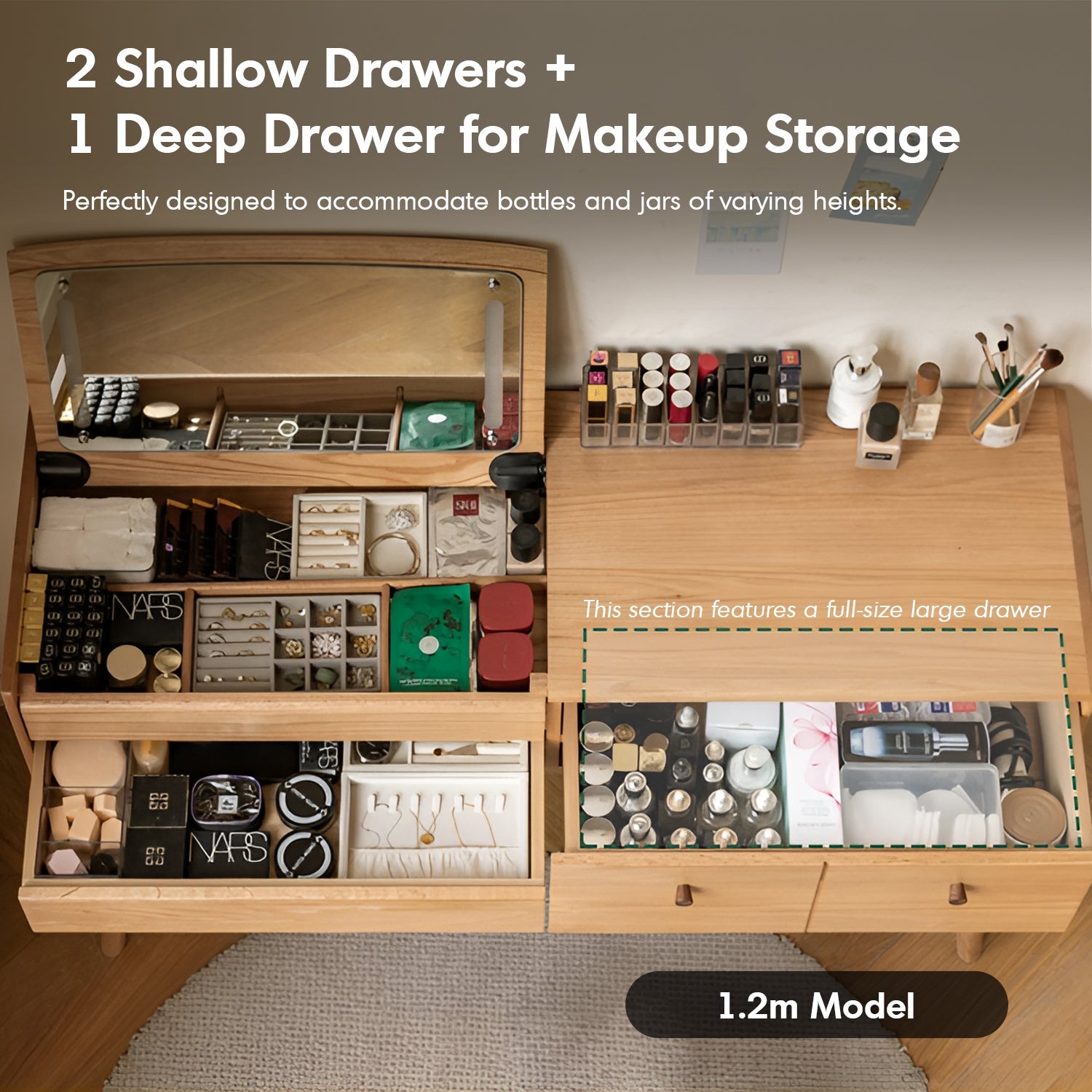 Features two shallow drawers, a deep drawer, and an upgraded full-size large drawer to accommodate makeup essentials of varying sizes. |