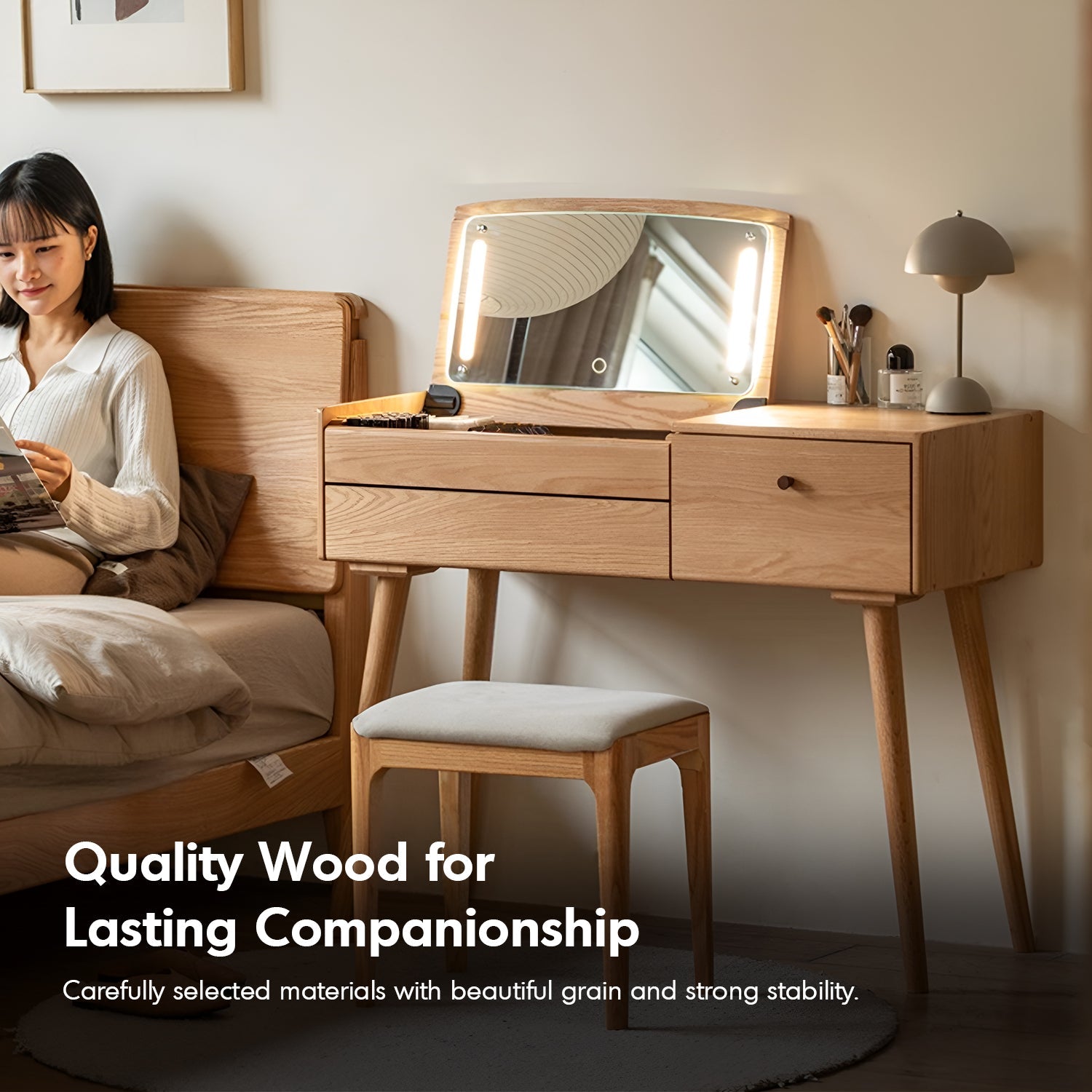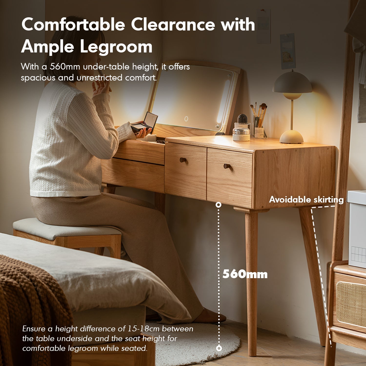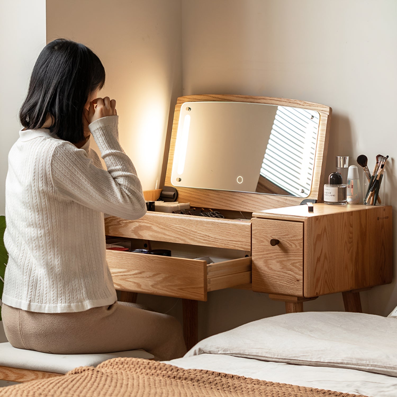 The Scandinavian Oak Wood Dressing Table AURA combines timeless elegance with practical functionality. Featuring an HD LED shatterproof mirror, spacious drawers, and an upgraded full-size storage design, it's perfect for organizing makeup essentials.