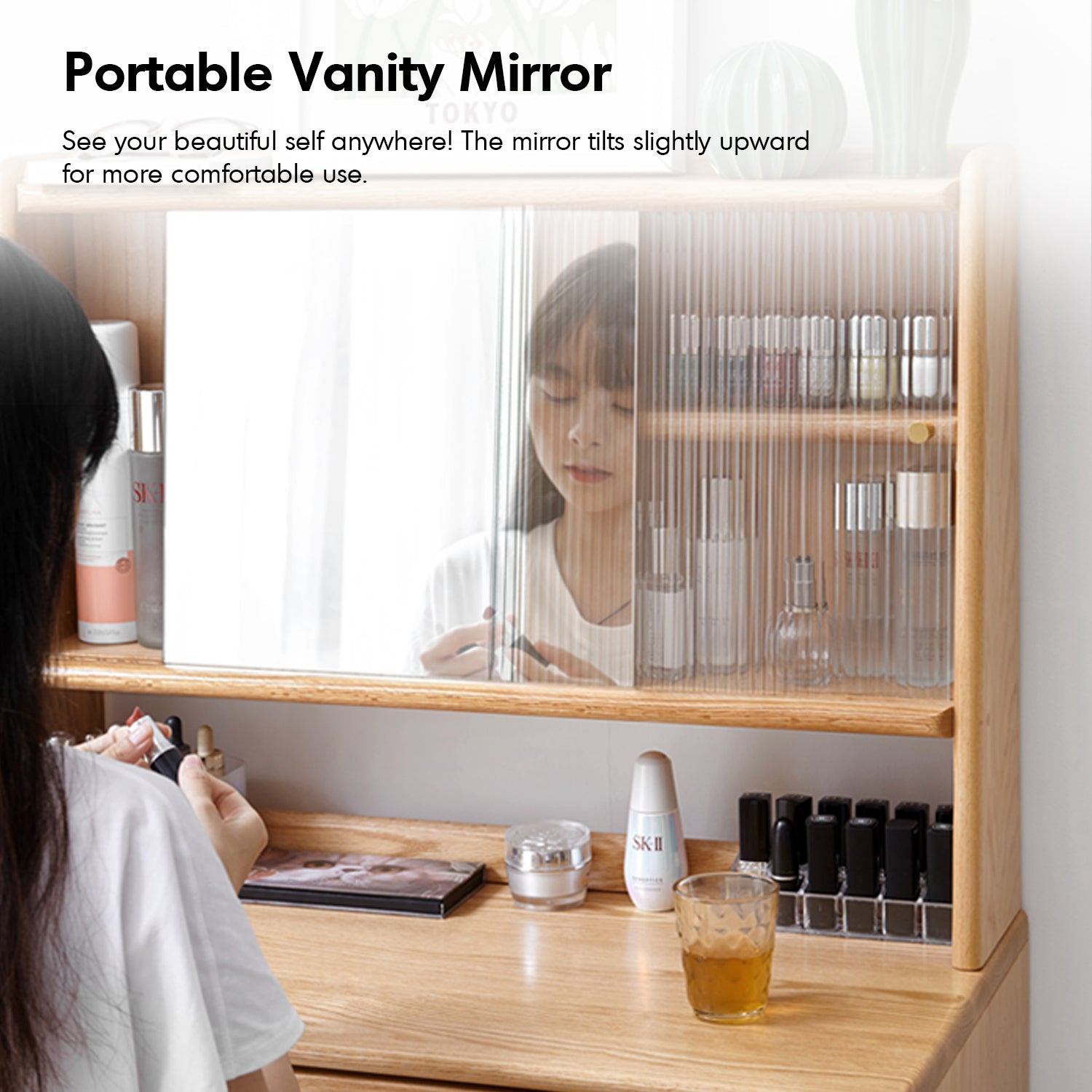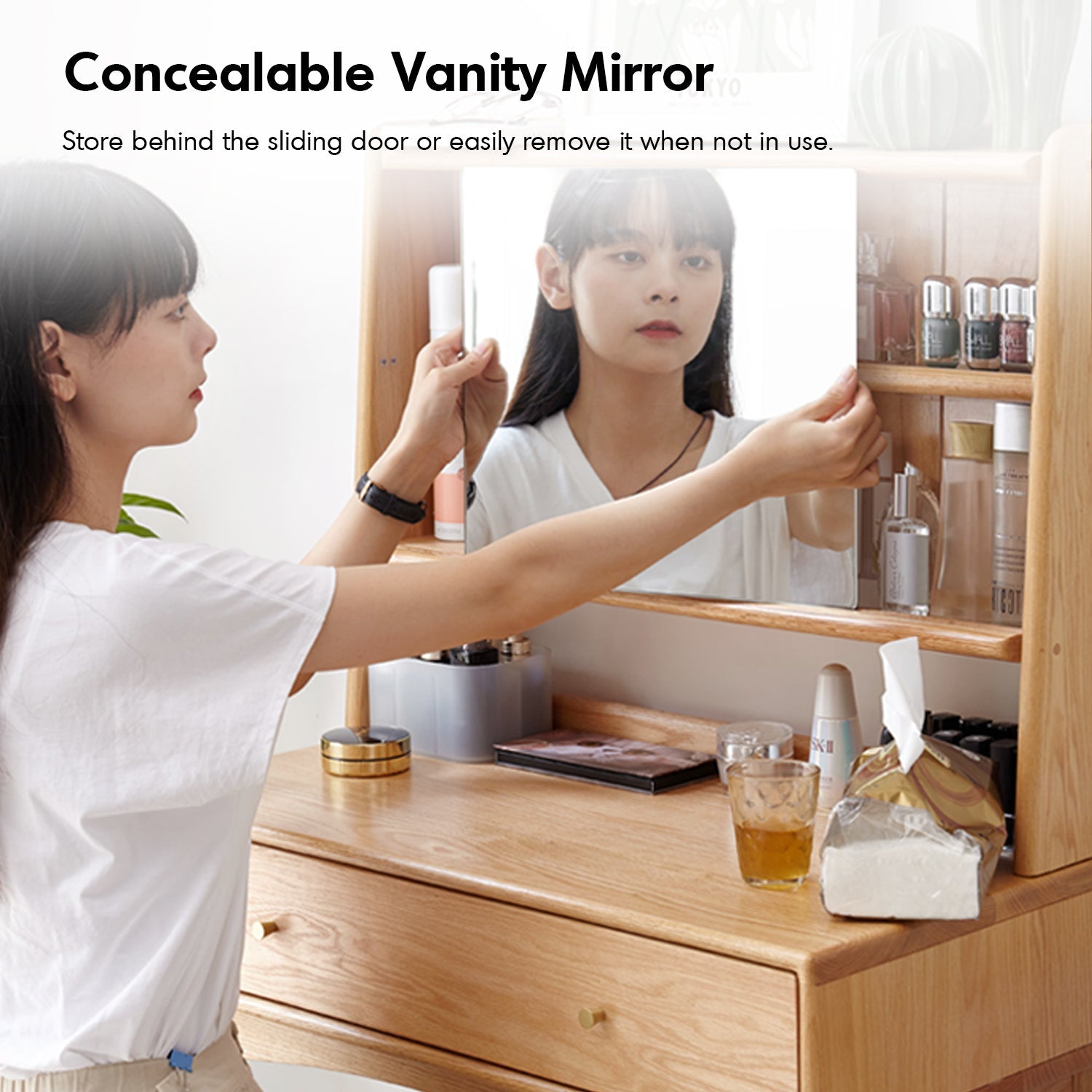 The vanity mirror tilts slightly for comfort, can be stored behind the sliding door, or easily removed when needed. |