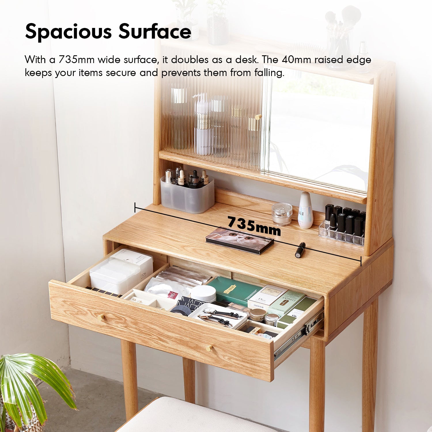 Features a spacious drawer with adjustable dividers, a top storage area with raised edges, and a wide 735mm surface that doubles as a desk. |