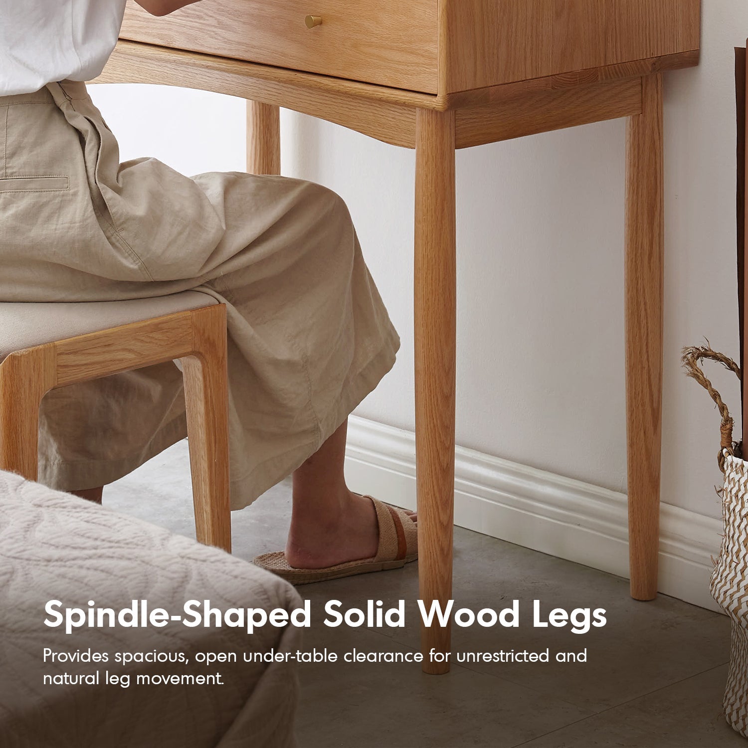 Polished rounded corners and spindle-shaped solid wood legs provide safety, stability, and a spacious under-table clearance for natural leg movement. |