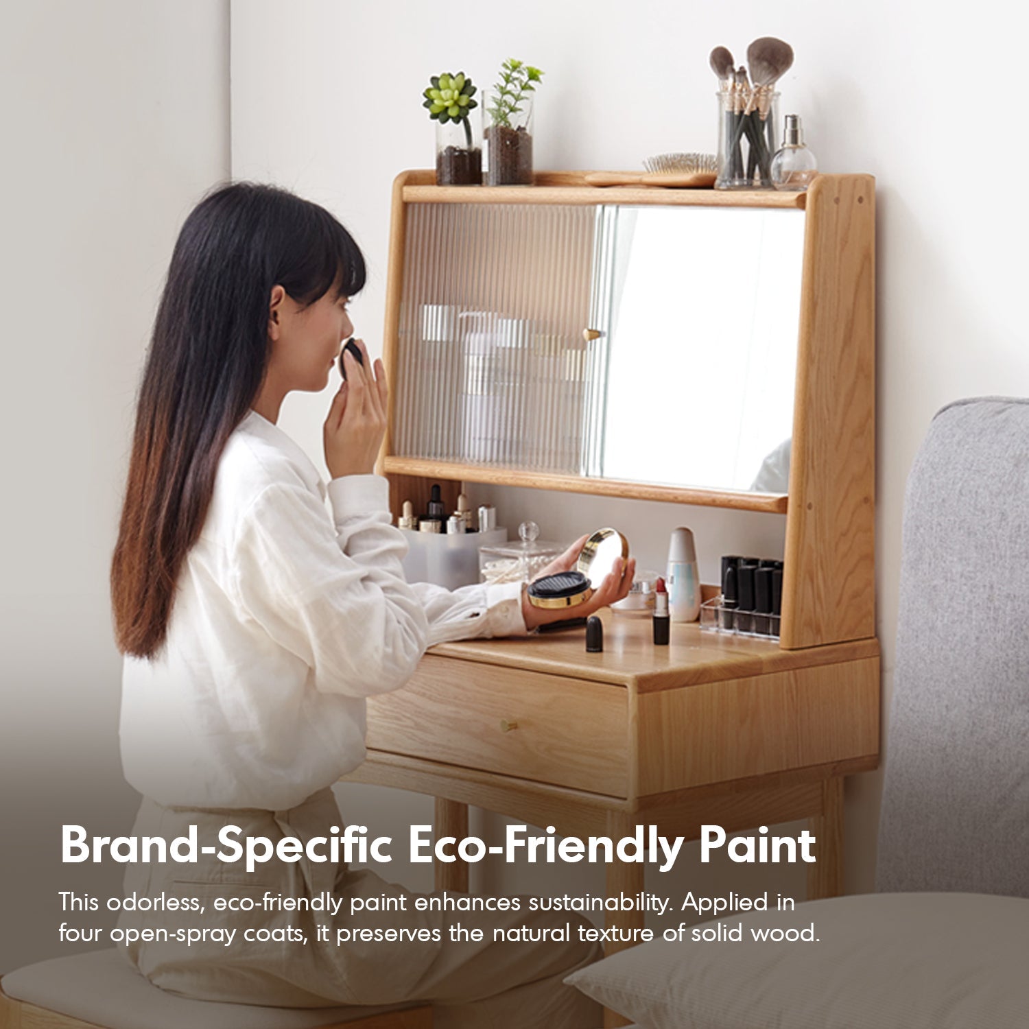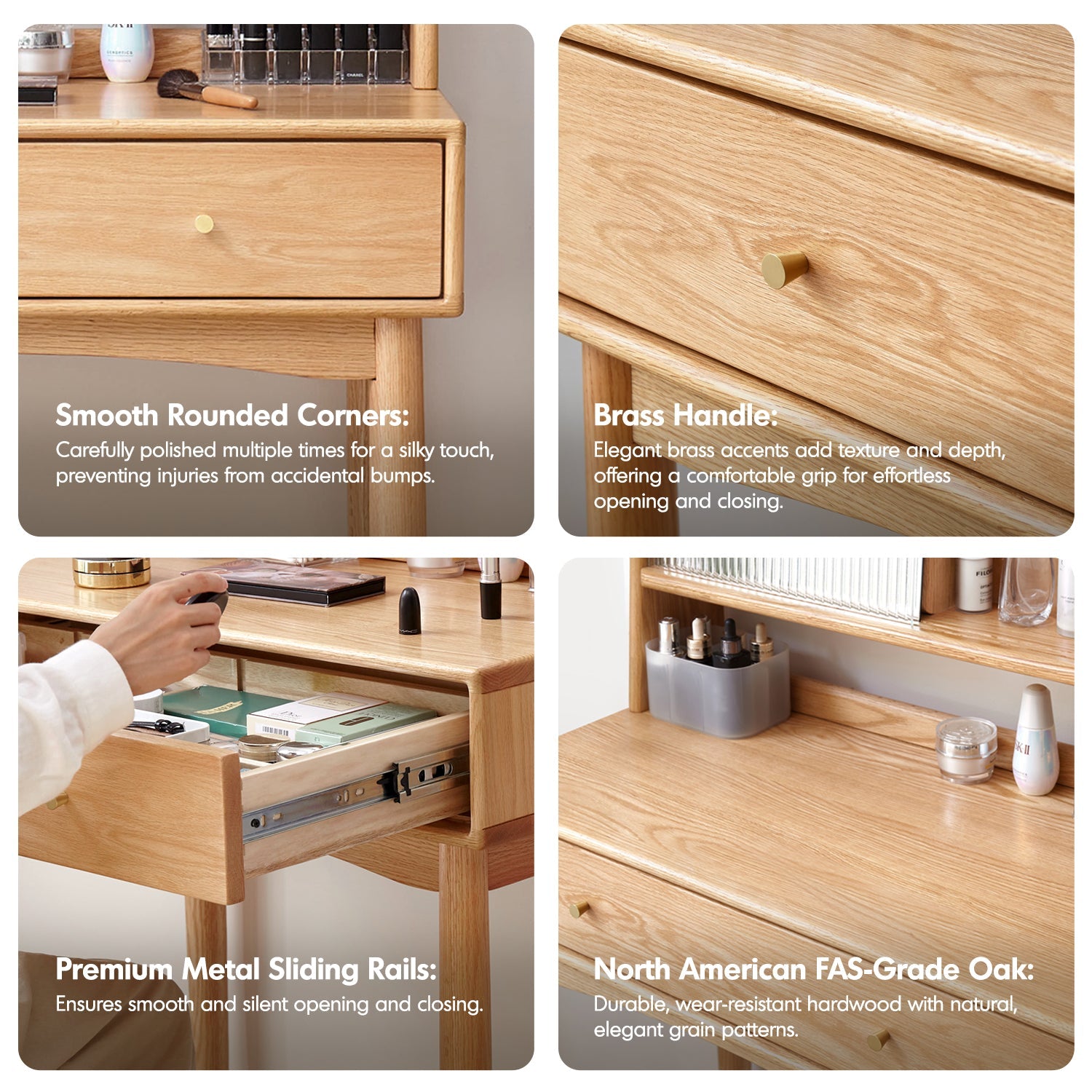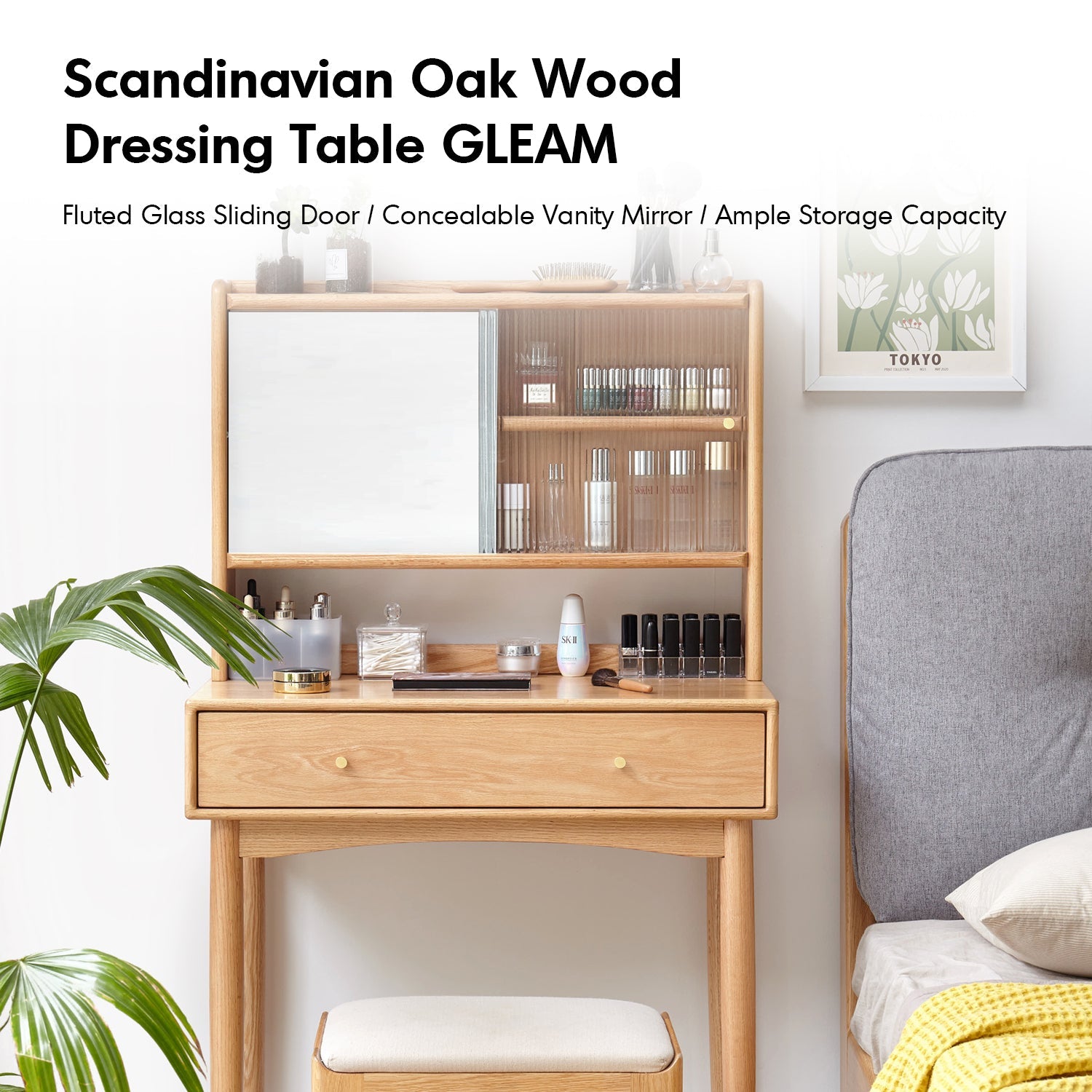 The Scandinavian Oak Wood Moru Glass Dressing Table With Mirror GLEAM combines minimalist elegance with unmatched functionality. Crafted from premium North American FAS-grade oak, it features a concealable vanity mirror, a fluted glass sliding door with a brass handle, and ample storage with customizable dividers.