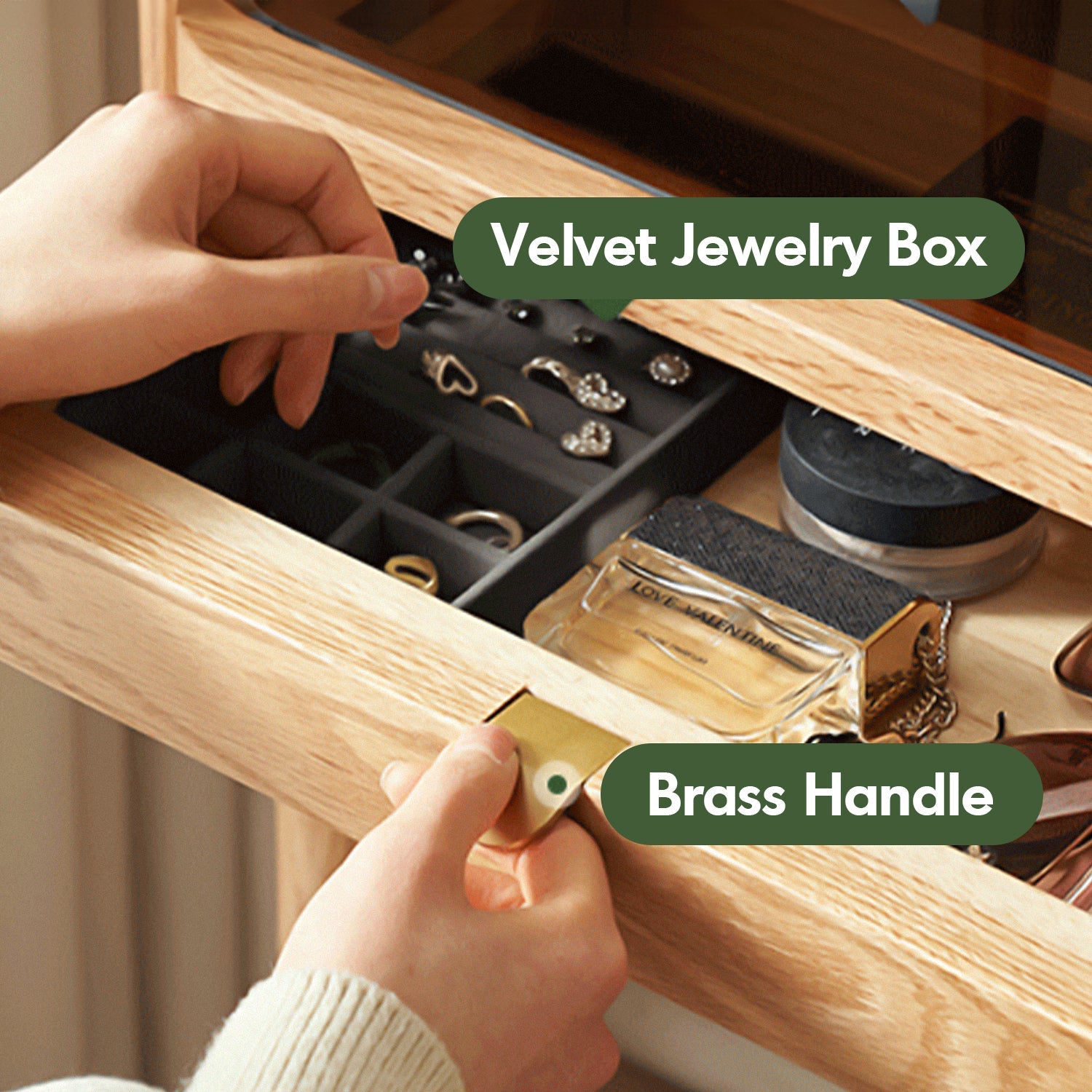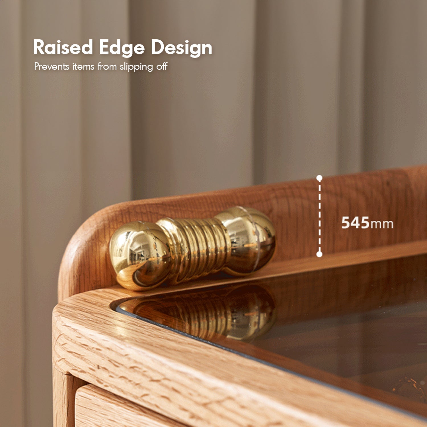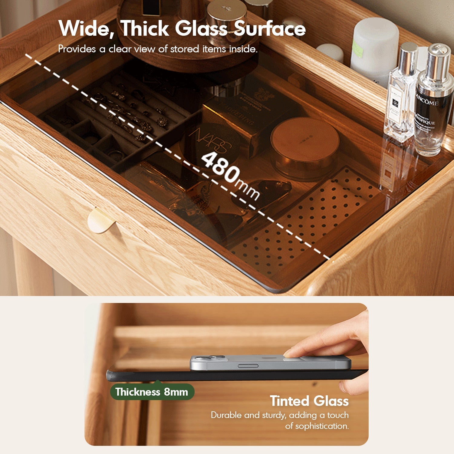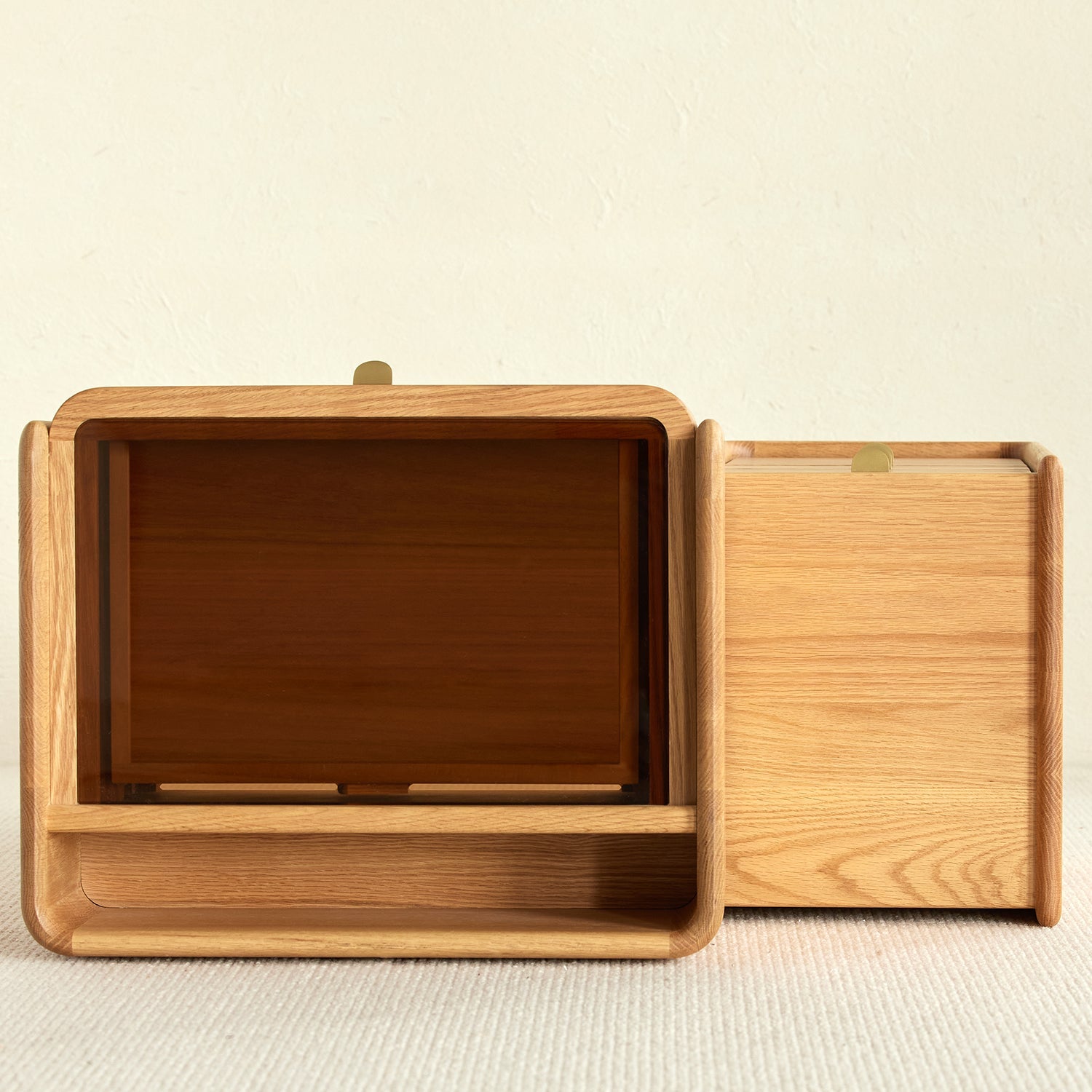 Scandinavian Oak Wood Dressing Table PURE combines ample storage, elegant tinted glass, and versatile design, perfect for stylish and functional spaces.