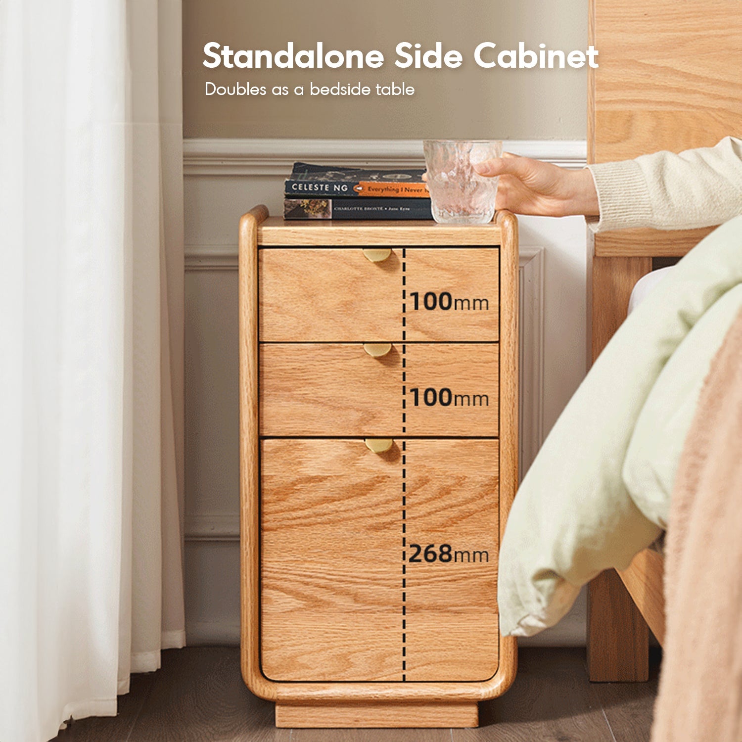 Serves as a standalone side cabinet or bedside table, offering versatile usage for bedroom or living spaces.