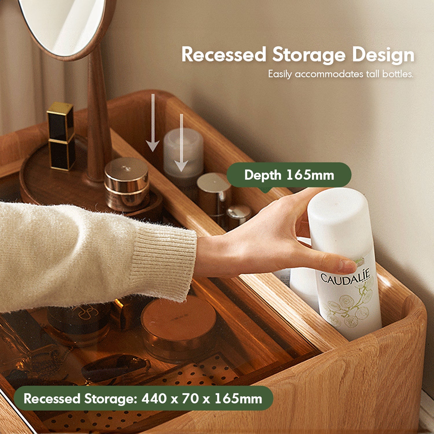 Features deep and shallow drawers and a recessed storage design, ideal for organizing various items, including tall bottles.