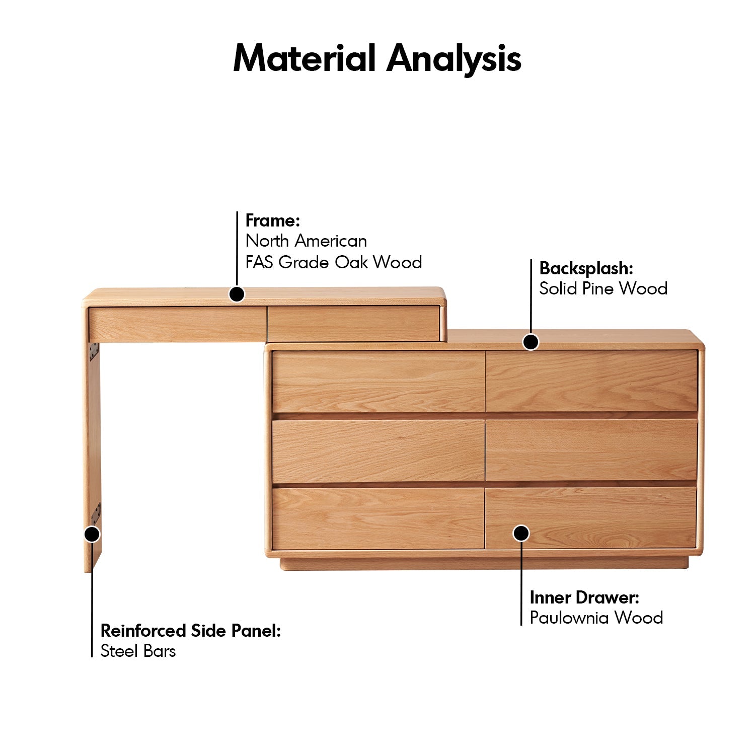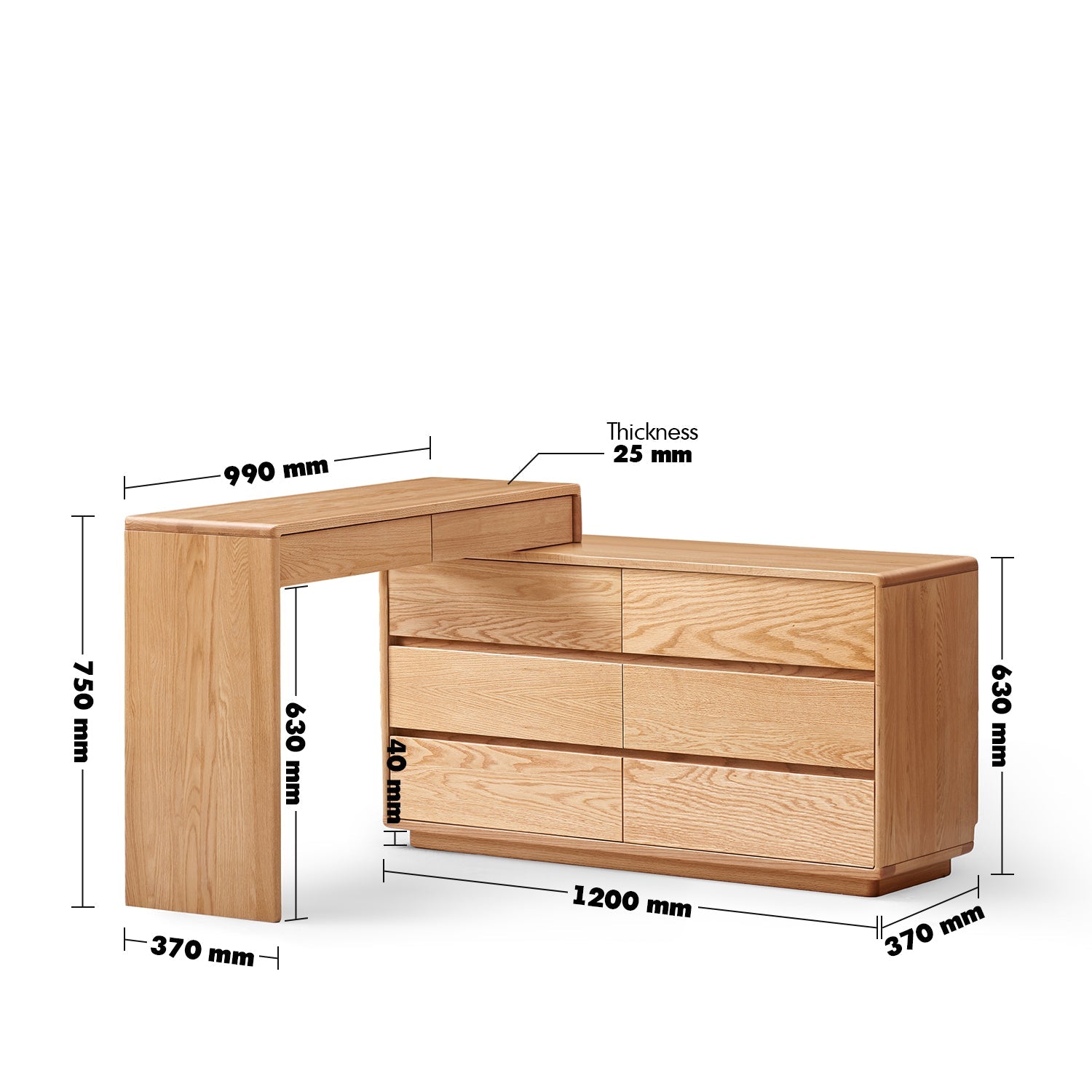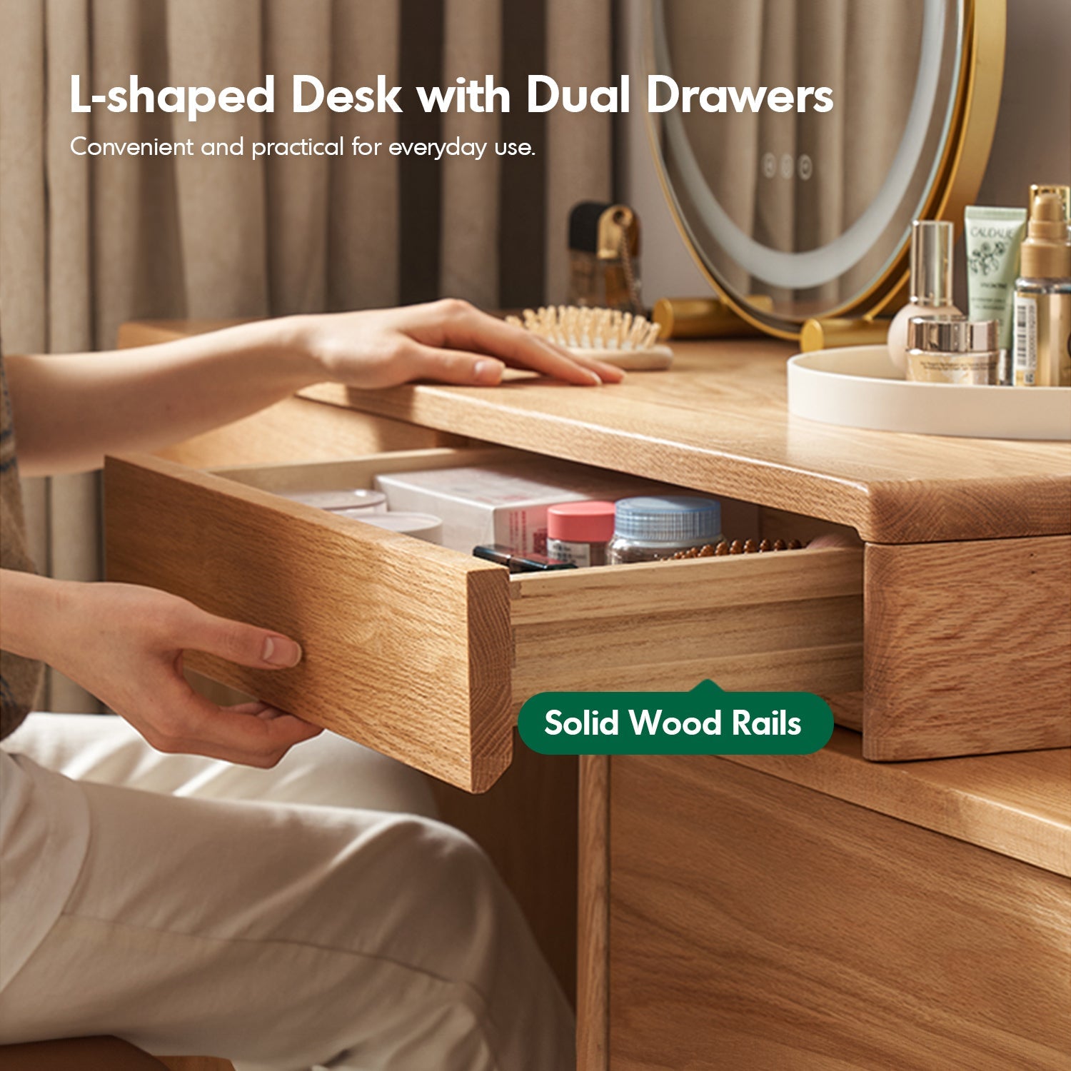 Scandinavian Oak Wood Dressing Table BLEND combines an L-shaped desk, spacious storage, and durable design, perfect for stylish and functional spaces.