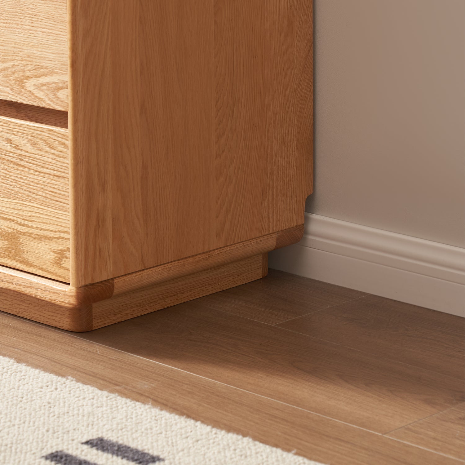 The drawer cabinet includes skirting line clearance, ensuring a seamless and polished placement against the wall. |