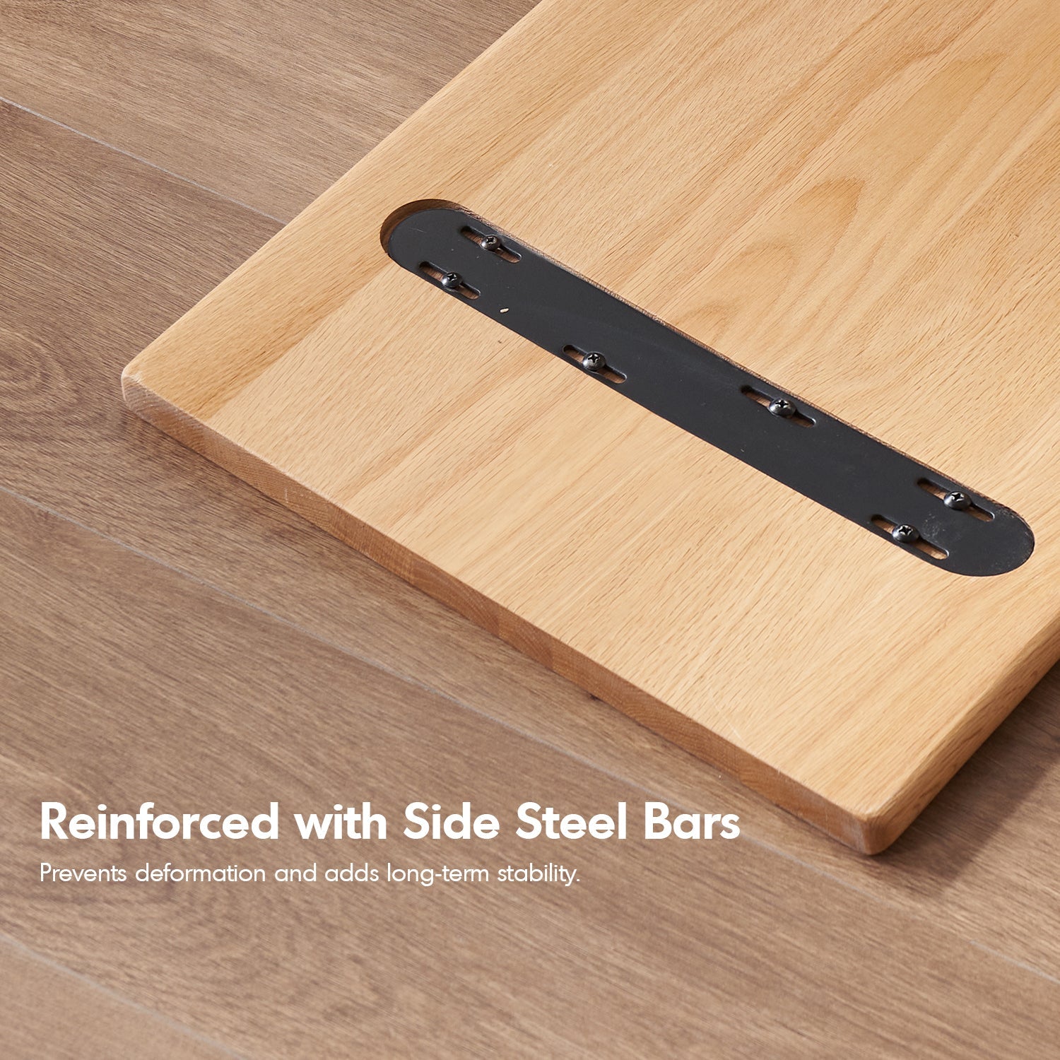 The thick desk surface, reinforced with side steel bars, offers superior durability and long-term stability. |