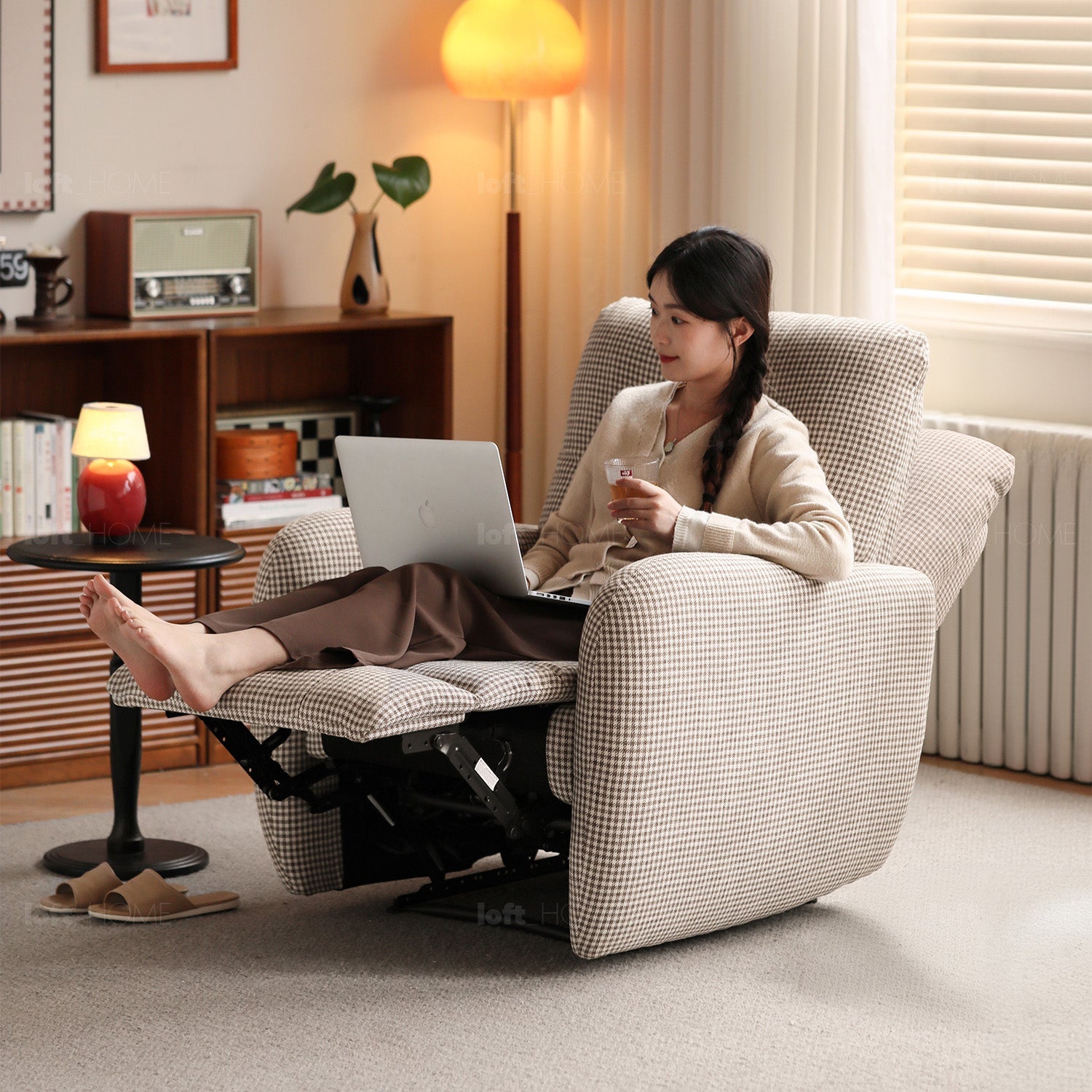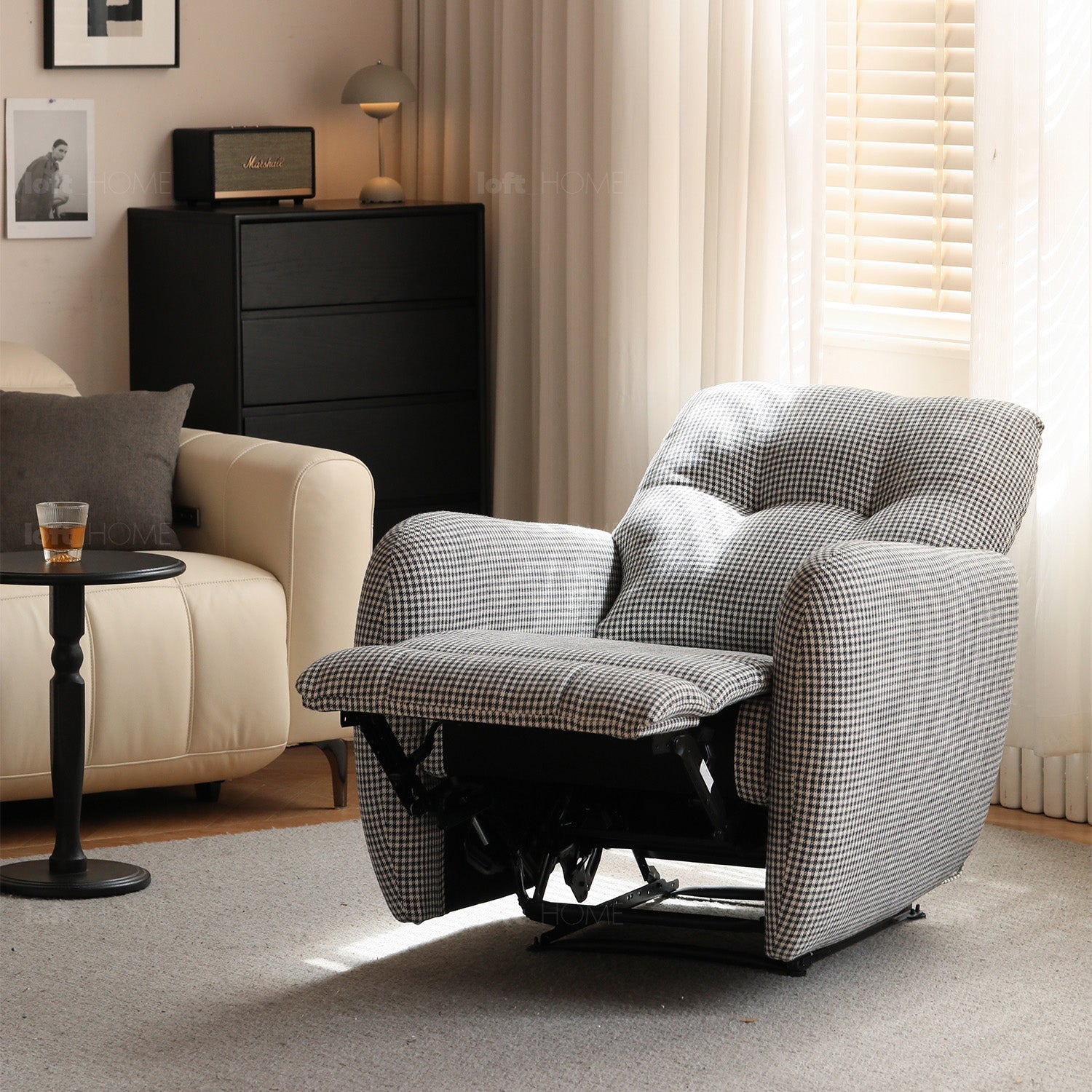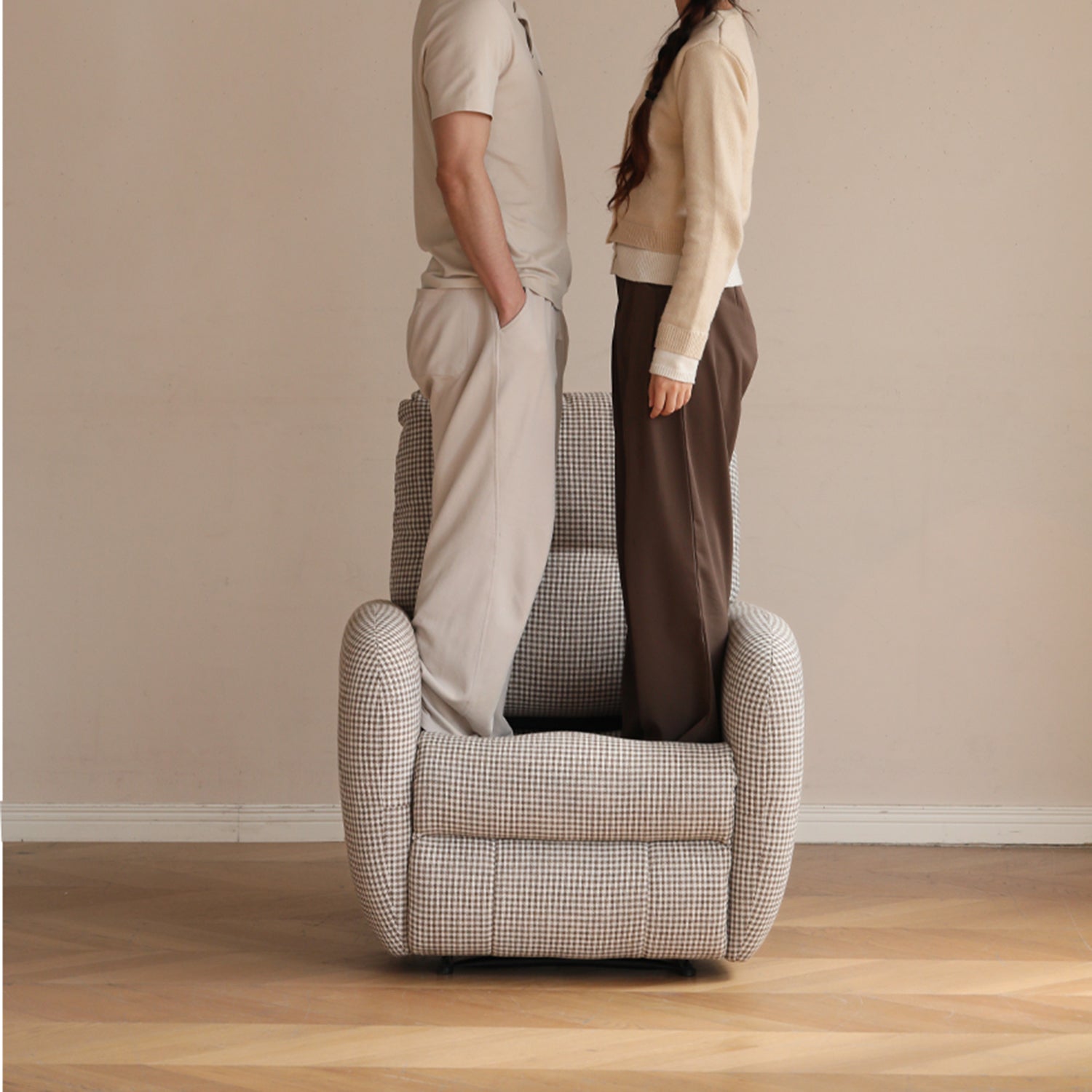 Cream Cotton Fabric Recliner 1 Seater Sofa LIBERTY recliner features vintage houndstooth fabric, ergonomic support zones, high-density foam, and a compact frame__erfect for small yet stylish living.