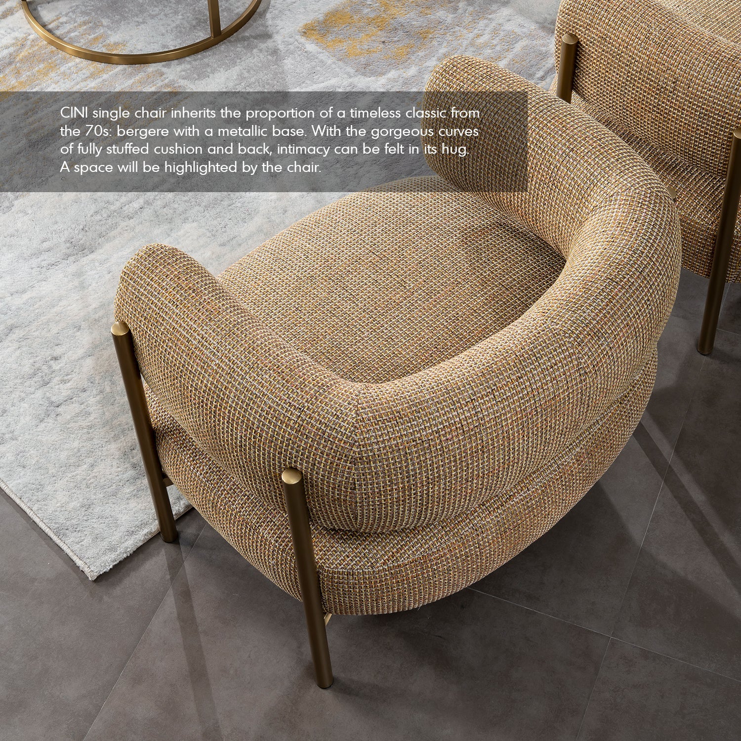 The Modern Mixed Weave Fabric 1 Seater Sofa CINI effortlessly blends style and comfort. With its gold stainless steel frame, it adds an opulent touch to any space. The medium to soft high-density foam and fiber filling ensures a plush seating experience. The mixed weave fabric cover in warm brown tone pairs elegantly with the gold accents, creating a sophisticated focal point for your interiors.