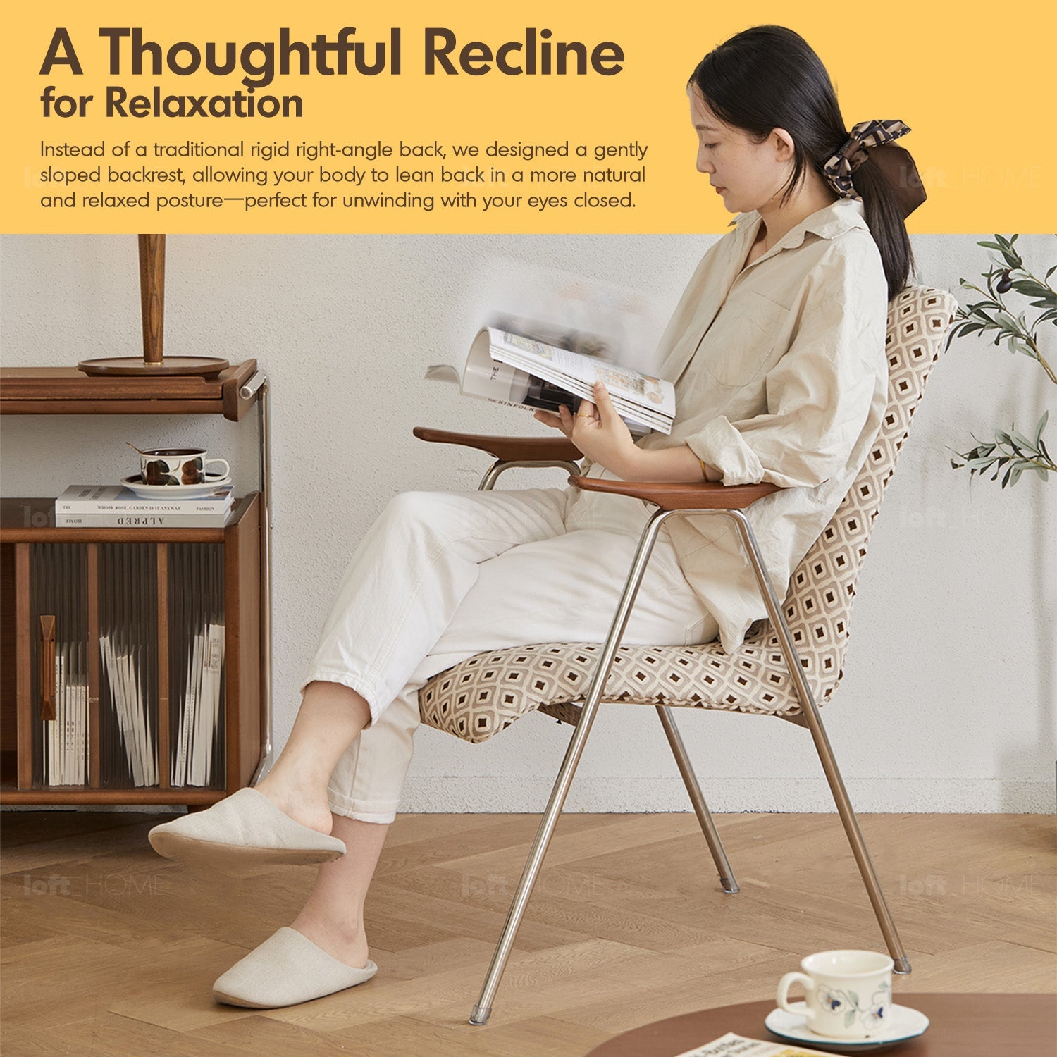 A sloped backrest, contoured seat, and smooth armrests provide a naturally relaxed posture. |