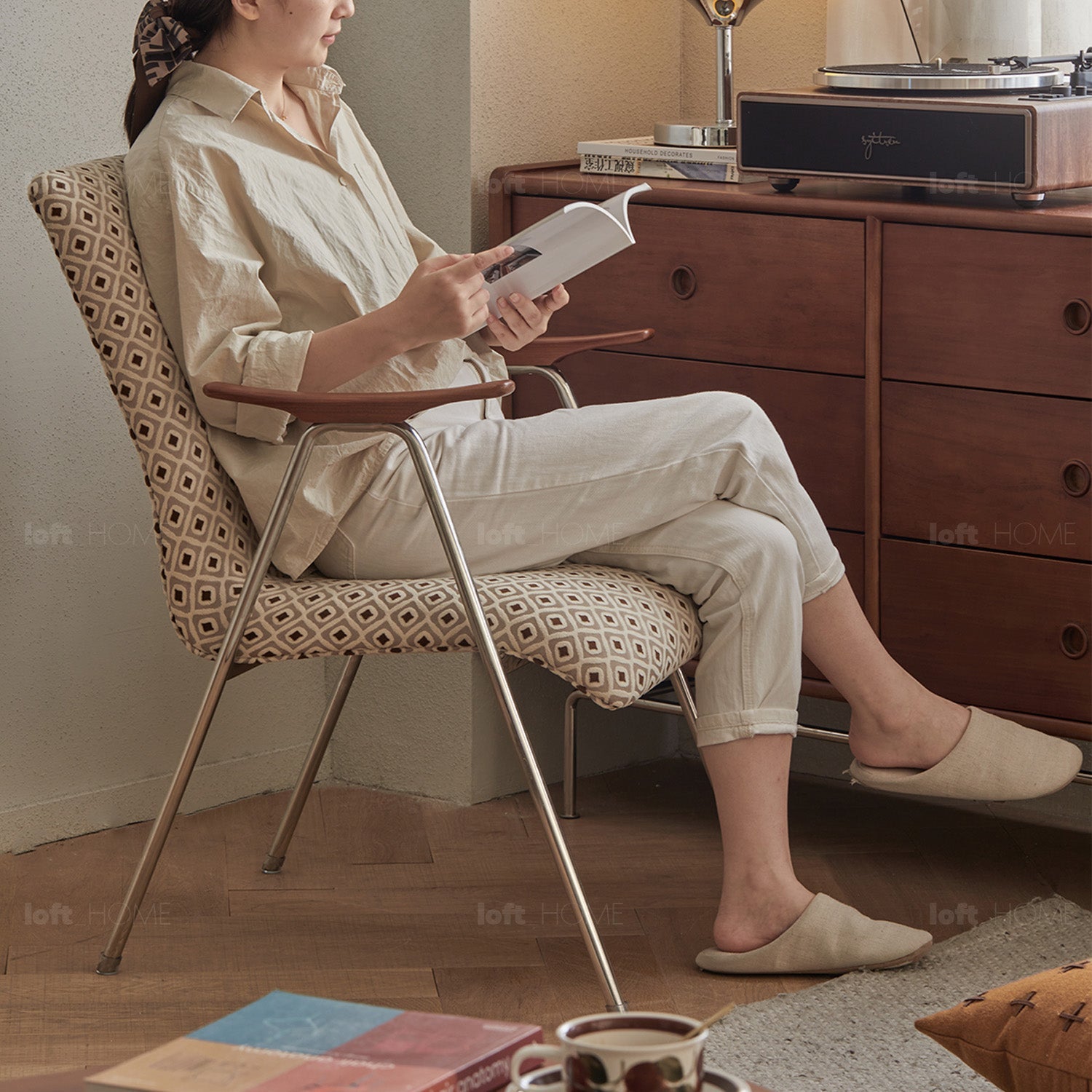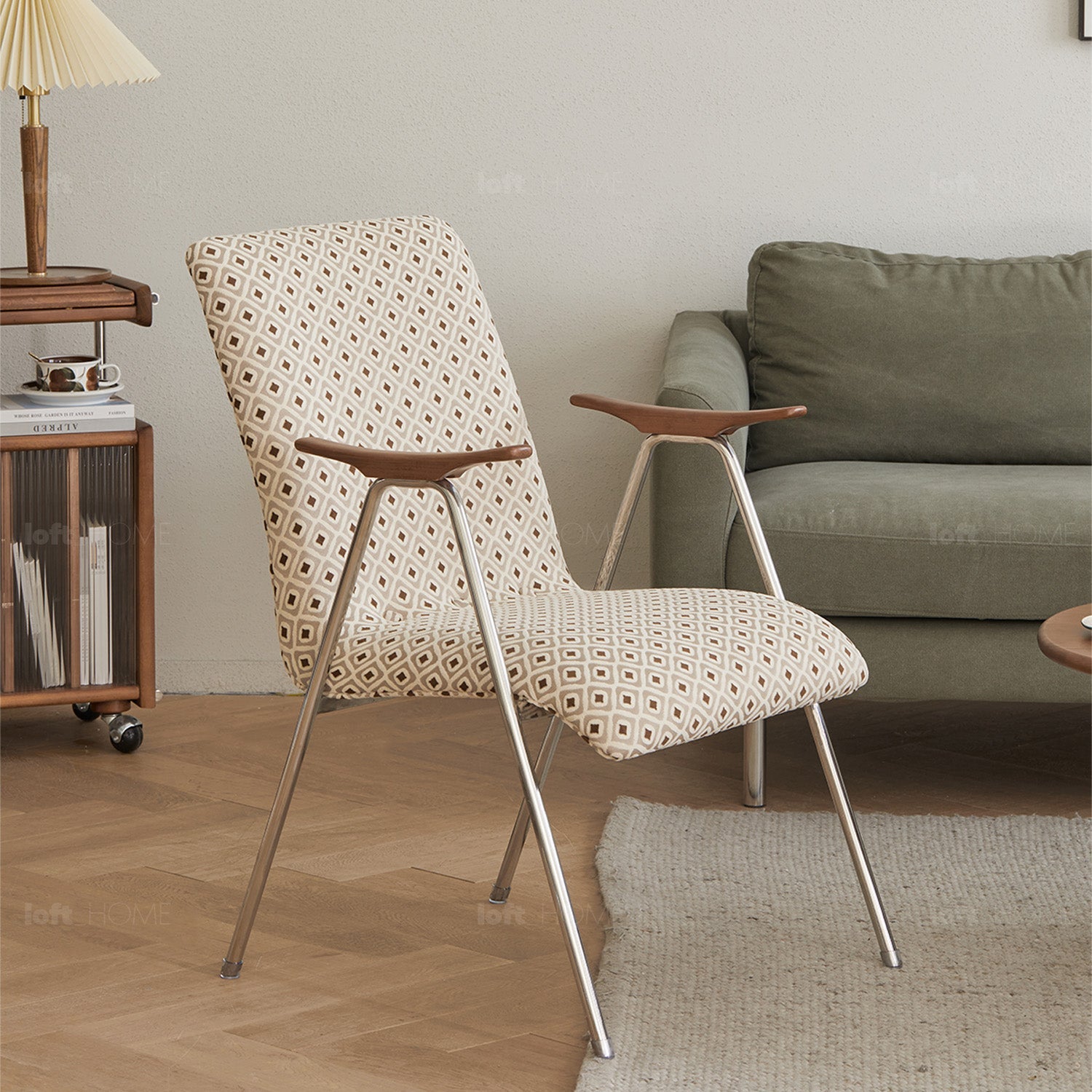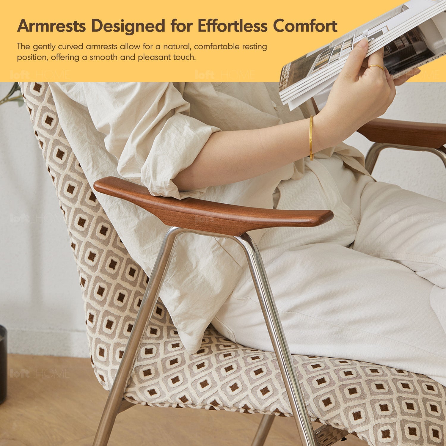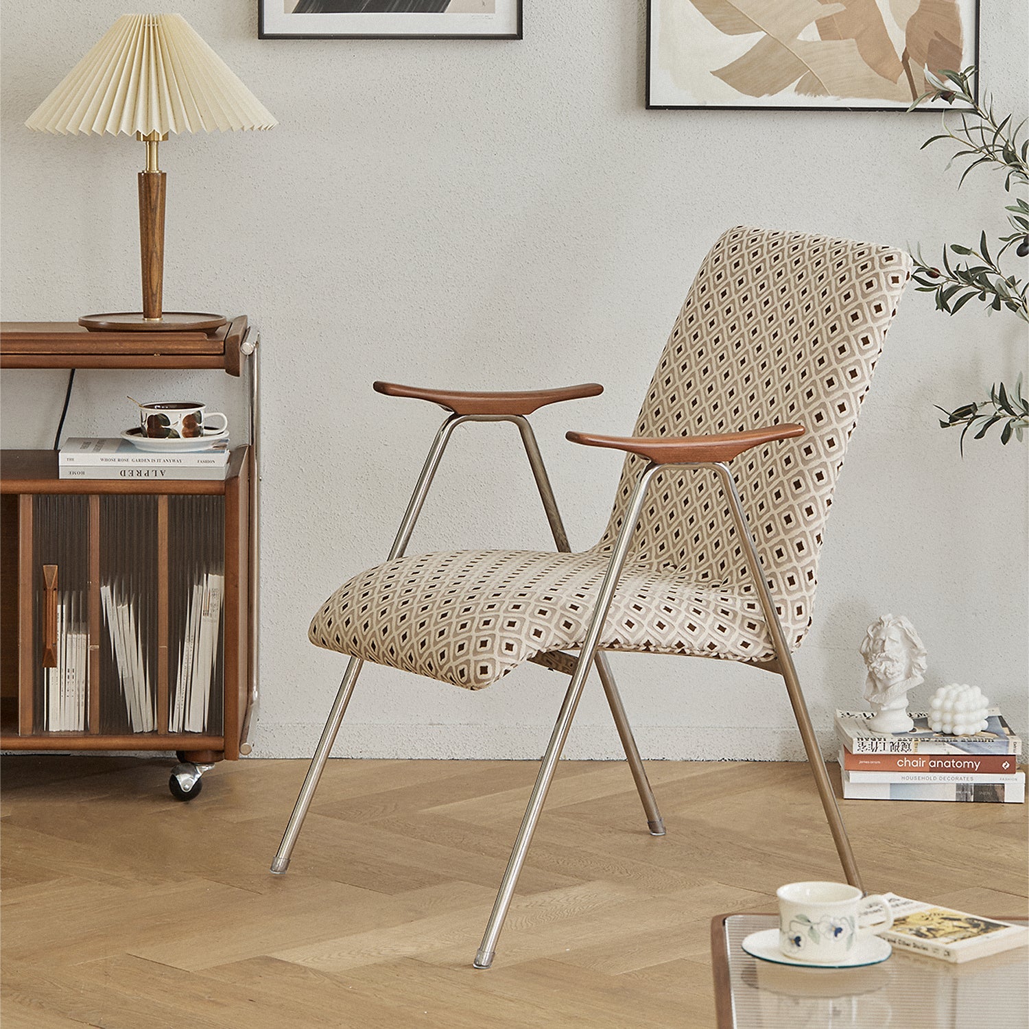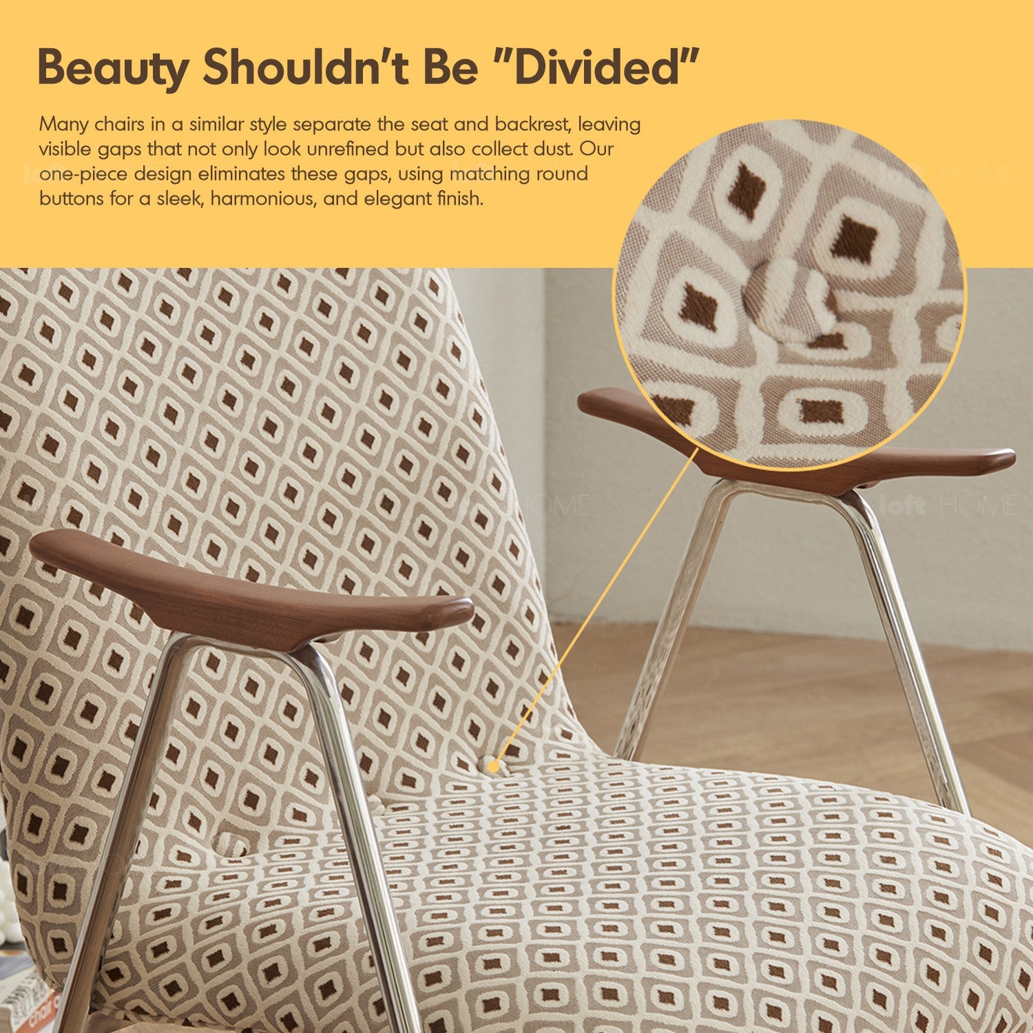 A seamless blend of fabric, metal, and wood, featuring clean lines and striking aesthetics. |