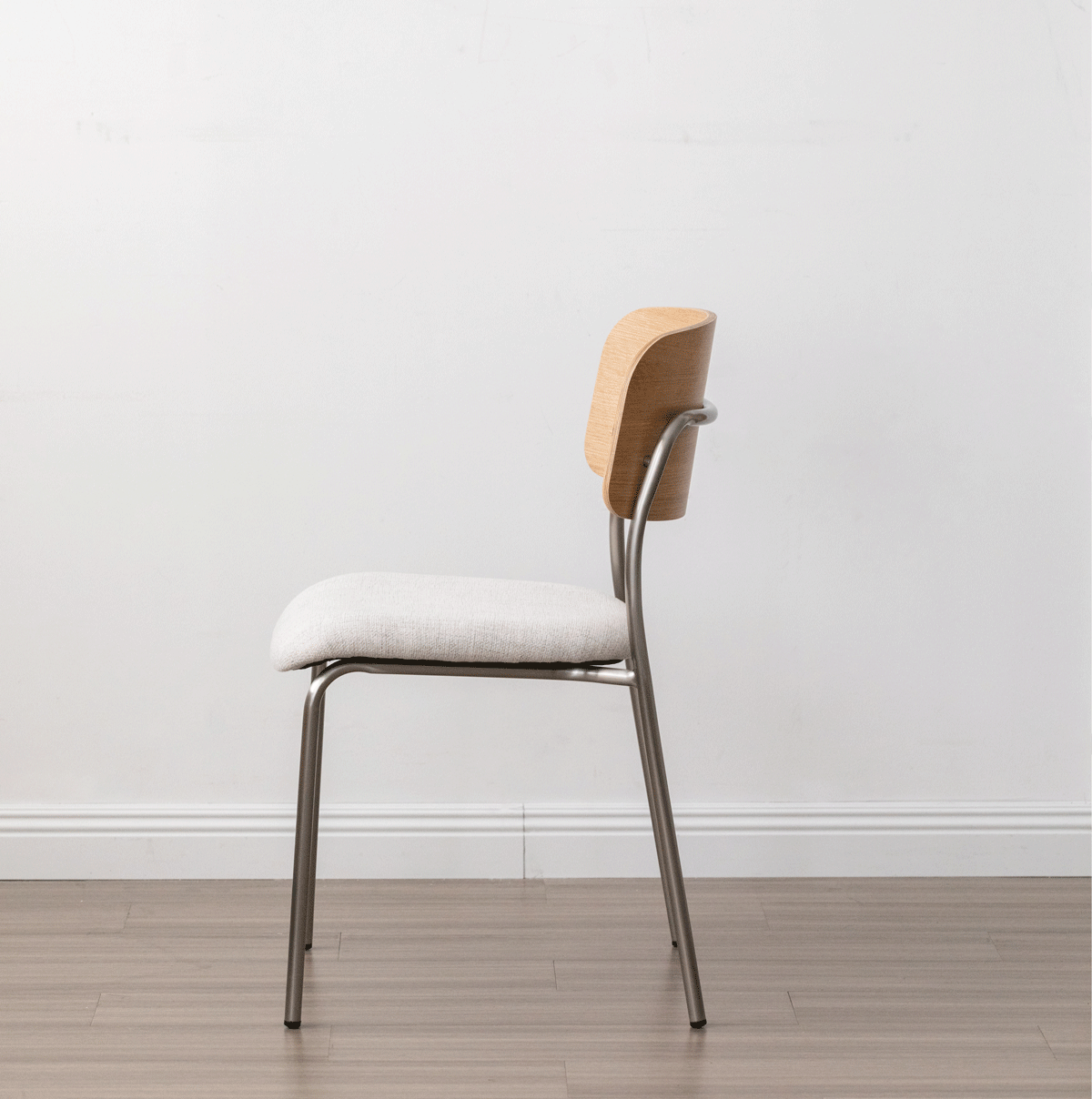Minimalist Ash Wood Veneer Cotton Fabric Dining Chair AERI offers ergonomic comfort, soft fabric seating, and stable stainless steel support for modern dining spaces.