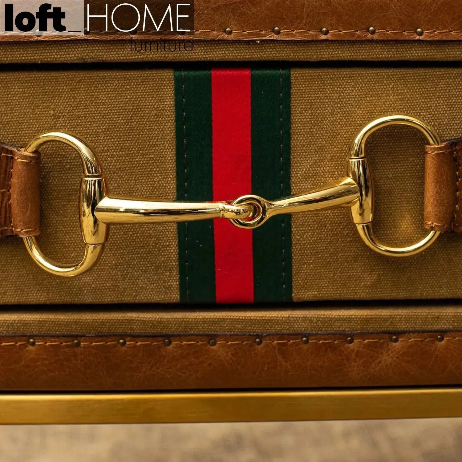 | Material: | Foliage canvas surface with grain genuine leather corner, golden electric plating stainless steel base, fabric belts in Green and Red and coal canvas drawer internal cover. |