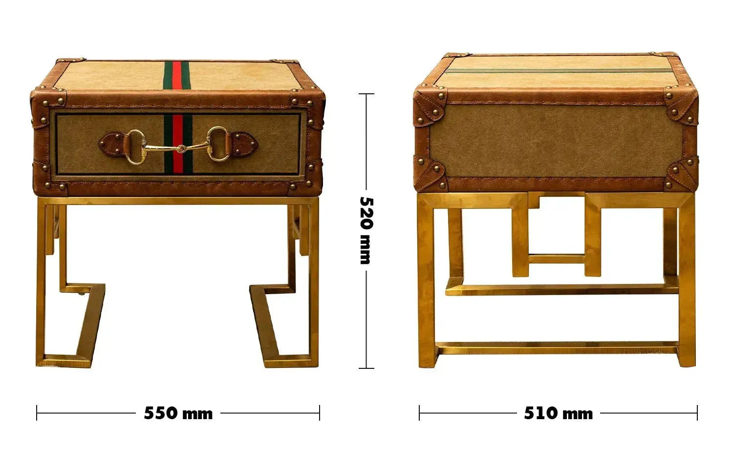 This table has dimensions of L550 x W510 x H520 mm and comes with a foliage canvas surface complete with genuine leather corners, a golden electric-plated stainless steel base, fabric belts in colors of green and red, and a coal canvas drawer. Their mix of canvas, leather, stainless steel, and fabric belts takes decoration to a new level, leaving traditional styles behind.