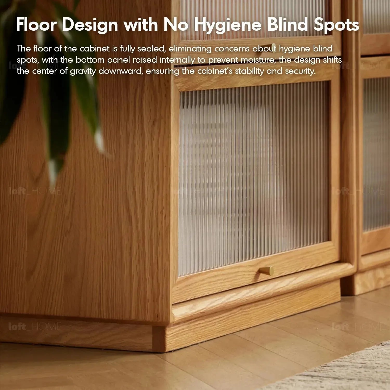 The cabinet features fluted glass panels that offer a blend of privacy and aesthetic appeal, diffusing light beautifully while concealing the contents for a clean, streamlined look. |